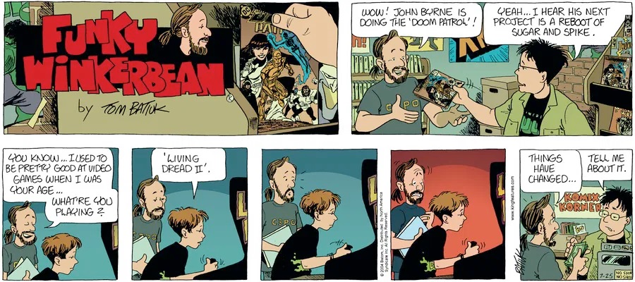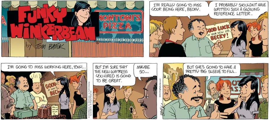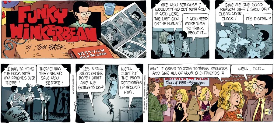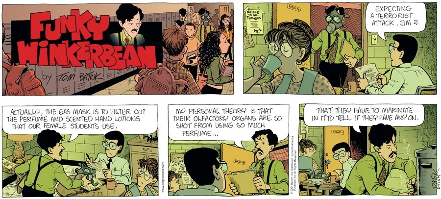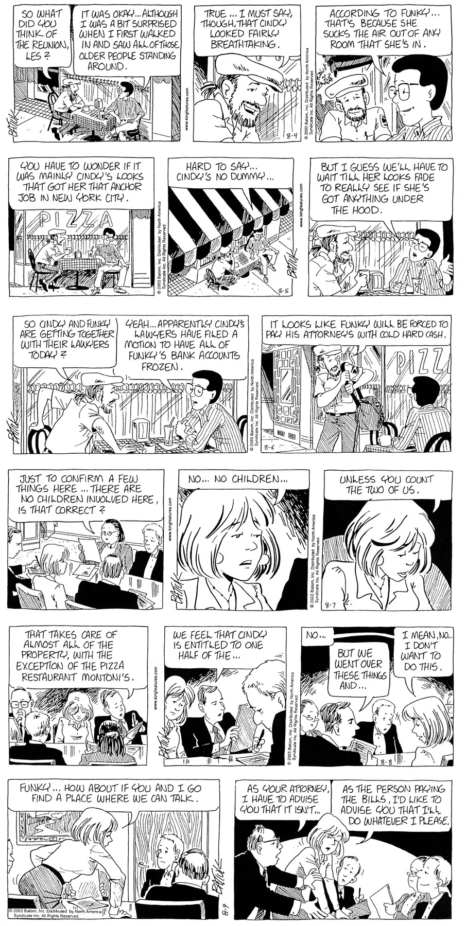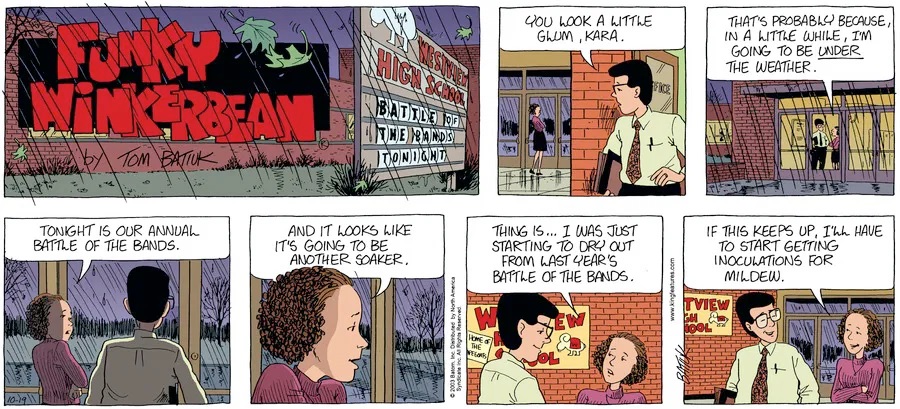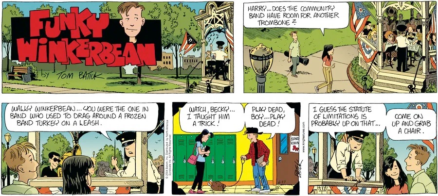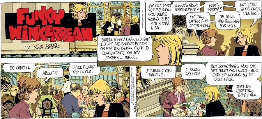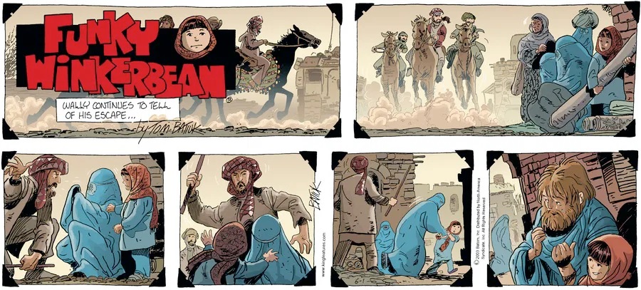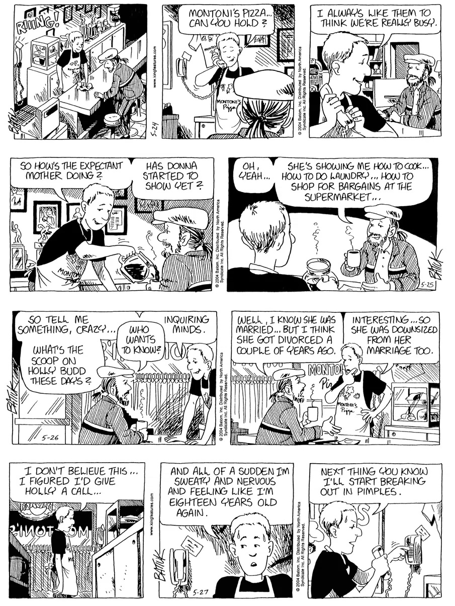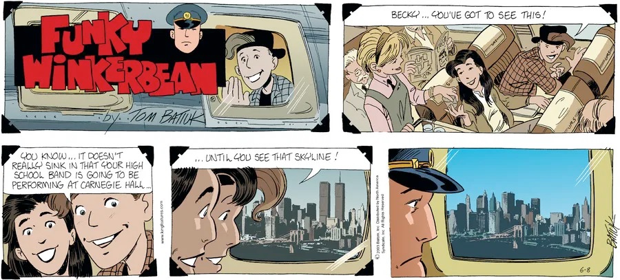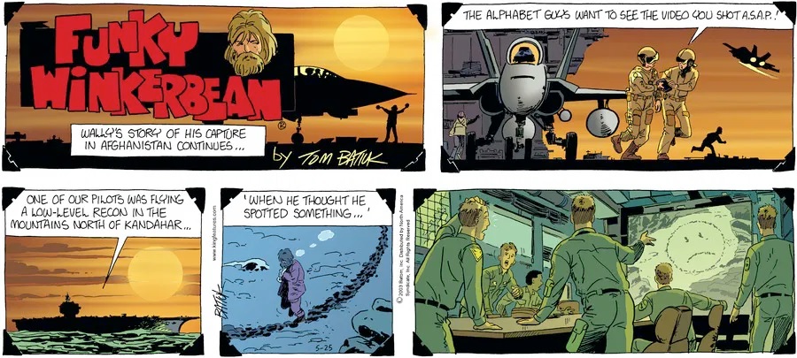 Last time, Funky went to rehab and AA to deal with his alcoholism and while initially things seemed to be turning around in his marriage, 9/11 happened. Cindy's reporting on it made her realize that New York was where she wanted to be and so she signed a new contract without telling Funky who was pissed when he found out. At that point, they were officially separated and all that was left was to work things out with the lawers... except that Cindy's side was demanding partial ownership of Montoni's. Things continued going swimmingly for both Winkerbean men when Wally was shipped off to Afghanistan and soon after, his helicopter was hit by a Stinger and he was listed as MIA.
