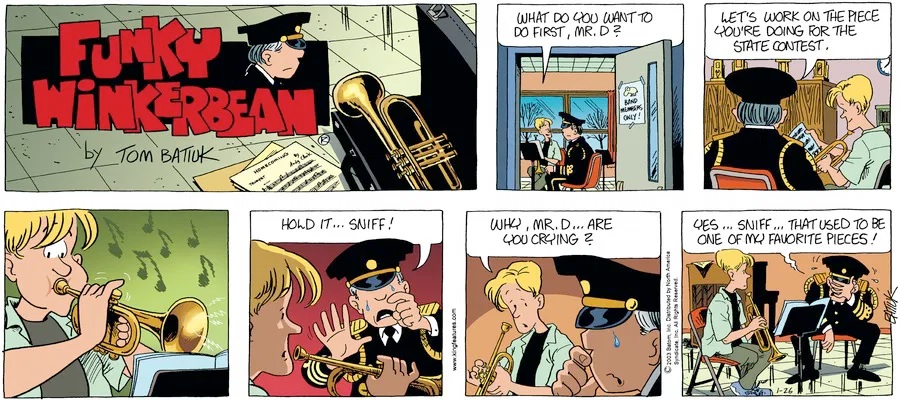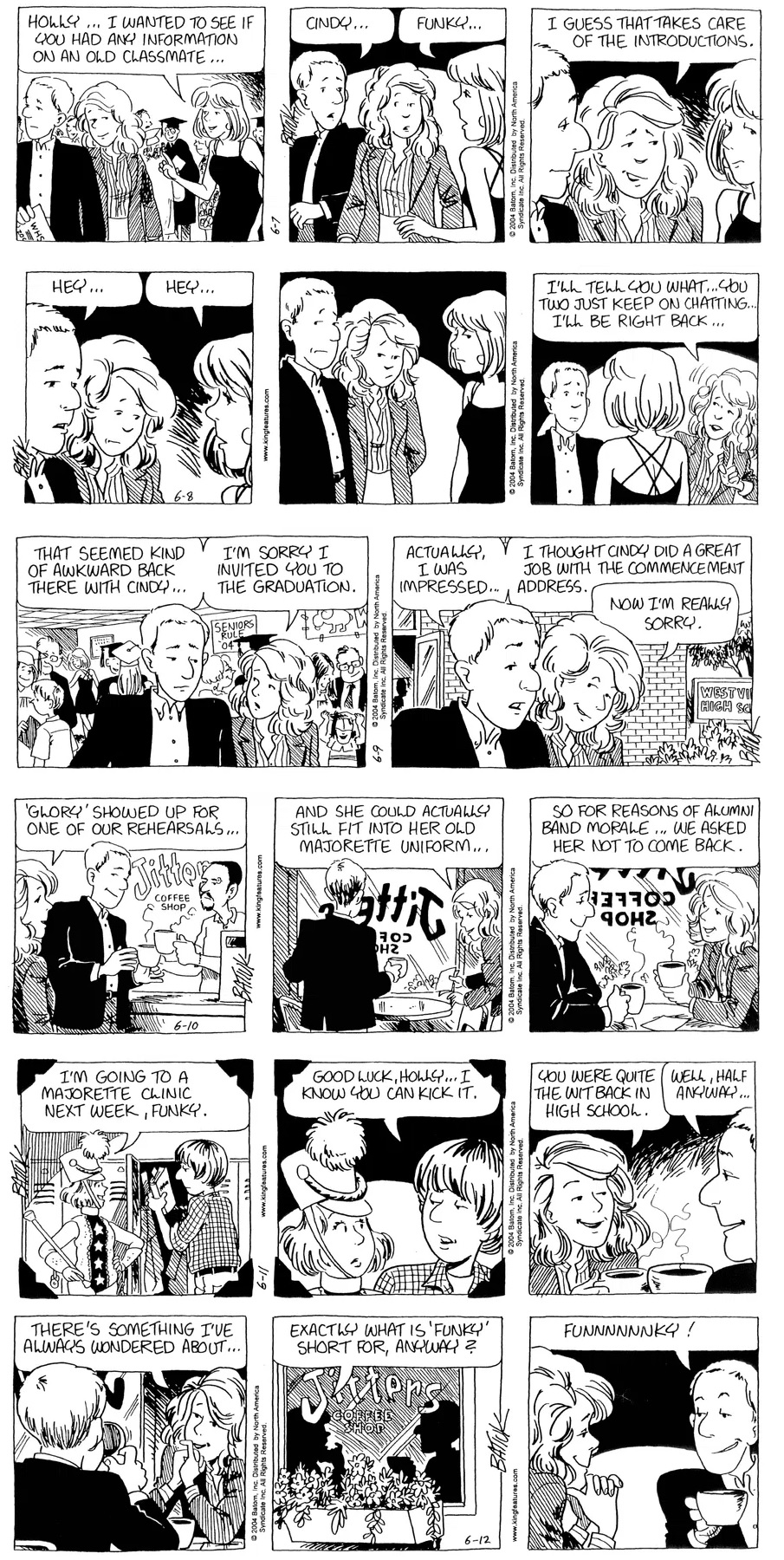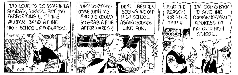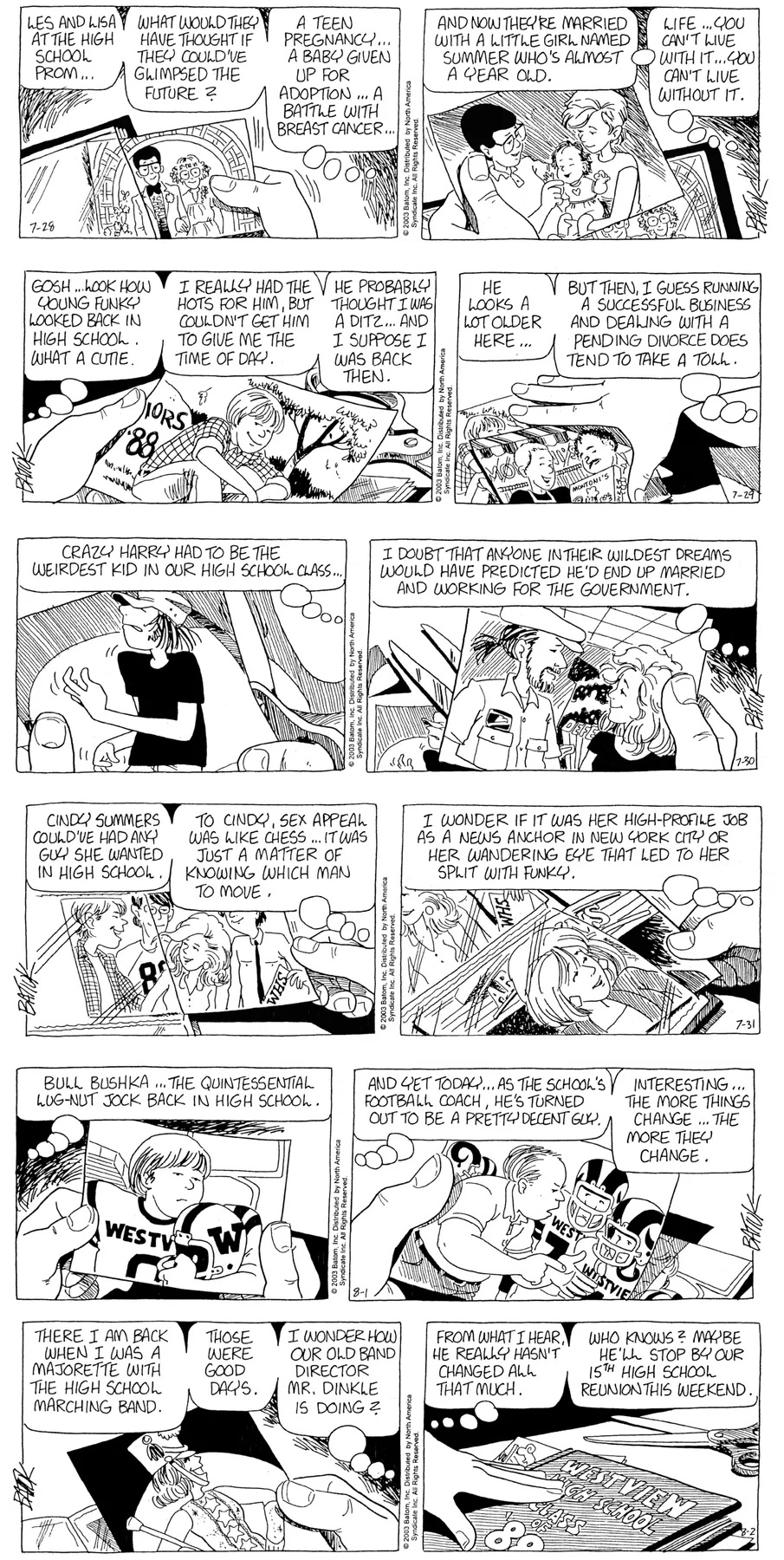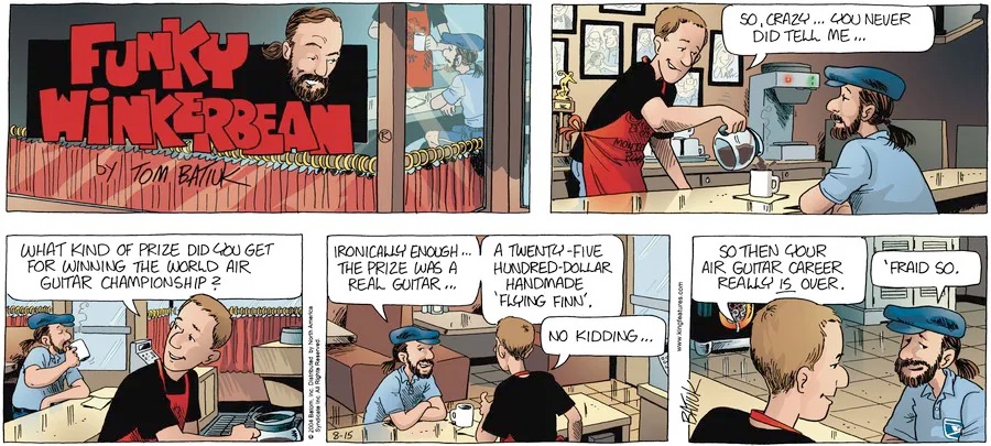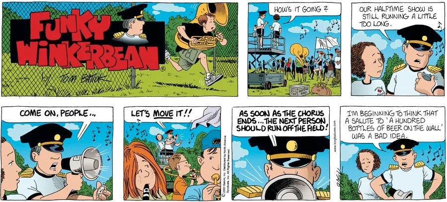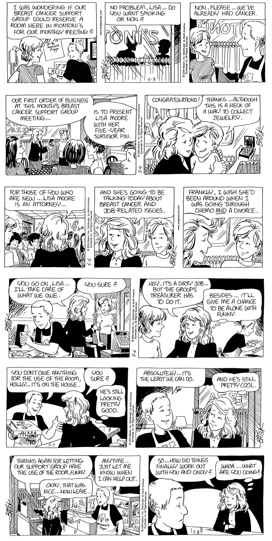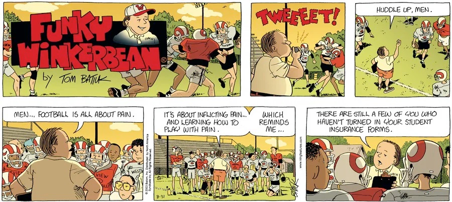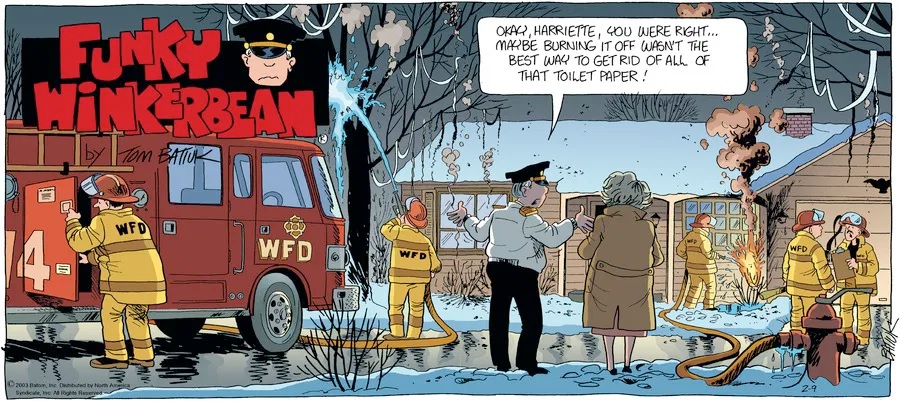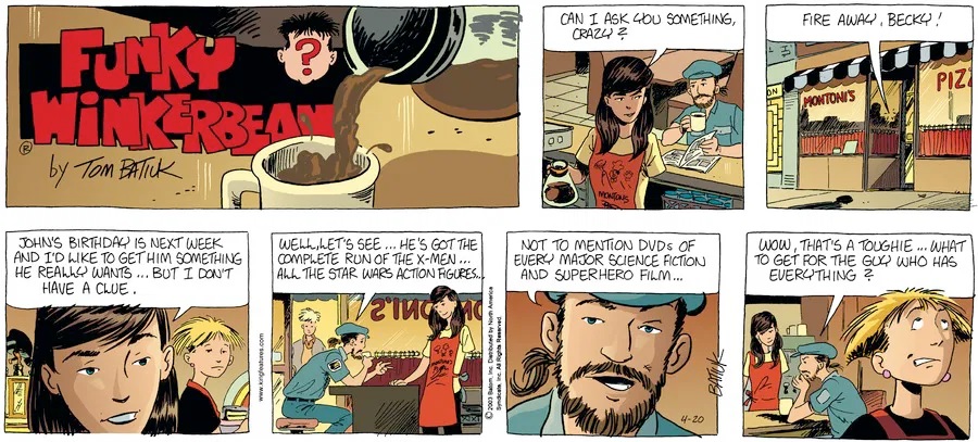Last time, Funky went to rehab and AA to deal with his alcoholism and while initially things seemed to be turning around in his marriage, 9/11 happened. Cindy's reporting on it made her realize that New York was where she wanted to be and so she signed a new contract without telling Funky who was pissed when he found out. At that point, they were officially separated and all that was left was to work things out with the lawers... except that Cindy's side was demanding partial ownership of Montoni's. Things continued going swimmingly for both Winkerbean men when Wally was shipped off to Afghanistan and soon after, his helicopter was hit by a Stinger and he was listed as MIA.
