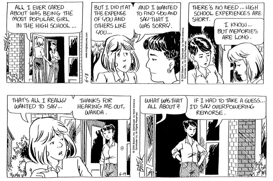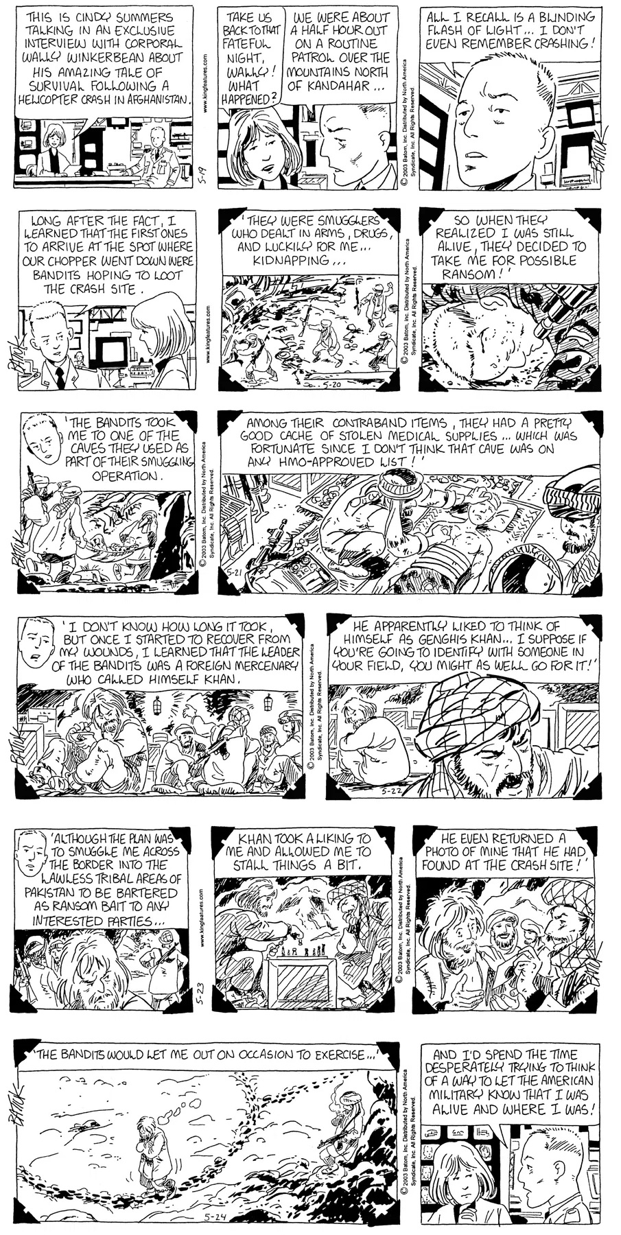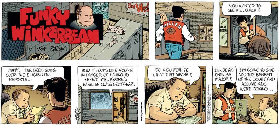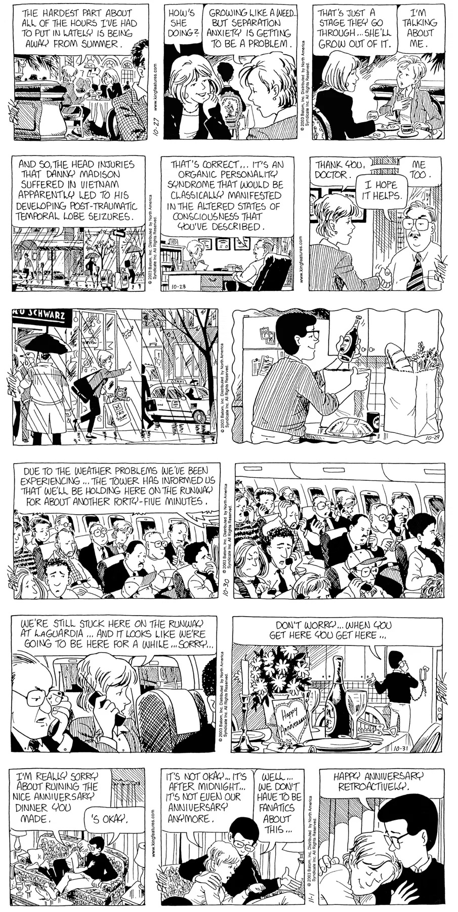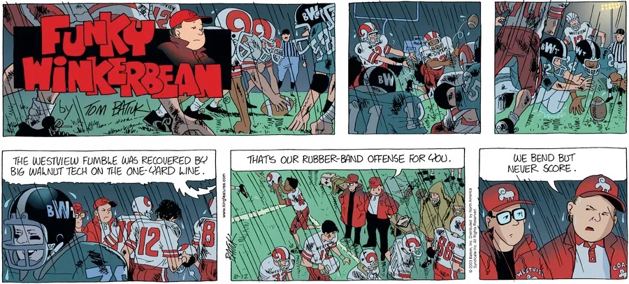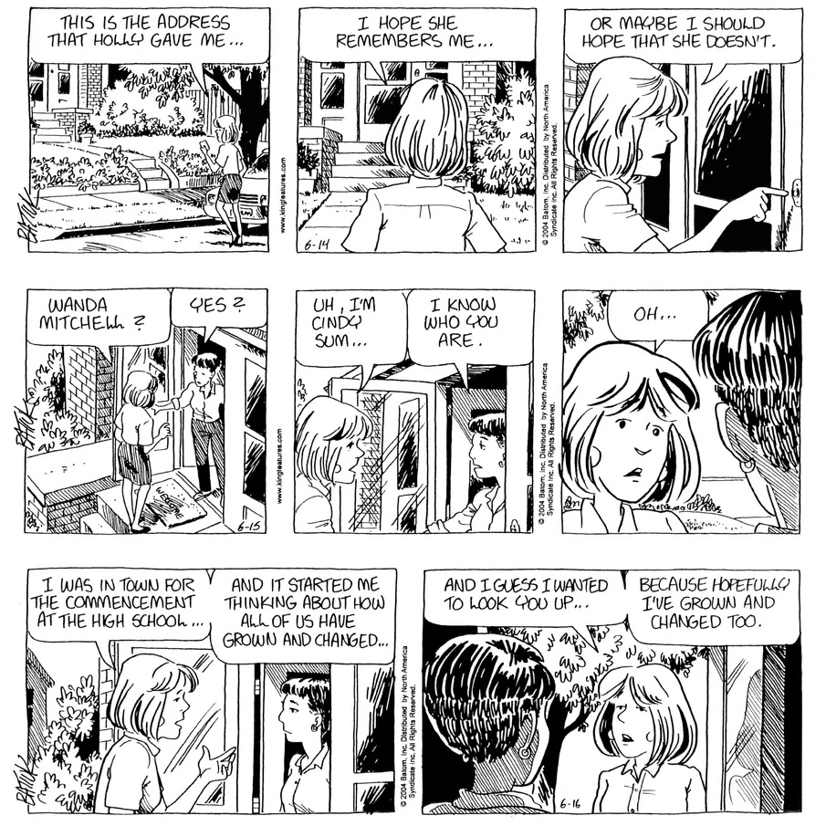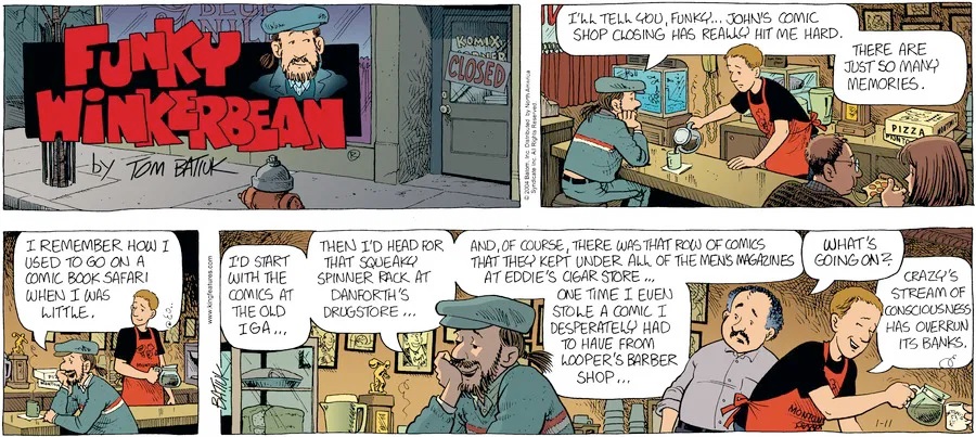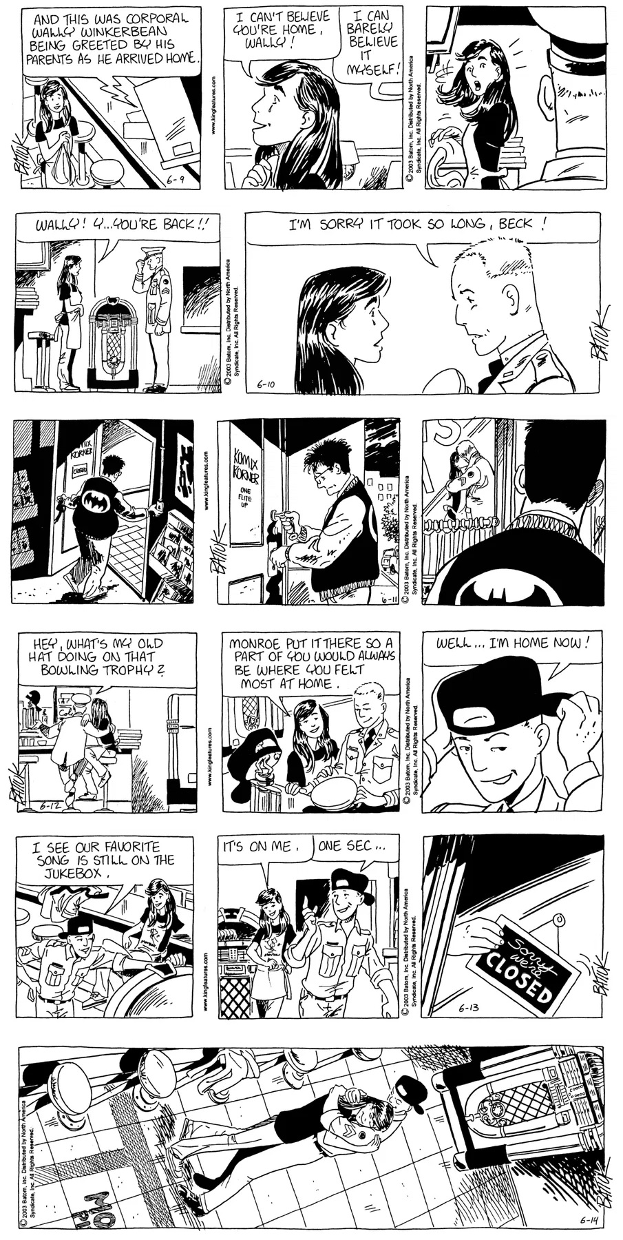 Last time, Funky went to rehab and AA to deal with his alcoholism and while initially things seemed to be turning around in his marriage, 9/11 happened. Cindy's reporting on it made her realize that New York was where she wanted to be and so she signed a new contract without telling Funky who was pissed when he found out. At that point, they were officially separated and all that was left was to work things out with the lawers... except that Cindy's side was demanding partial ownership of Montoni's. Things continued going swimmingly for both Winkerbean men when Wally was shipped off to Afghanistan and soon after, his helicopter was hit by a Stinger and he was listed as MIA.