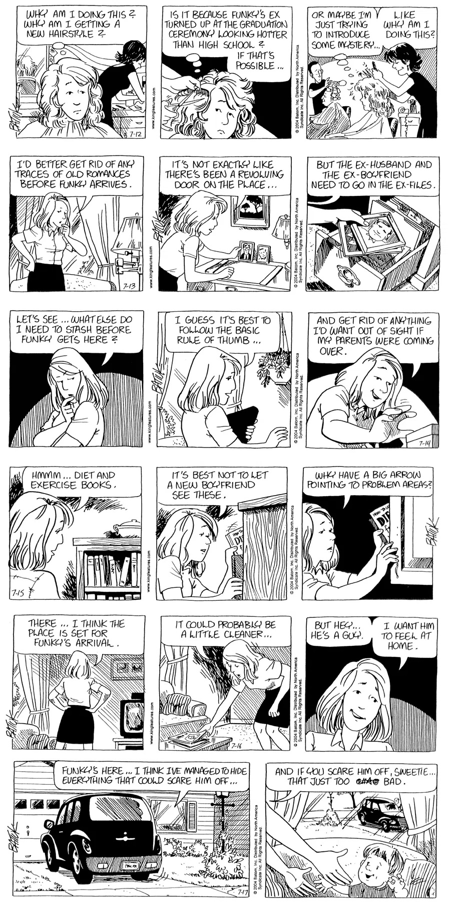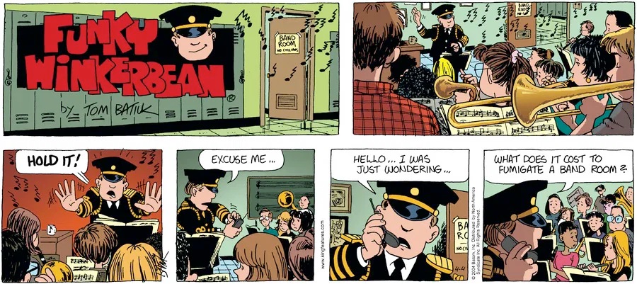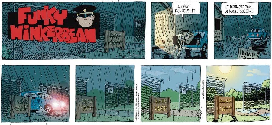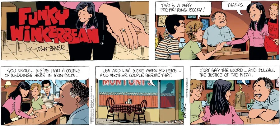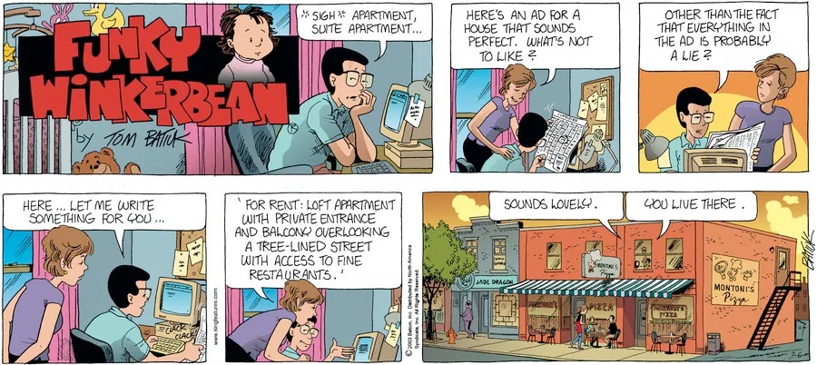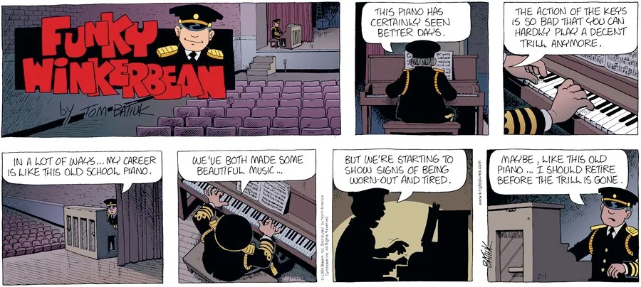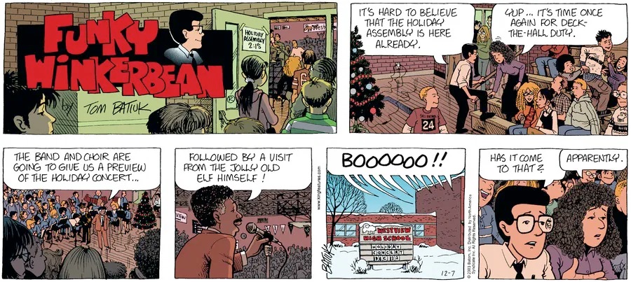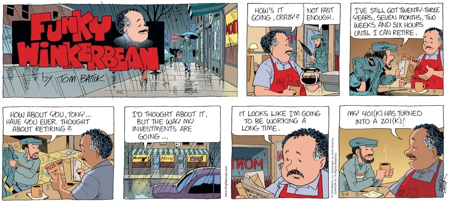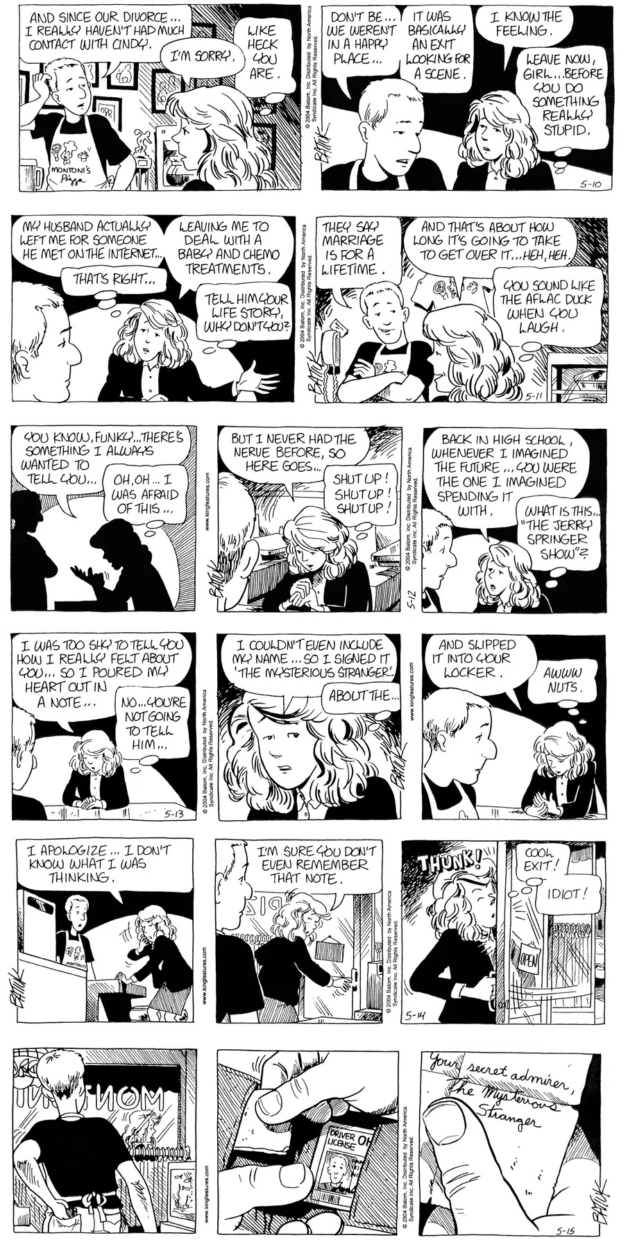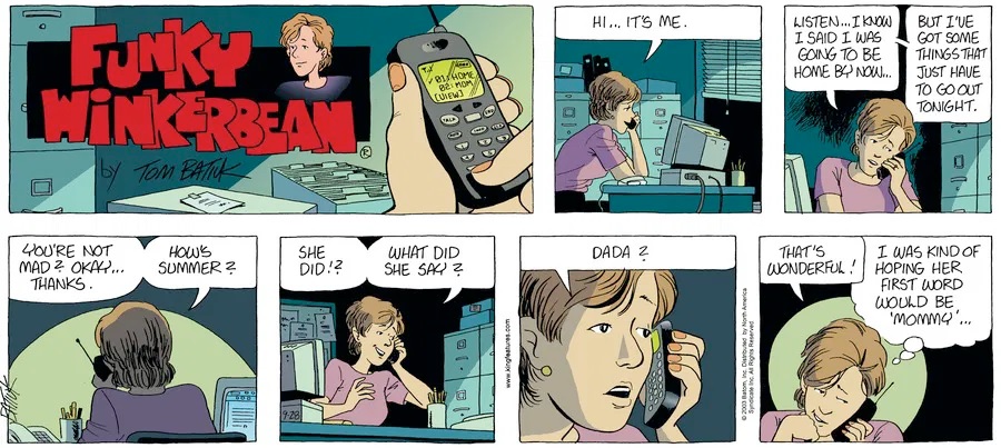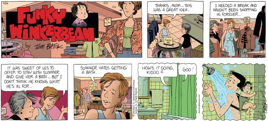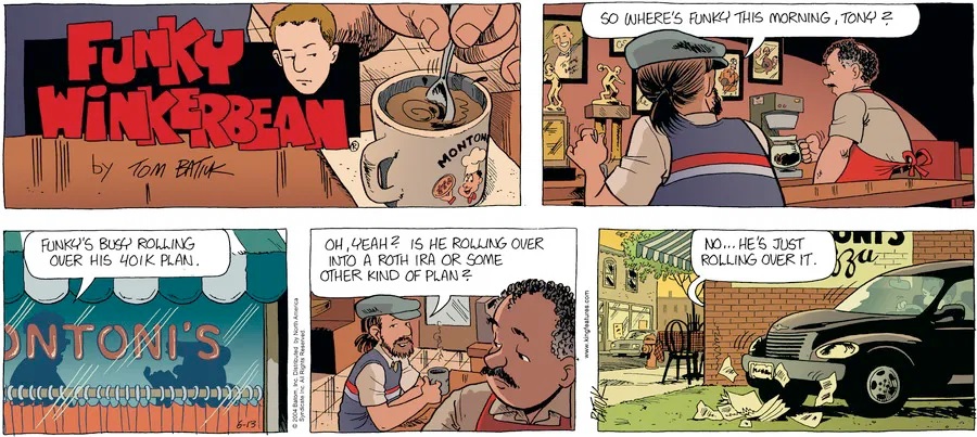 Last time, Funky went to rehab and AA to deal with his alcoholism and while initially things seemed to be turning around in his marriage, 9/11 happened. Cindy's reporting on it made her realize that New York was where she wanted to be and so she signed a new contract without telling Funky who was pissed when he found out. At that point, they were officially separated and all that was left was to work things out with the lawers... except that Cindy's side was demanding partial ownership of Montoni's. Things continued going swimmingly for both Winkerbean men when Wally was shipped off to Afghanistan and soon after, his helicopter was hit by a Stinger and he was listed as MIA.