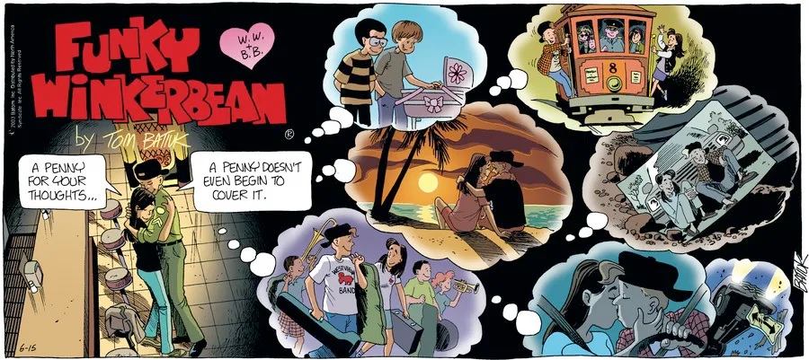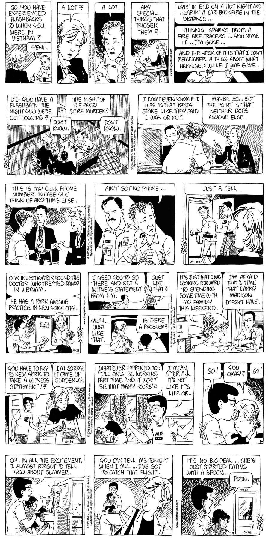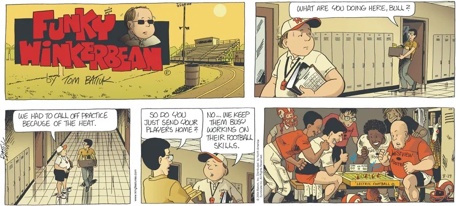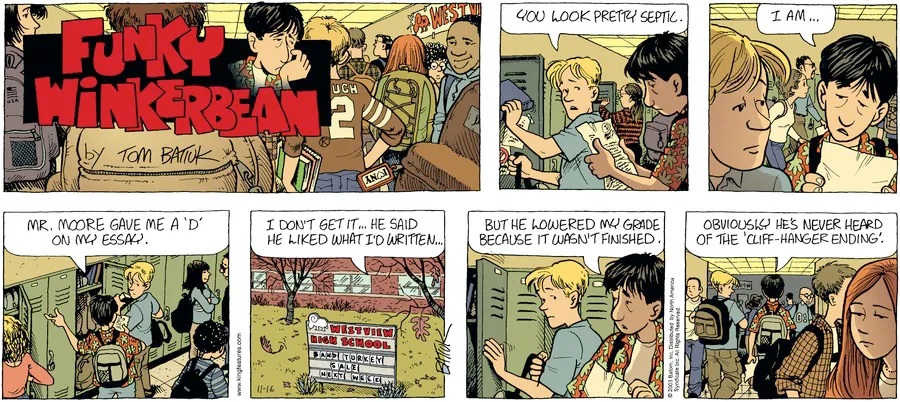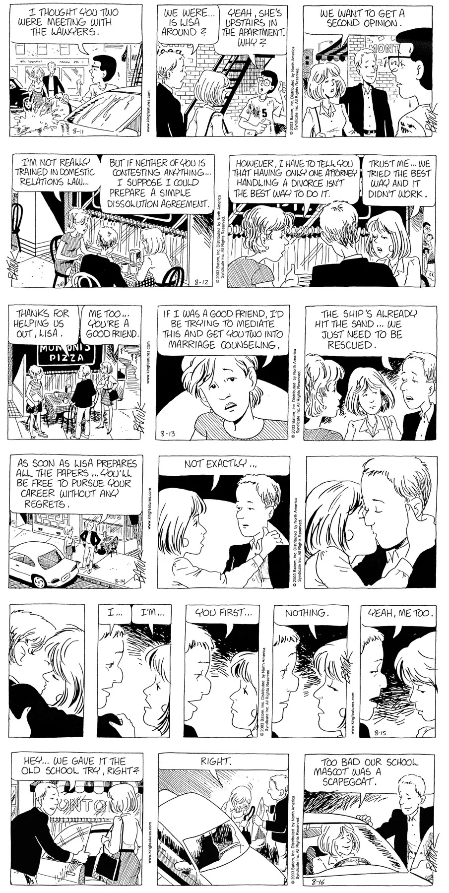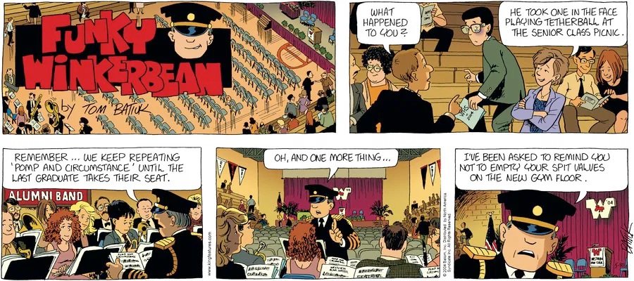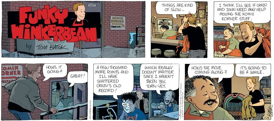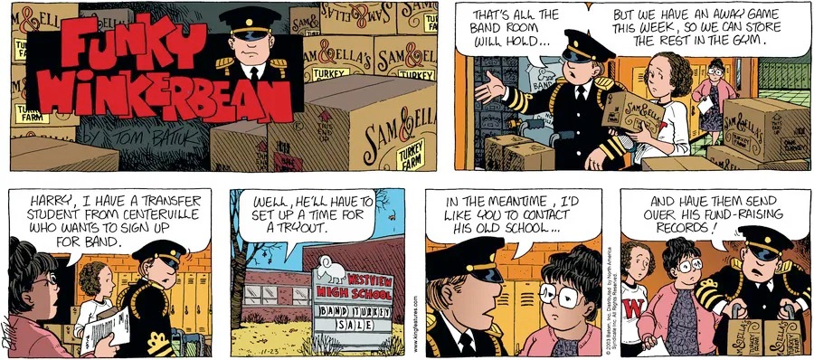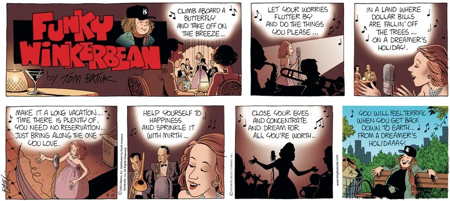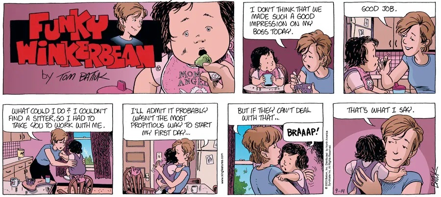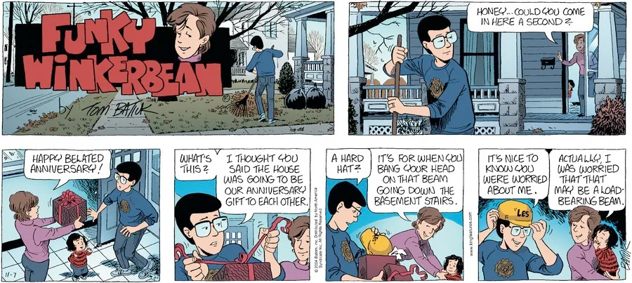 Last time, Funky went to rehab and AA to deal with his alcoholism and while initially things seemed to be turning around in his marriage, 9/11 happened. Cindy's reporting on it made her realize that New York was where she wanted to be and so she signed a new contract without telling Funky who was pissed when he found out. At that point, they were officially separated and all that was left was to work things out with the lawers... except that Cindy's side was demanding partial ownership of Montoni's. Things continued going swimmingly for both Winkerbean men when Wally was shipped off to Afghanistan and soon after, his helicopter was hit by a Stinger and he was listed as MIA.