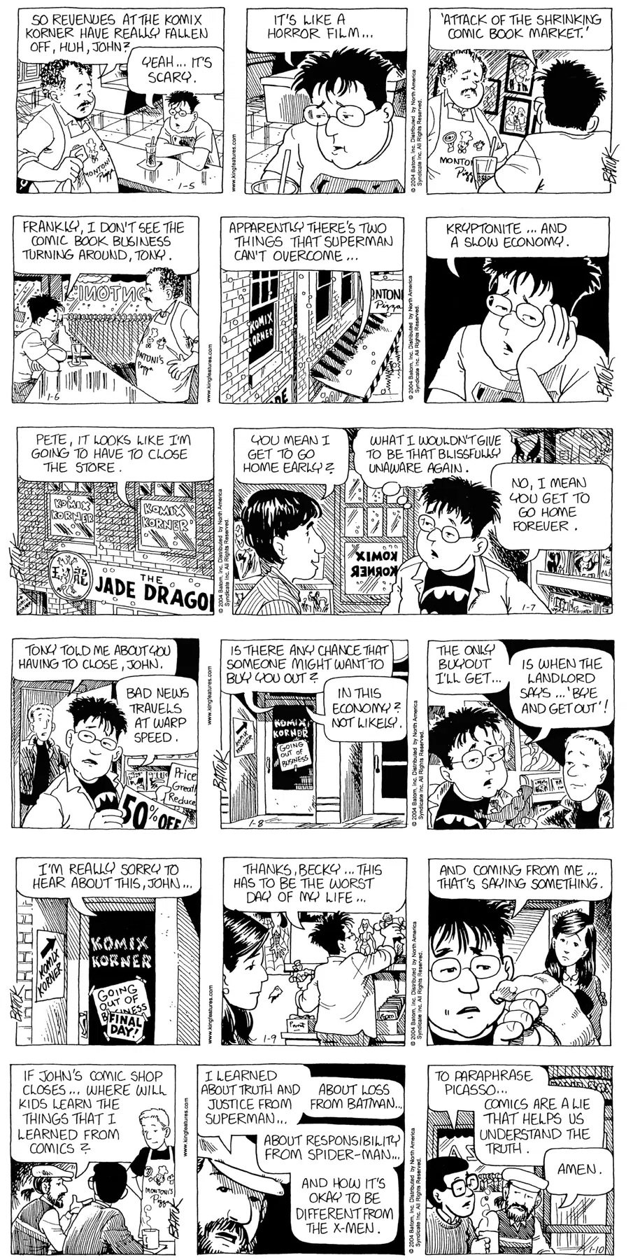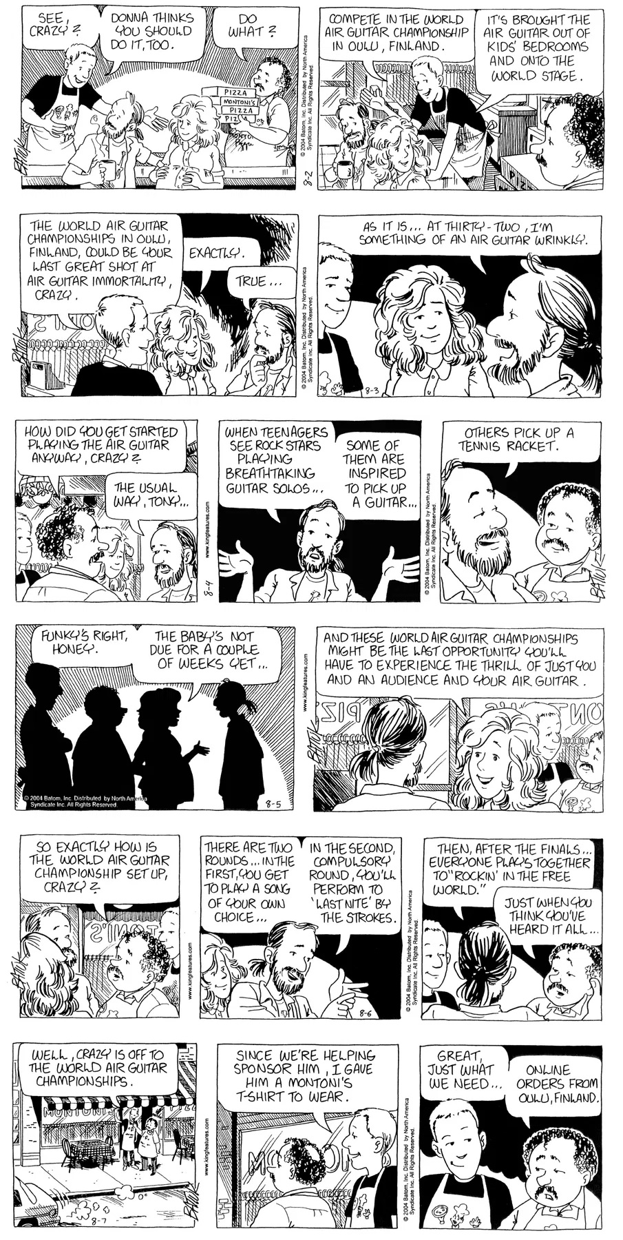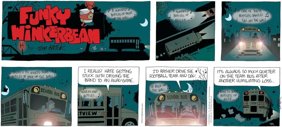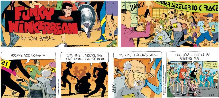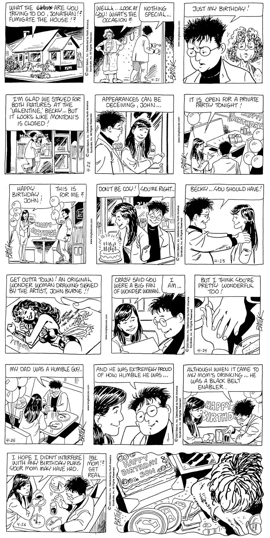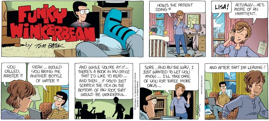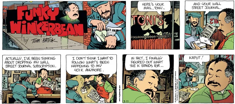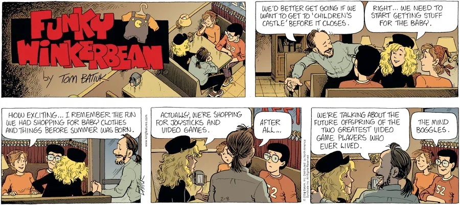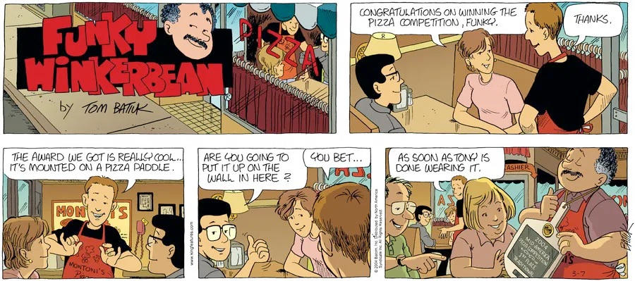 Last time, Funky went to rehab and AA to deal with his alcoholism and while initially things seemed to be turning around in his marriage, 9/11 happened. Cindy's reporting on it made her realize that New York was where she wanted to be and so she signed a new contract without telling Funky who was pissed when he found out. At that point, they were officially separated and all that was left was to work things out with the lawers... except that Cindy's side was demanding partial ownership of Montoni's. Things continued going swimmingly for both Winkerbean men when Wally was shipped off to Afghanistan and soon after, his helicopter was hit by a Stinger and he was listed as MIA.