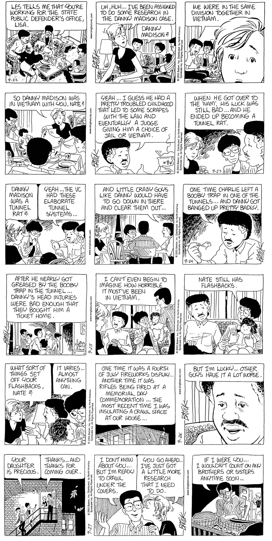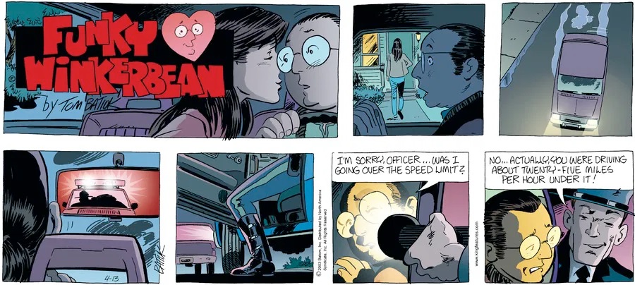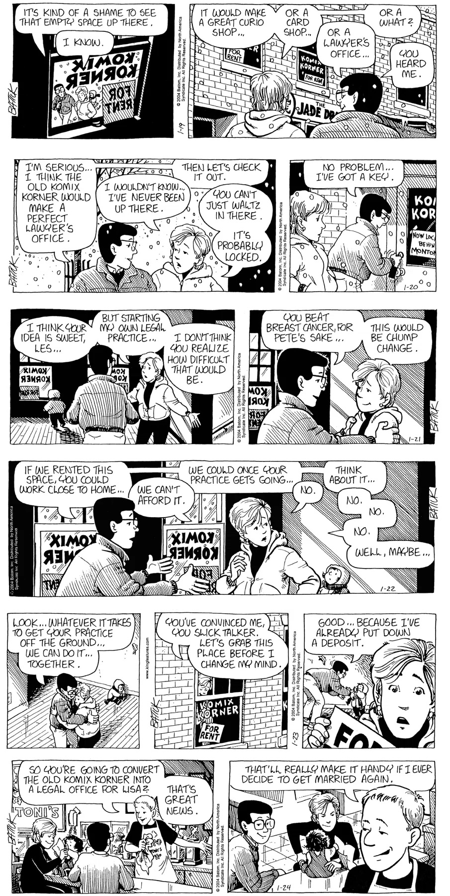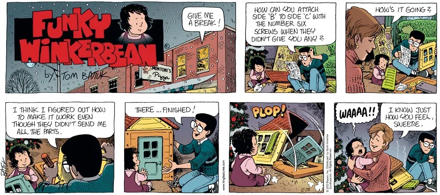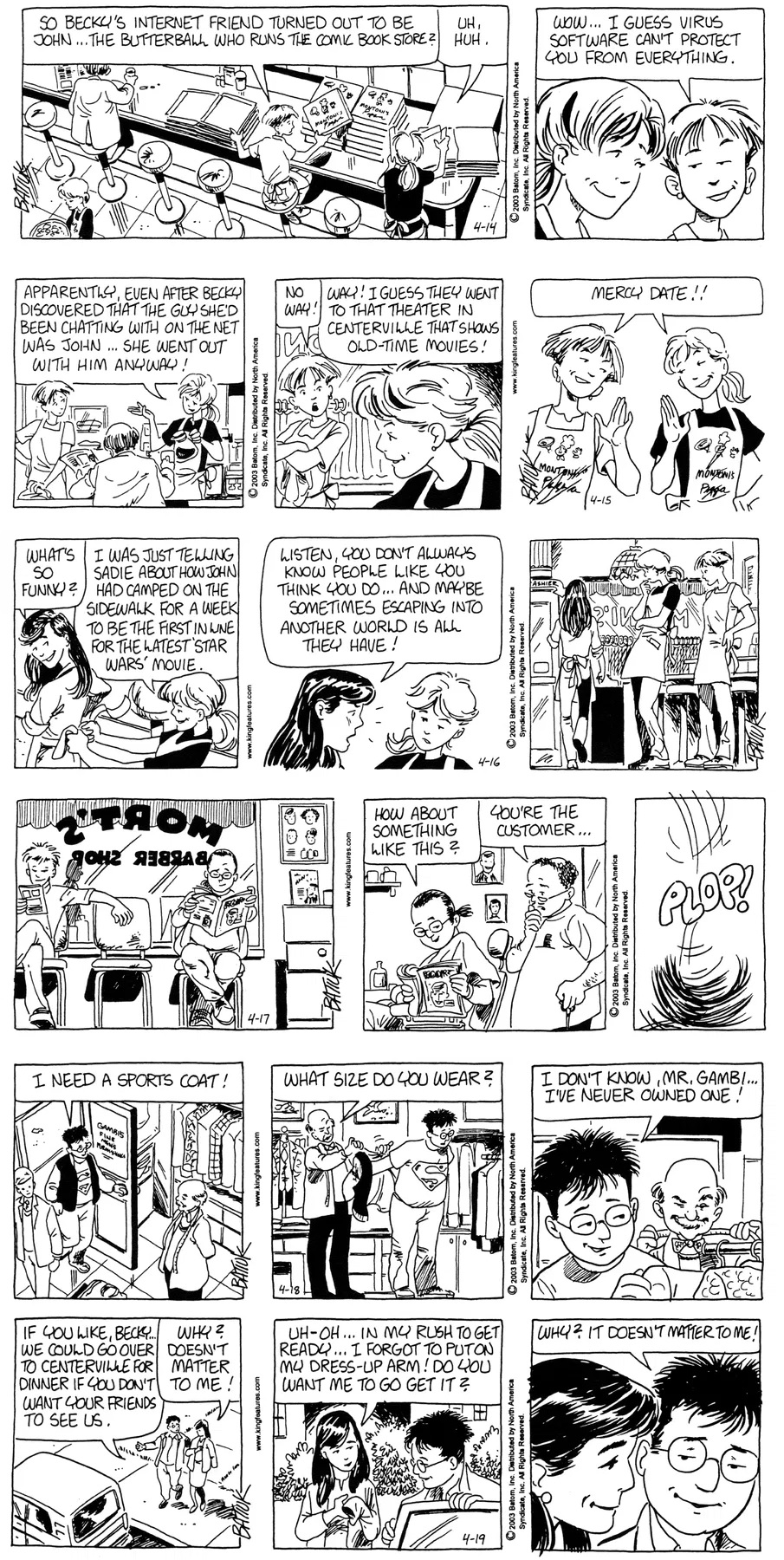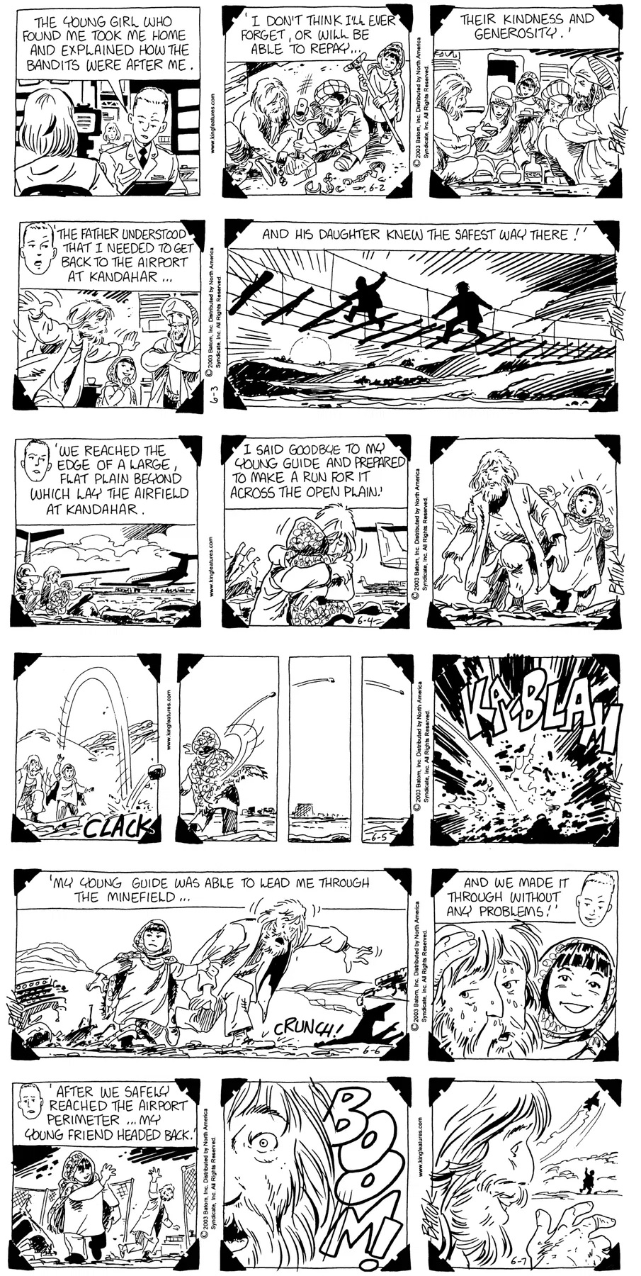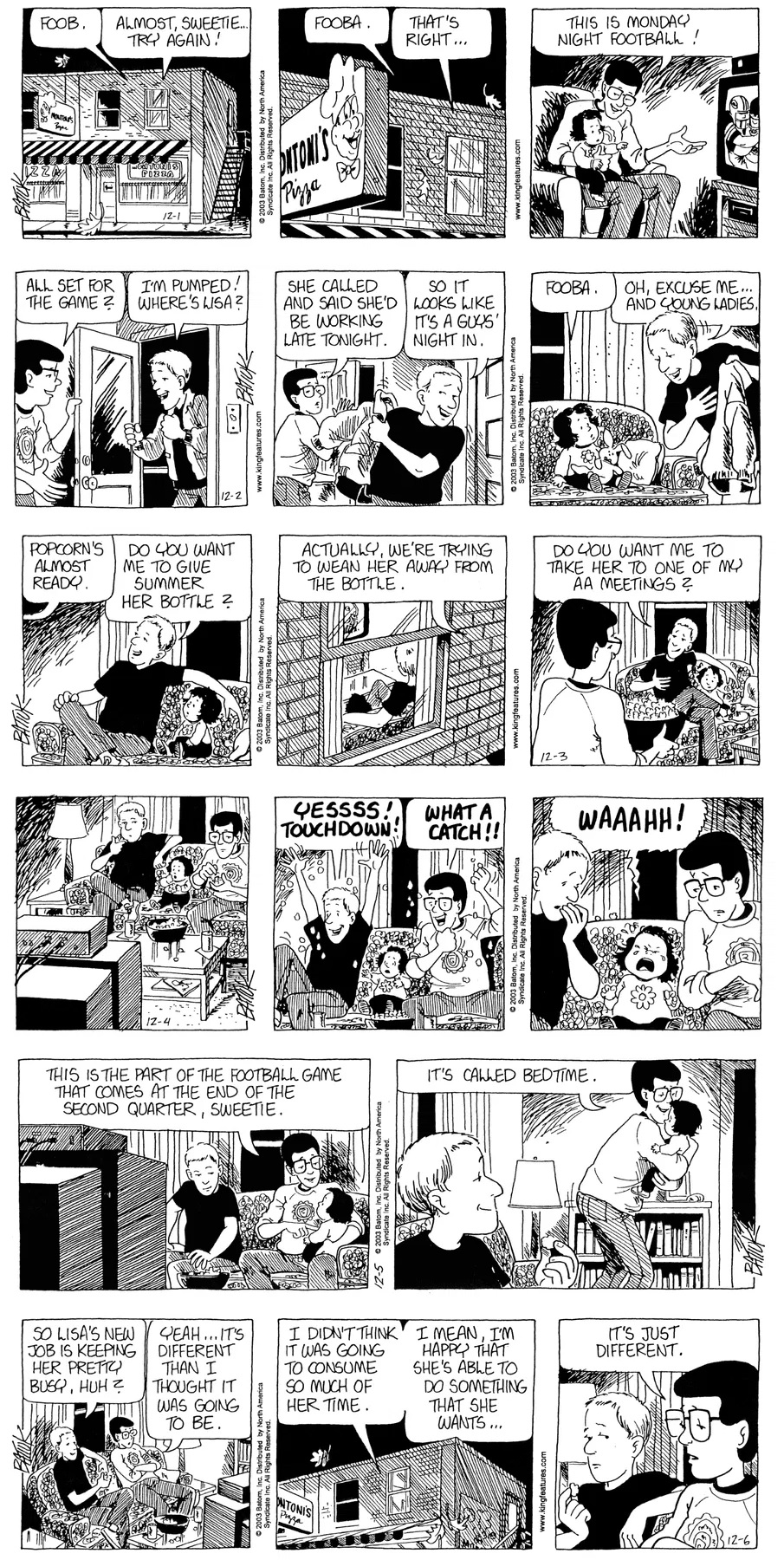 Last time, Funky went to rehab and AA to deal with his alcoholism and while initially things seemed to be turning around in his marriage, 9/11 happened. Cindy's reporting on it made her realize that New York was where she wanted to be and so she signed a new contract without telling Funky who was pissed when he found out. At that point, they were officially separated and all that was left was to work things out with the lawers... except that Cindy's side was demanding partial ownership of Montoni's. Things continued going swimmingly for both Winkerbean men when Wally was shipped off to Afghanistan and soon after, his helicopter was hit by a Stinger and he was listed as MIA.