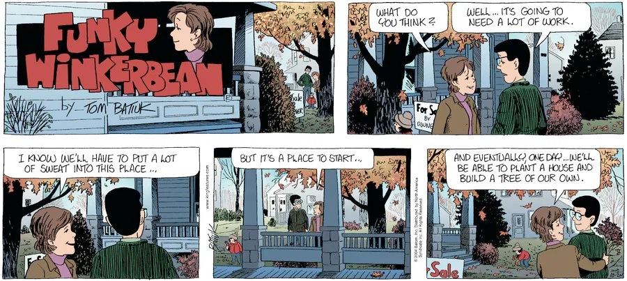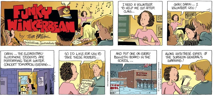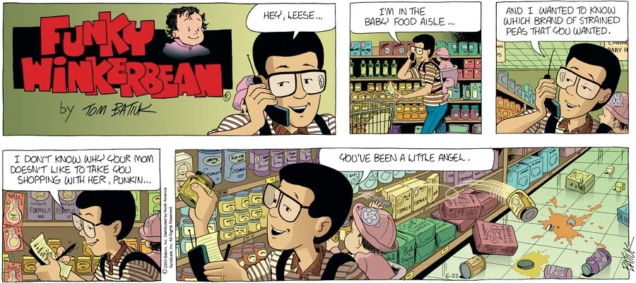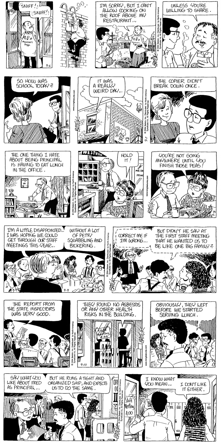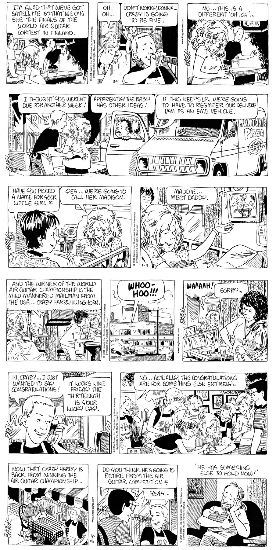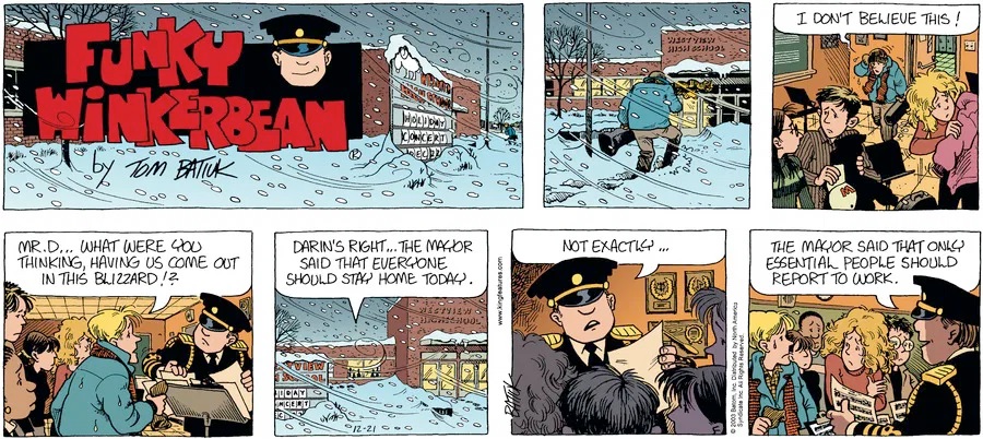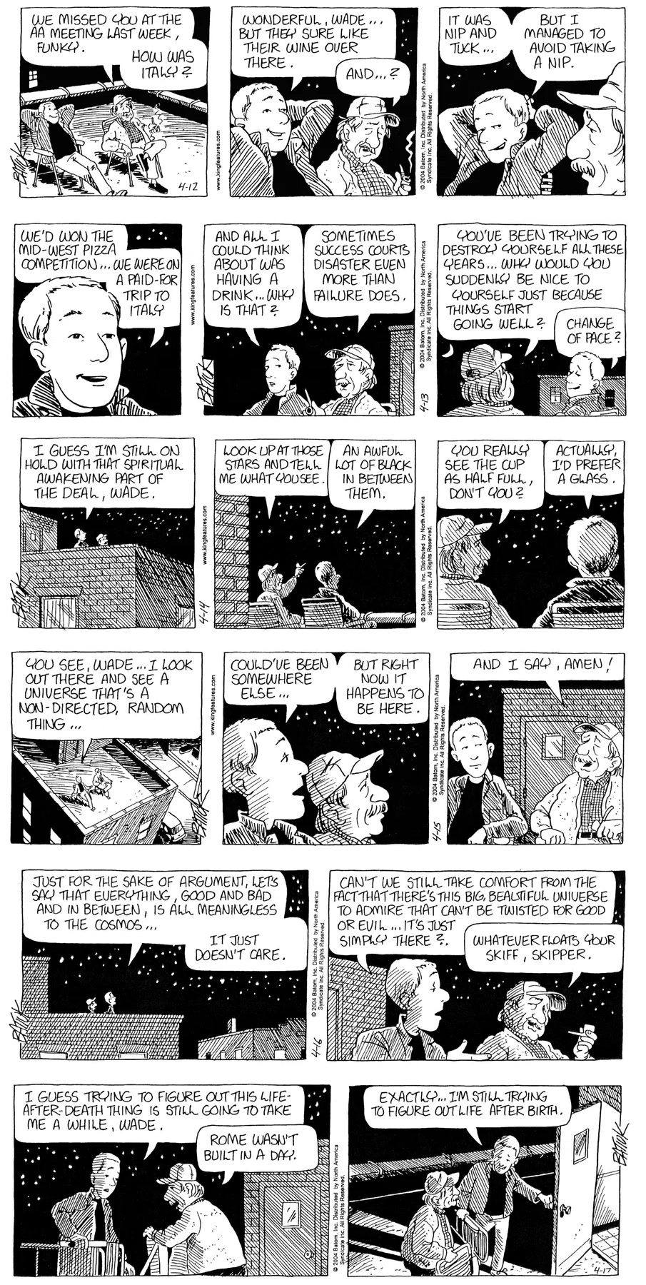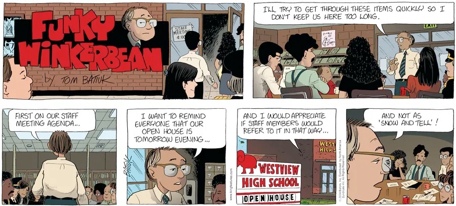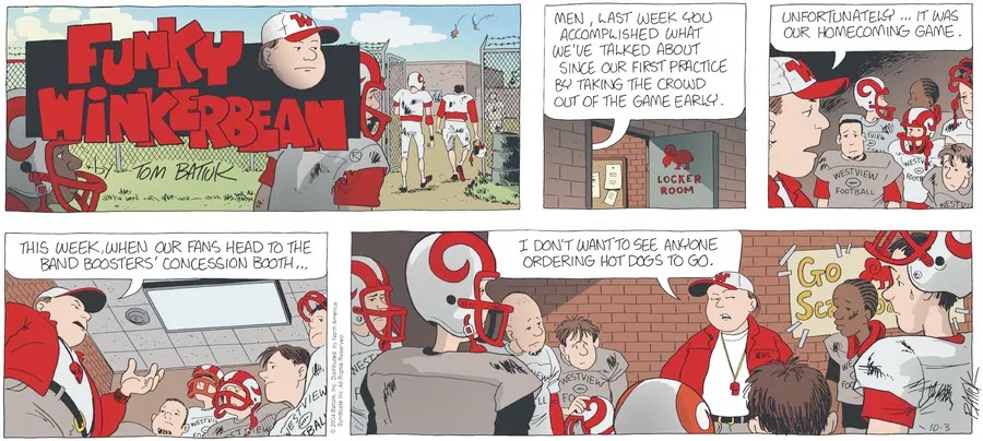 Last time, Funky went to rehab and AA to deal with his alcoholism and while initially things seemed to be turning around in his marriage, 9/11 happened. Cindy's reporting on it made her realize that New York was where she wanted to be and so she signed a new contract without telling Funky who was pissed when he found out. At that point, they were officially separated and all that was left was to work things out with the lawers... except that Cindy's side was demanding partial ownership of Montoni's. Things continued going swimmingly for both Winkerbean men when Wally was shipped off to Afghanistan and soon after, his helicopter was hit by a Stinger and he was listed as MIA.