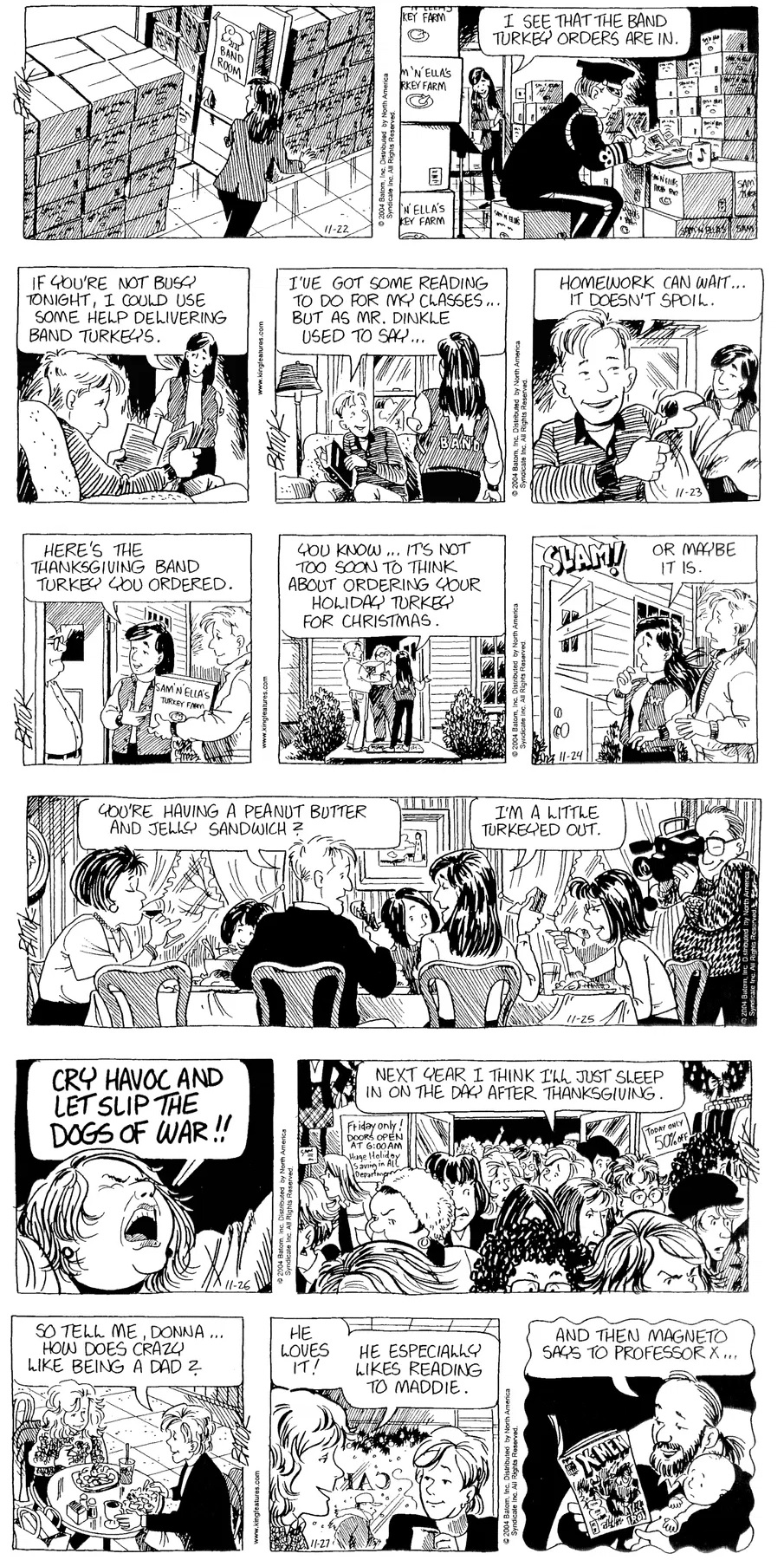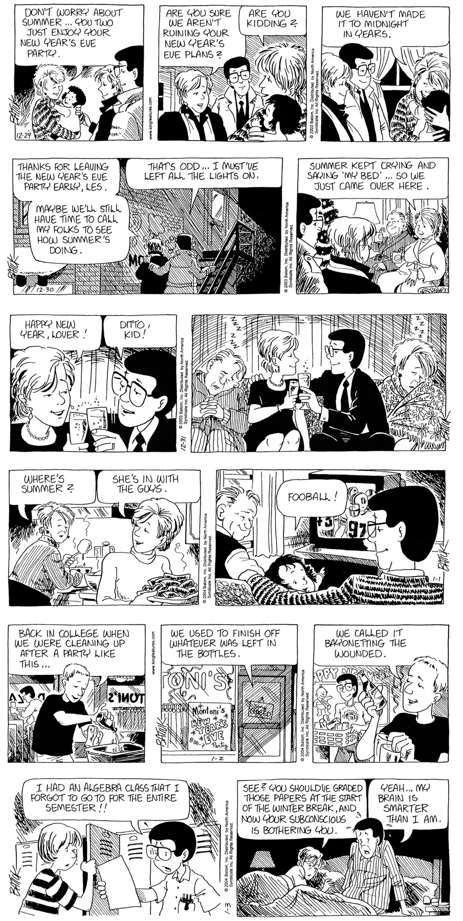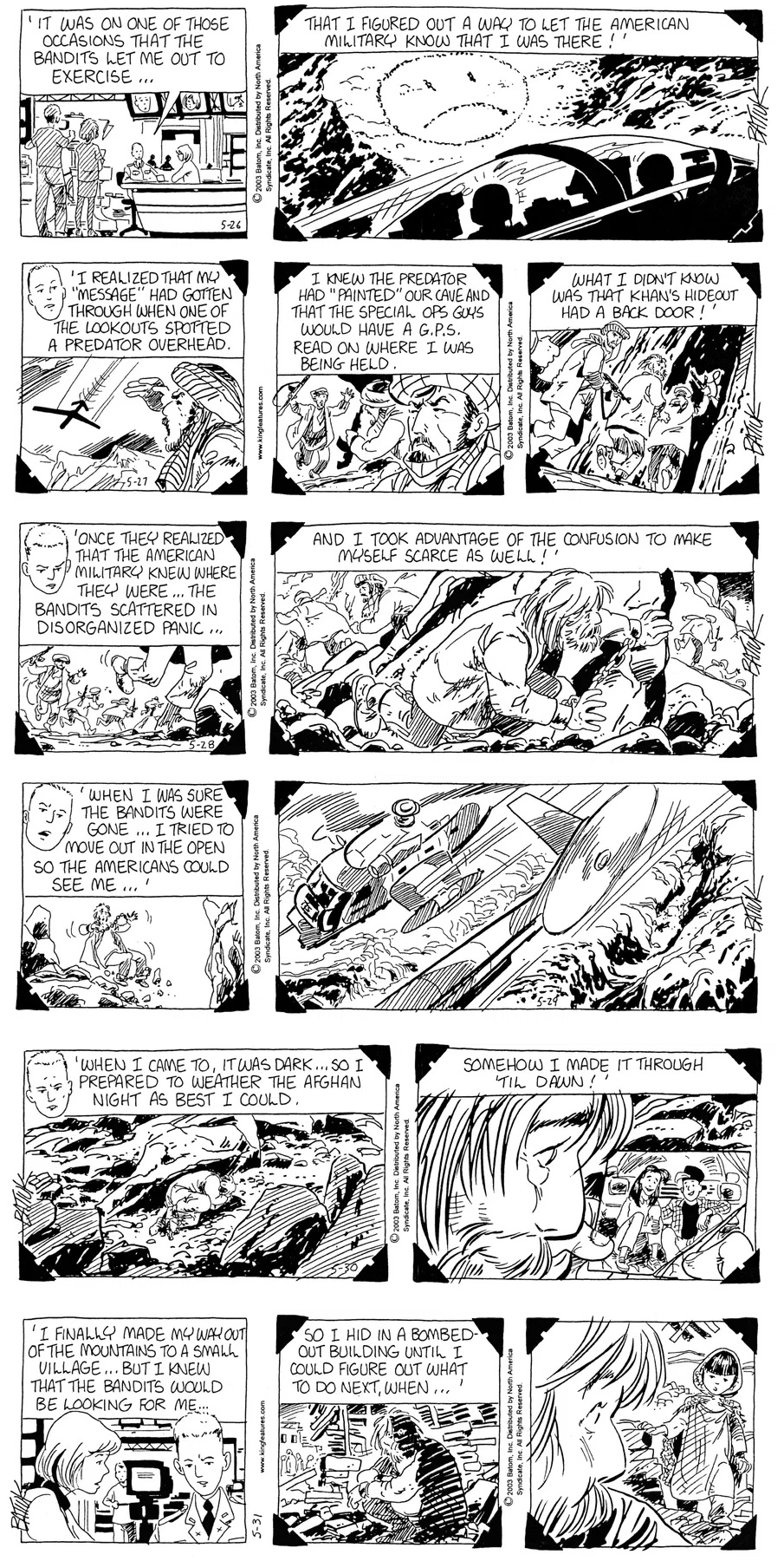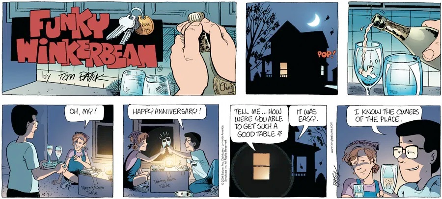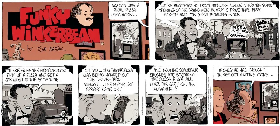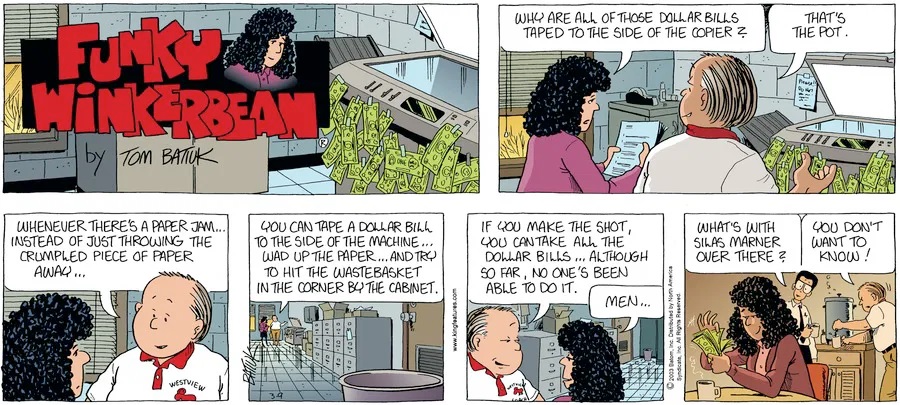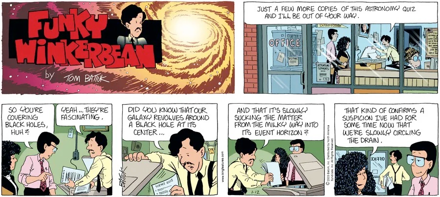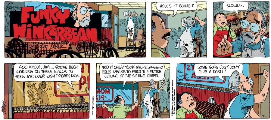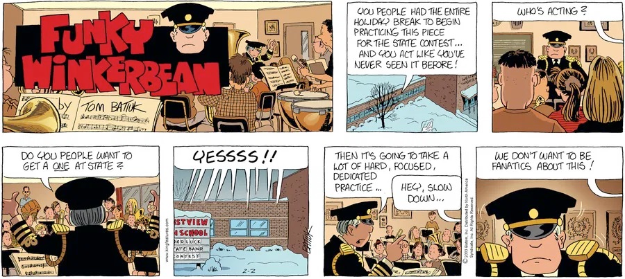 Last time, Funky went to rehab and AA to deal with his alcoholism and while initially things seemed to be turning around in his marriage, 9/11 happened. Cindy's reporting on it made her realize that New York was where she wanted to be and so she signed a new contract without telling Funky who was pissed when he found out. At that point, they were officially separated and all that was left was to work things out with the lawers... except that Cindy's side was demanding partial ownership of Montoni's. Things continued going swimmingly for both Winkerbean men when Wally was shipped off to Afghanistan and soon after, his helicopter was hit by a Stinger and he was listed as MIA.