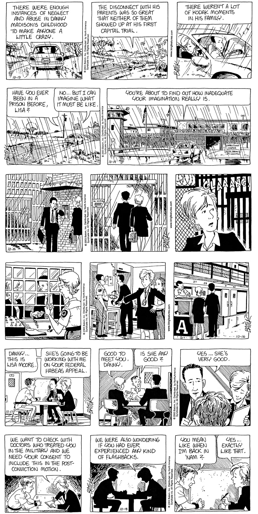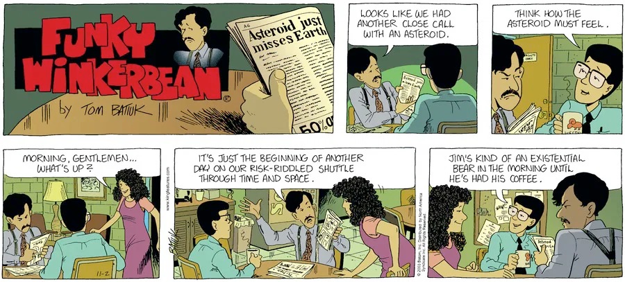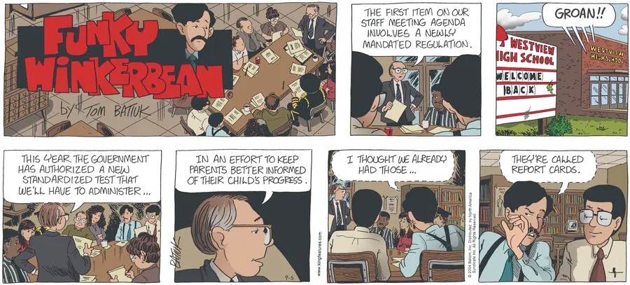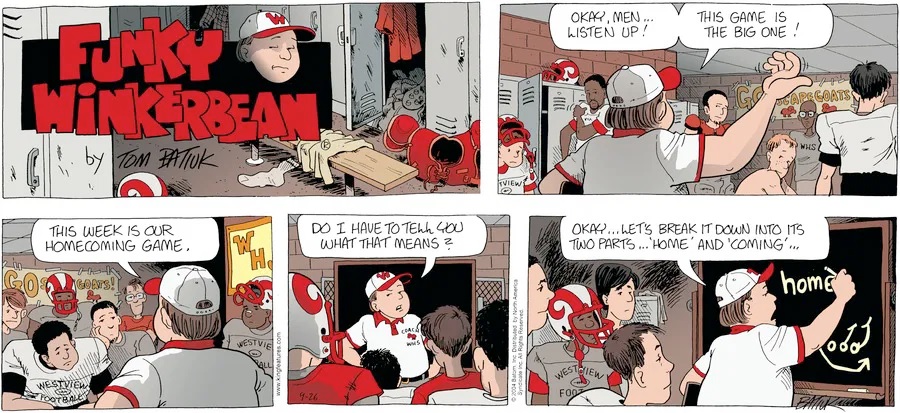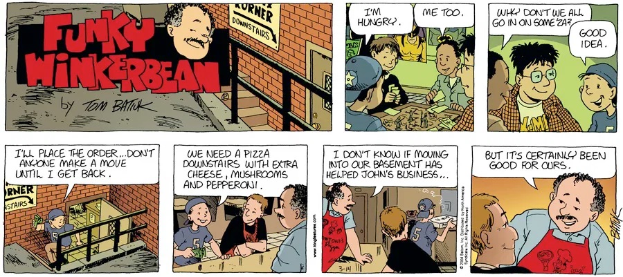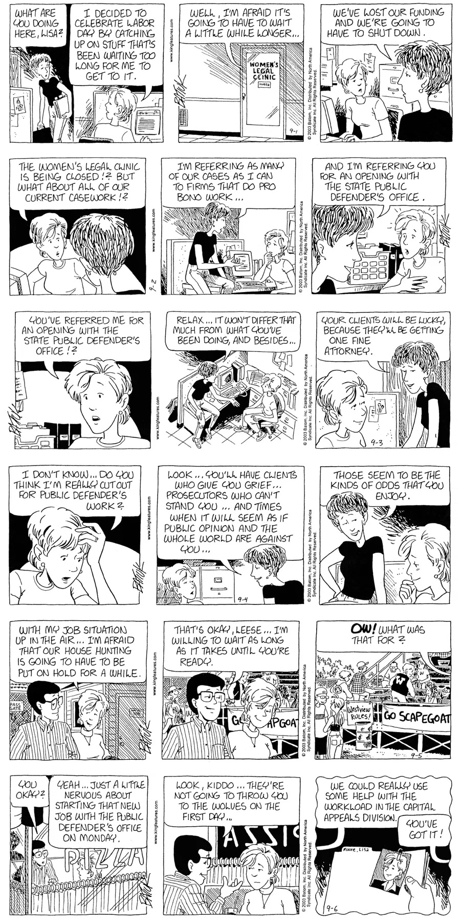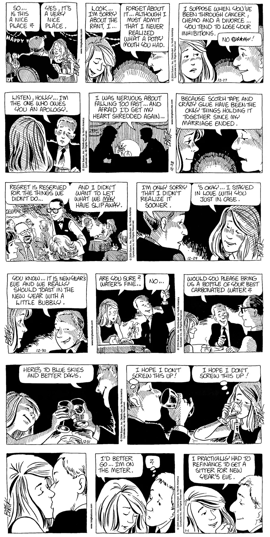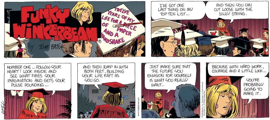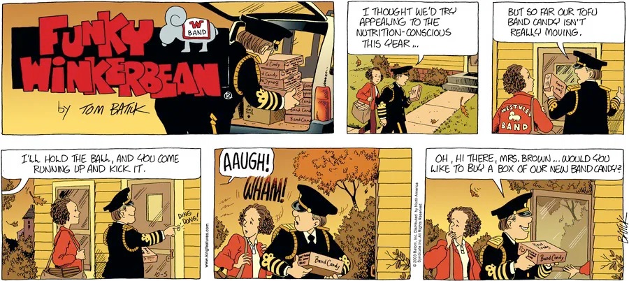 Last time, Funky went to rehab and AA to deal with his alcoholism and while initially things seemed to be turning around in his marriage, 9/11 happened. Cindy's reporting on it made her realize that New York was where she wanted to be and so she signed a new contract without telling Funky who was pissed when he found out. At that point, they were officially separated and all that was left was to work things out with the lawers... except that Cindy's side was demanding partial ownership of Montoni's. Things continued going swimmingly for both Winkerbean men when Wally was shipped off to Afghanistan and soon after, his helicopter was hit by a Stinger and he was listed as MIA.