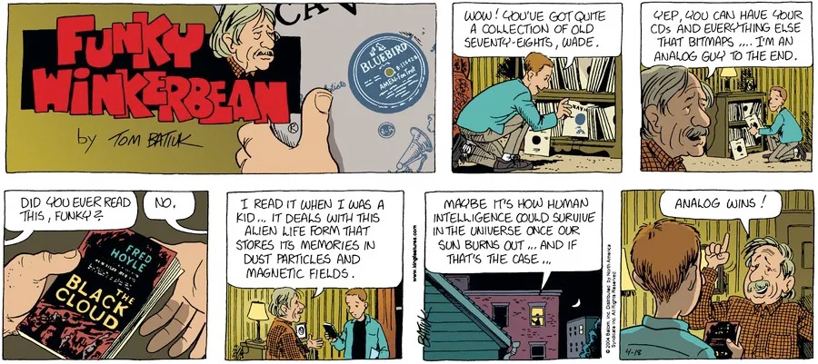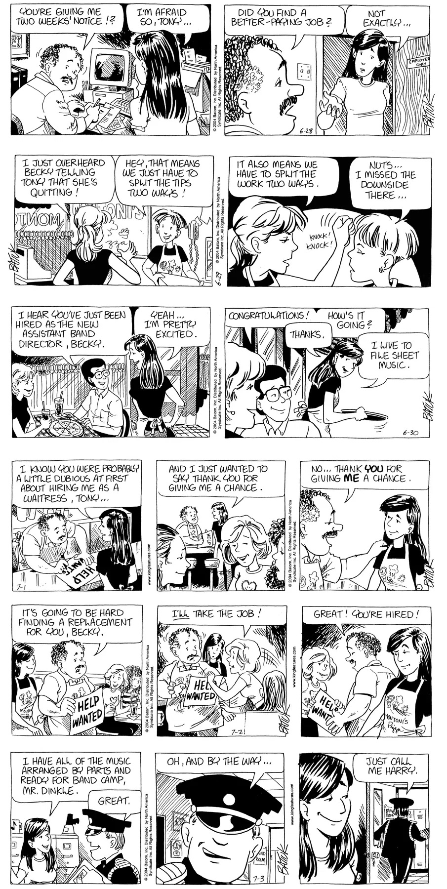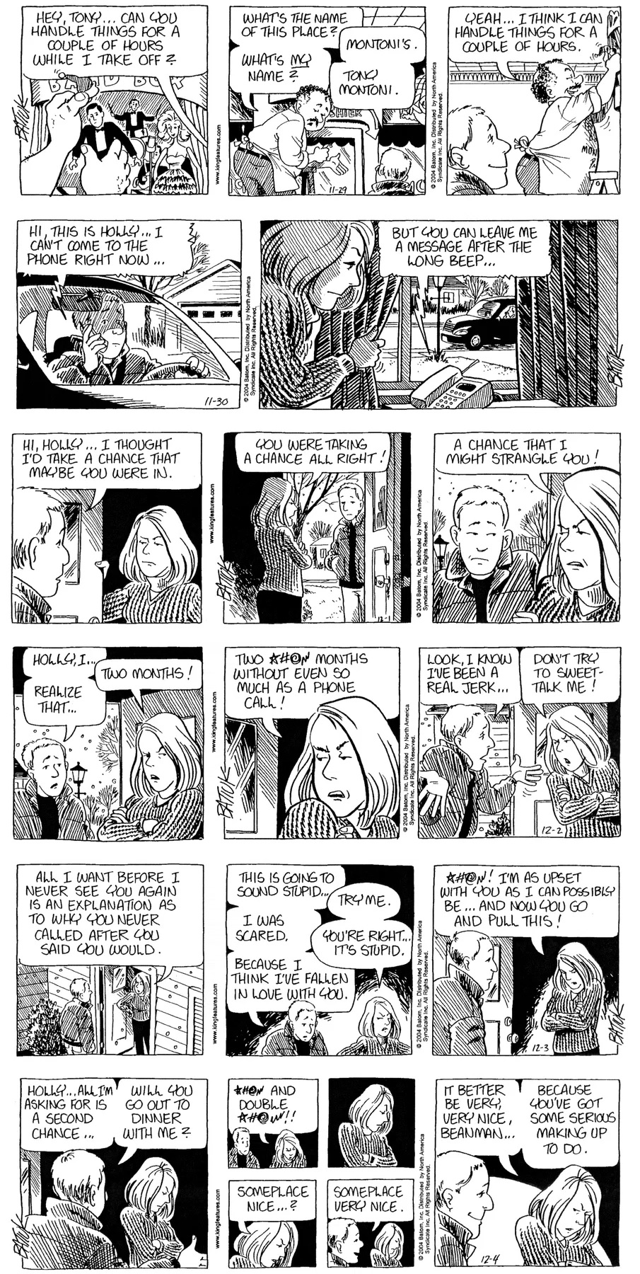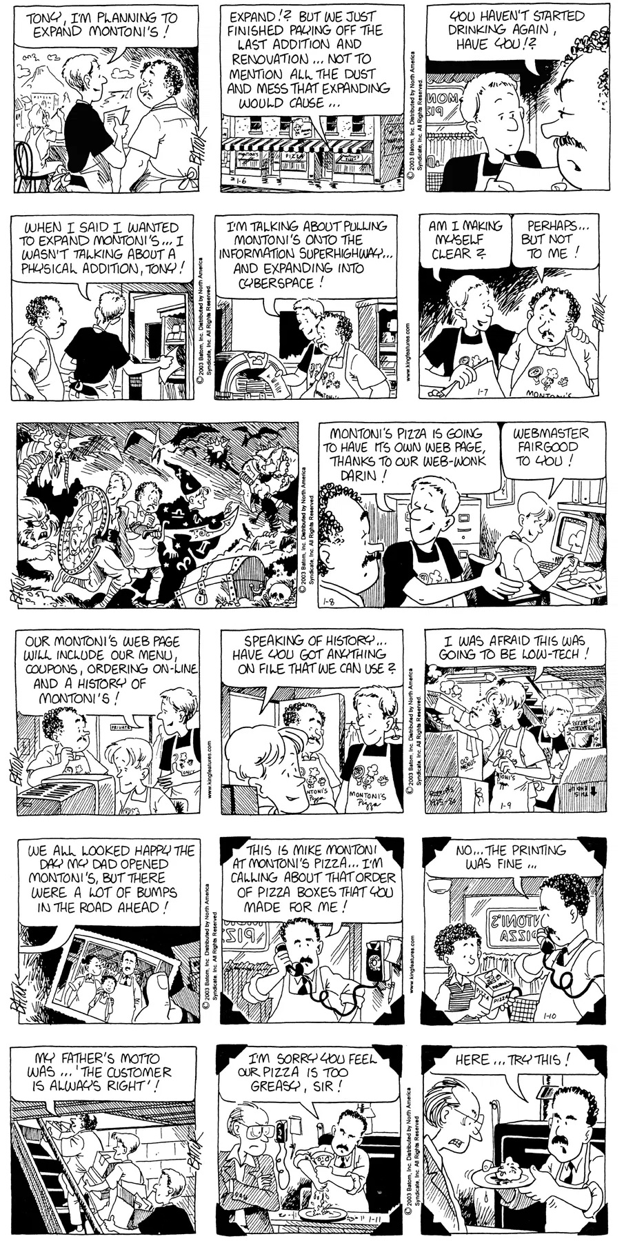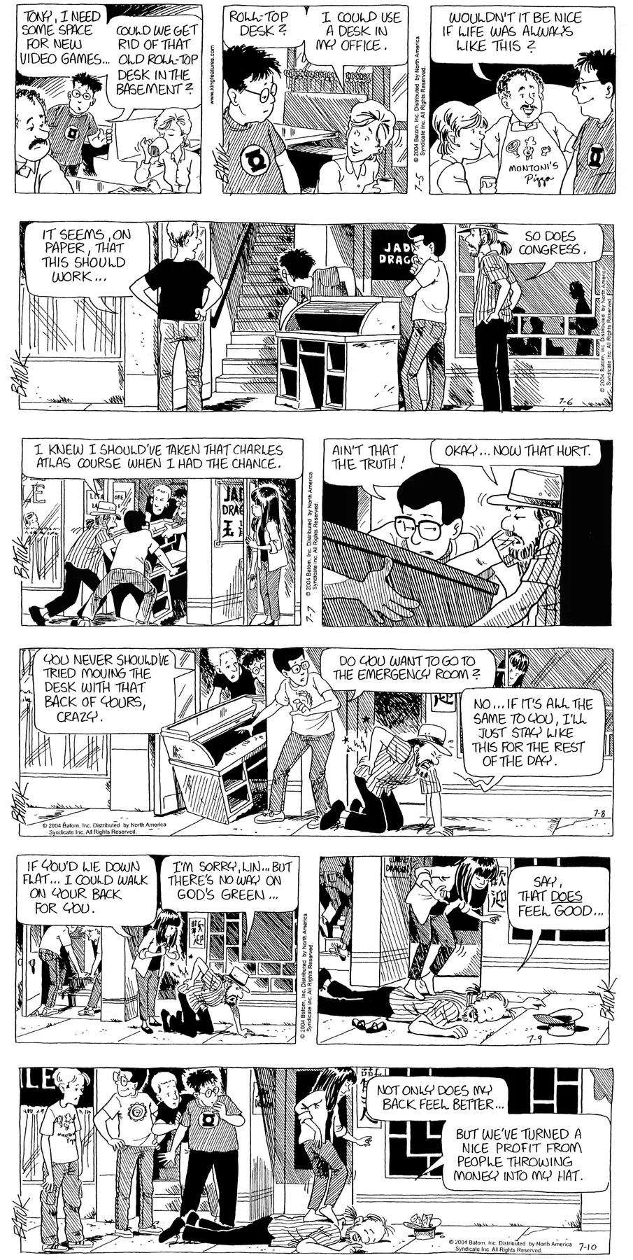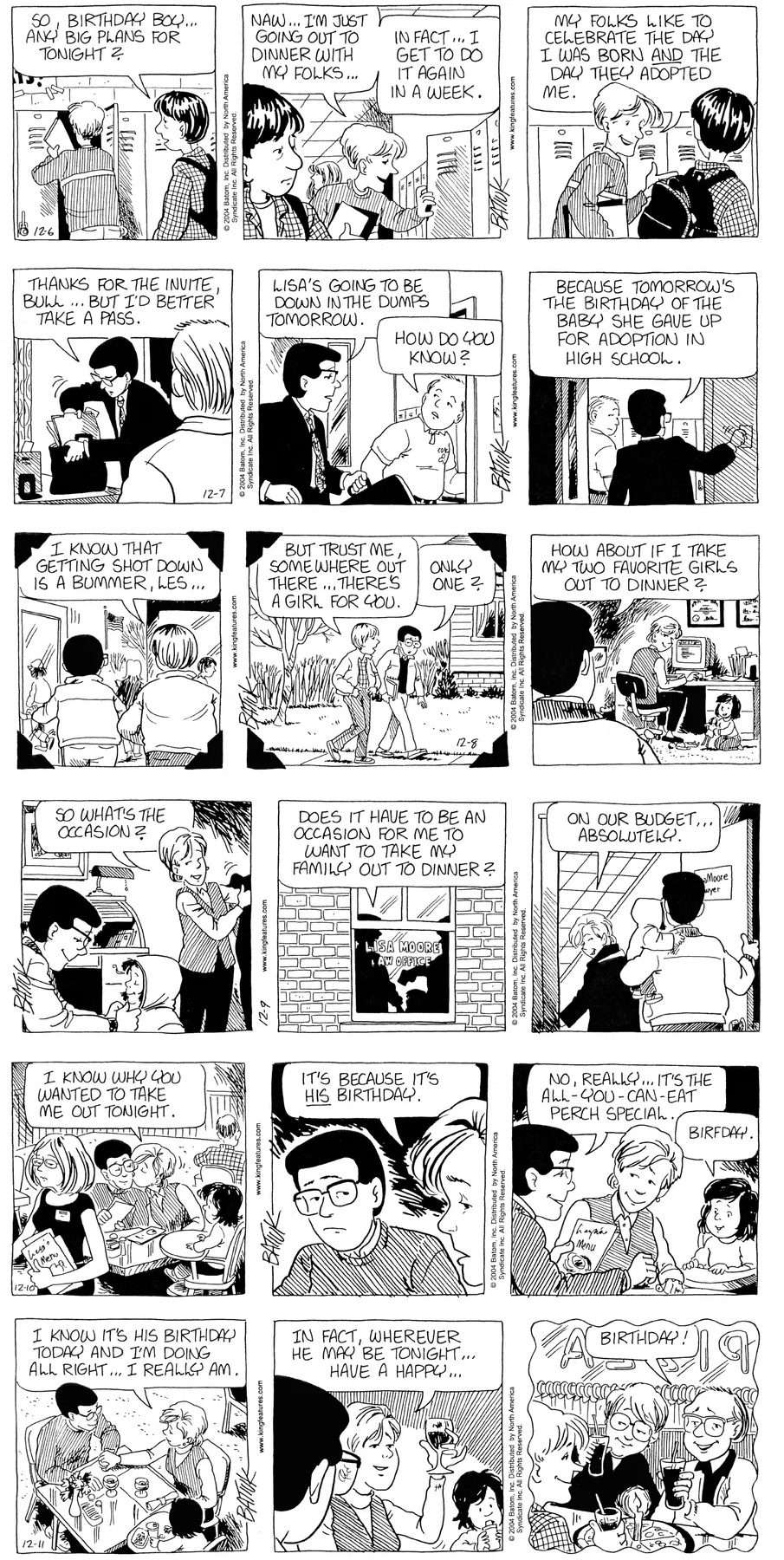 Last time, Funky went to rehab and AA to deal with his alcoholism and while initially things seemed to be turning around in his marriage, 9/11 happened. Cindy's reporting on it made her realize that New York was where she wanted to be and so she signed a new contract without telling Funky who was pissed when he found out. At that point, they were officially separated and all that was left was to work things out with the lawers... except that Cindy's side was demanding partial ownership of Montoni's. Things continued going swimmingly for both Winkerbean men when Wally was shipped off to Afghanistan and soon after, his helicopter was hit by a Stinger and he was listed as MIA.