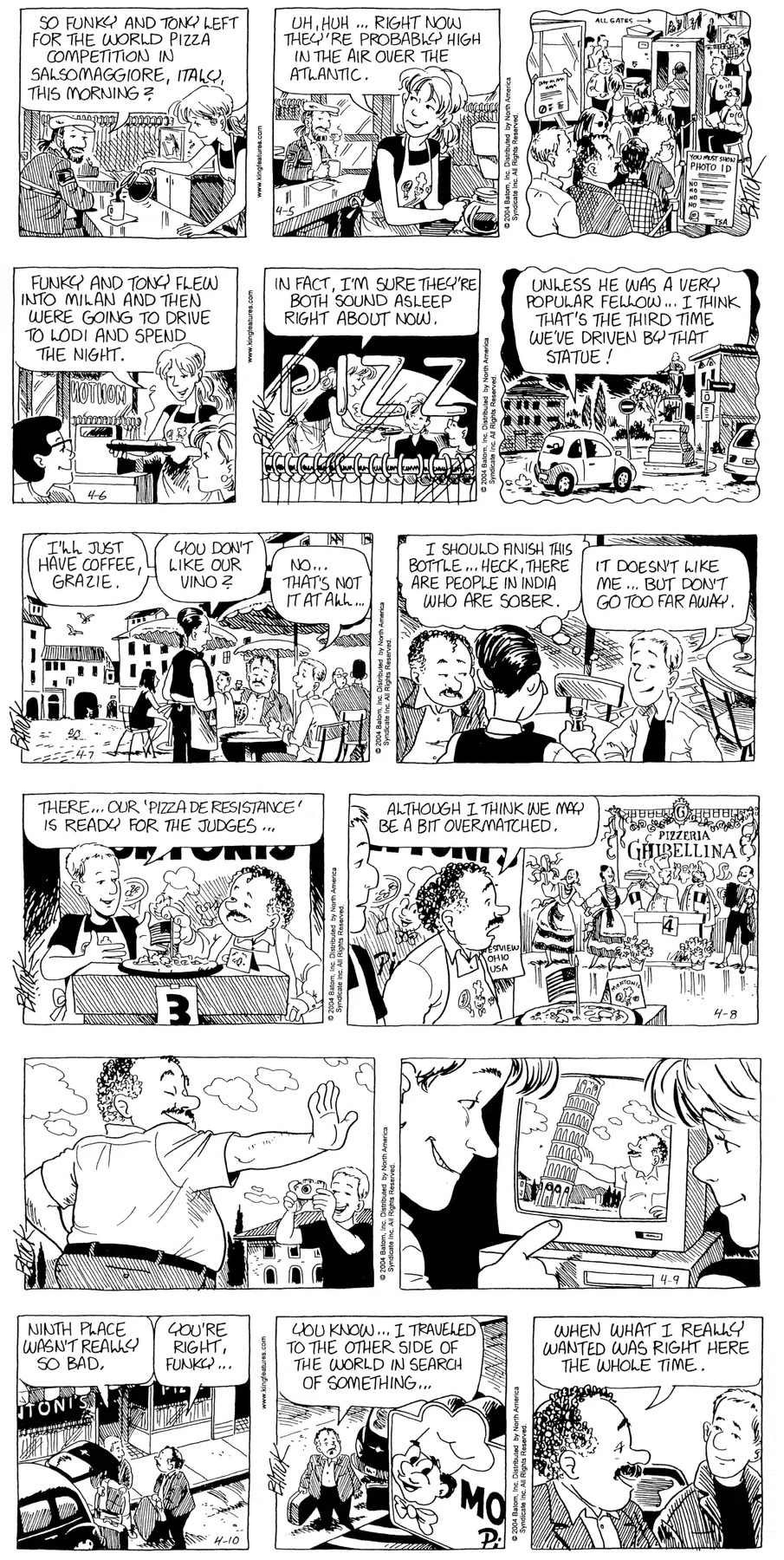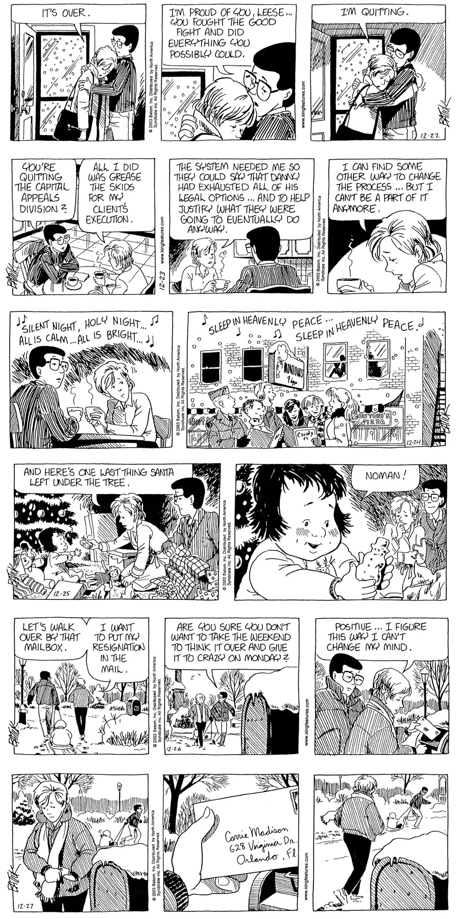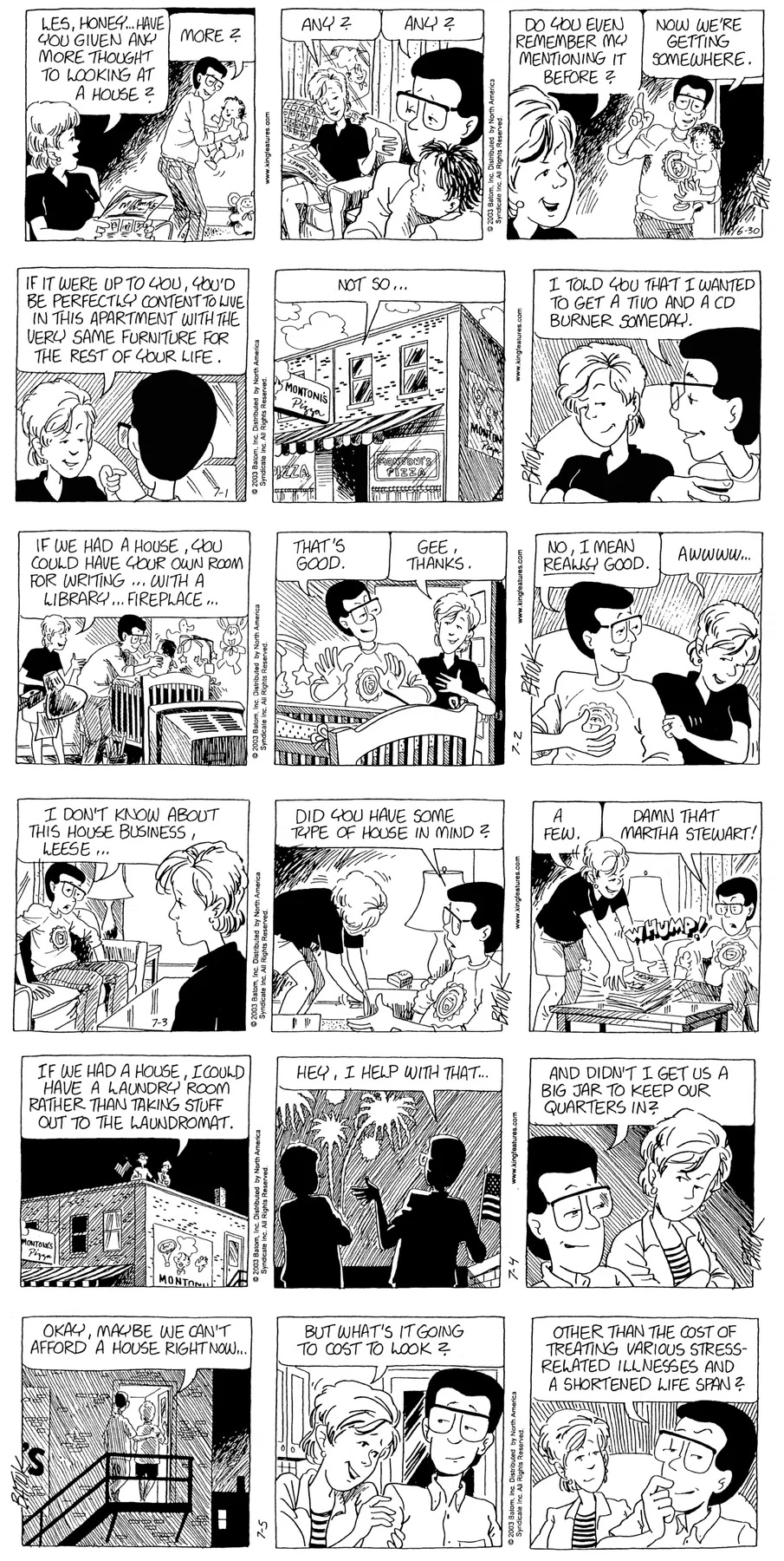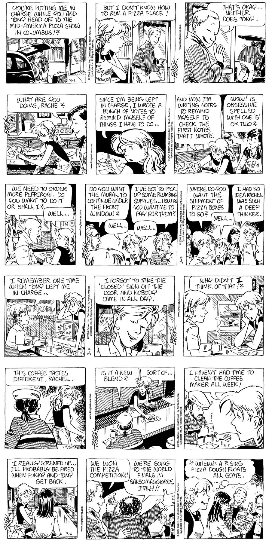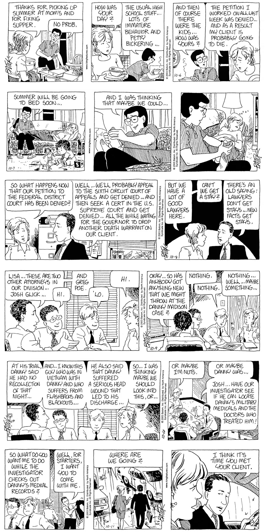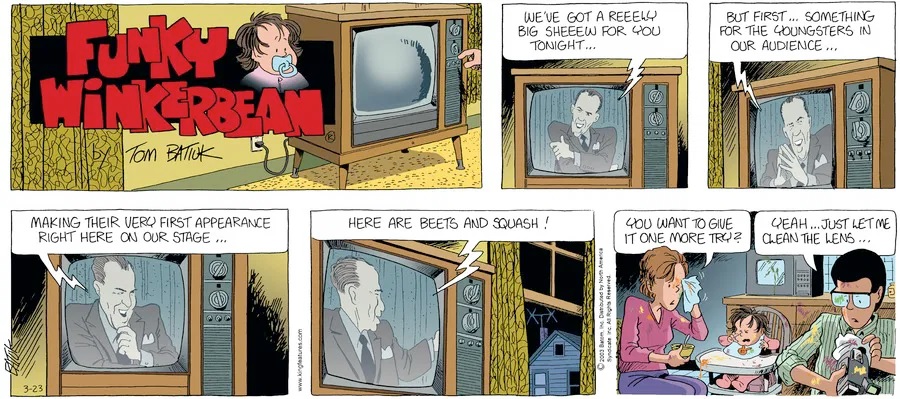 Last time, Funky went to rehab and AA to deal with his alcoholism and while initially things seemed to be turning around in his marriage, 9/11 happened. Cindy's reporting on it made her realize that New York was where she wanted to be and so she signed a new contract without telling Funky who was pissed when he found out. At that point, they were officially separated and all that was left was to work things out with the lawers... except that Cindy's side was demanding partial ownership of Montoni's. Things continued going swimmingly for both Winkerbean men when Wally was shipped off to Afghanistan and soon after, his helicopter was hit by a Stinger and he was listed as MIA.
