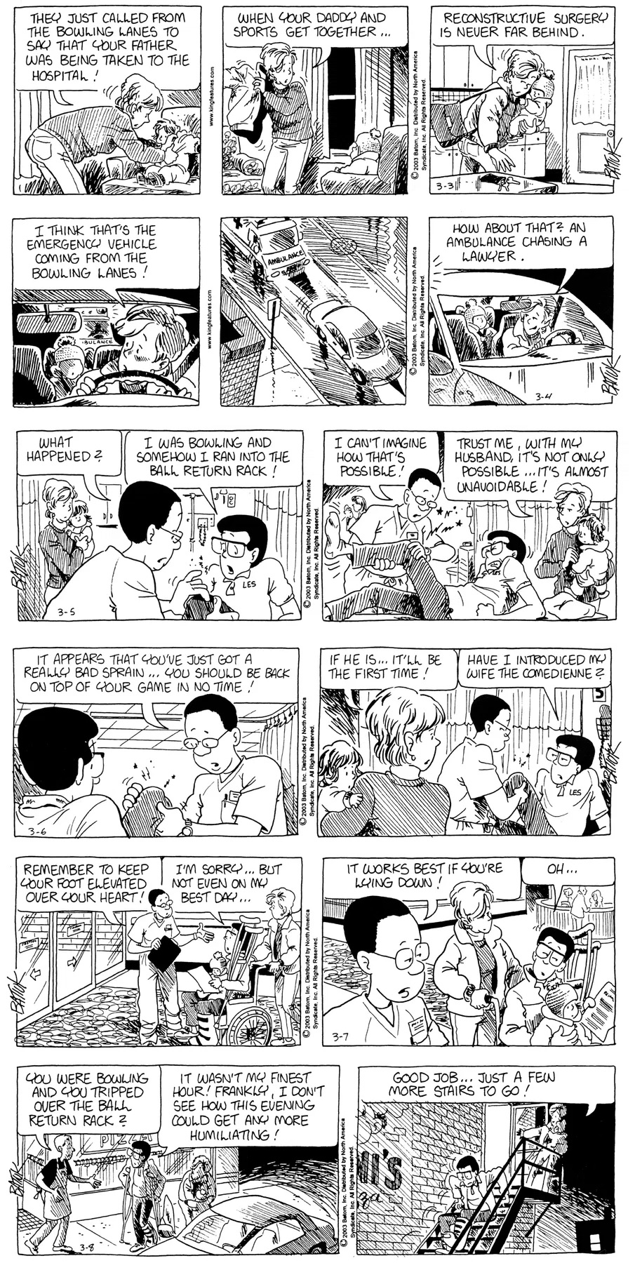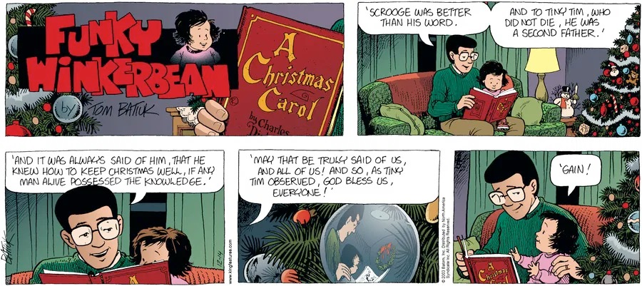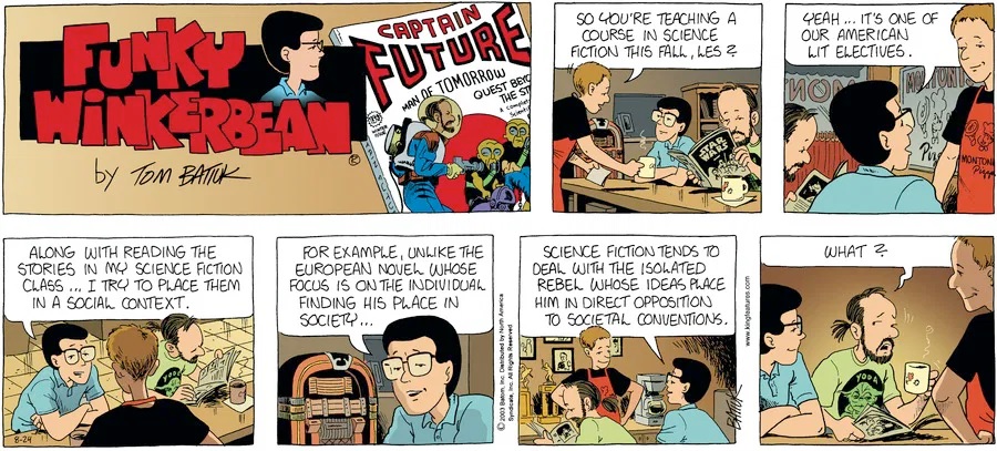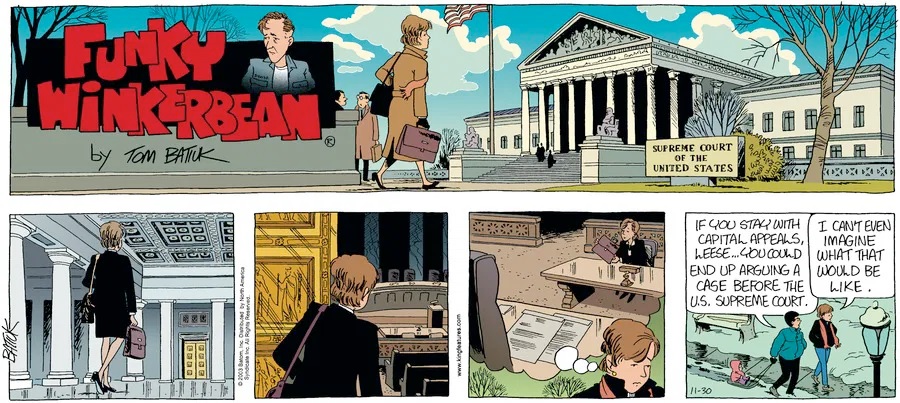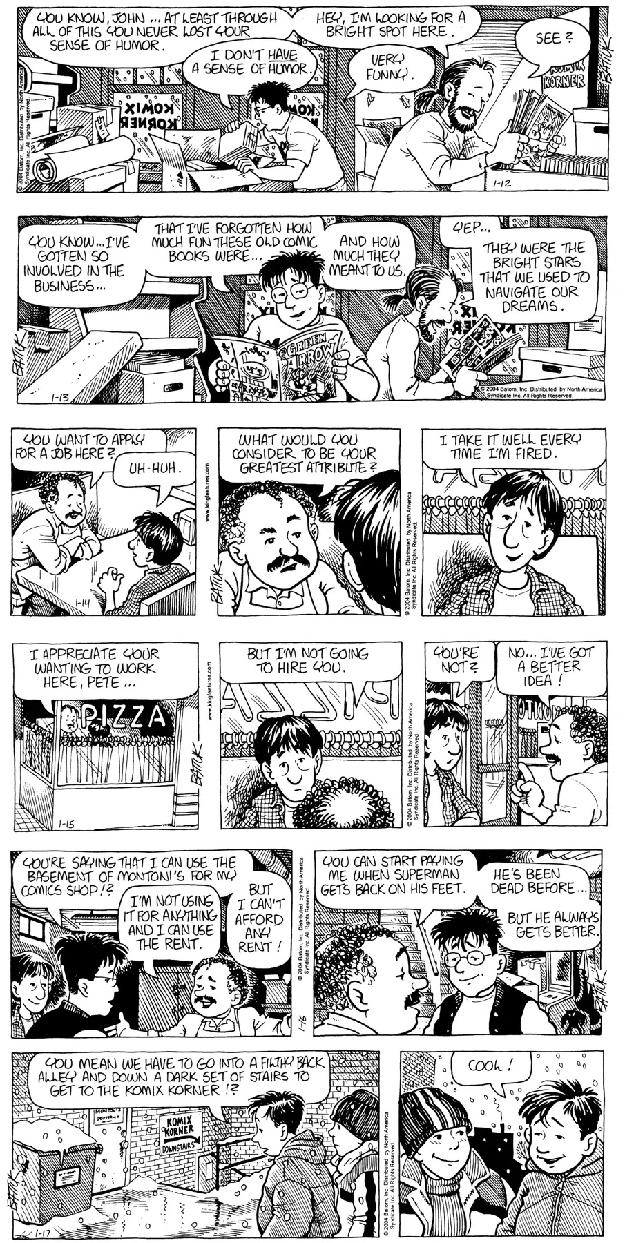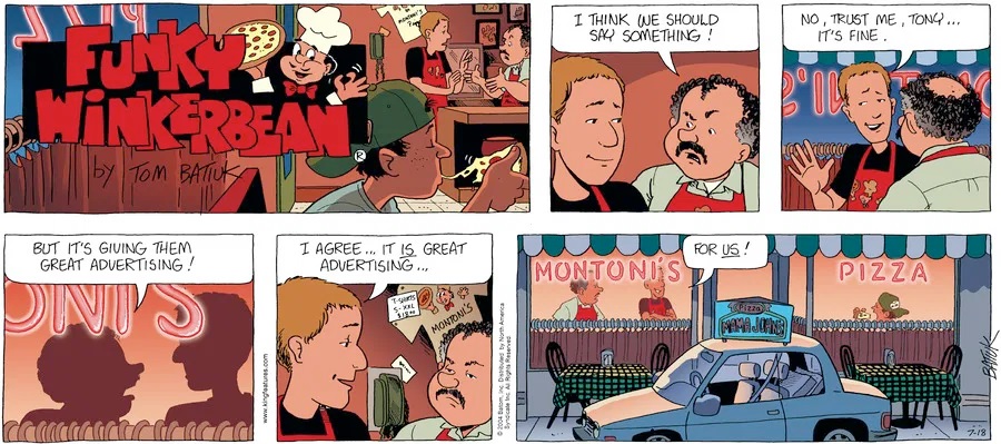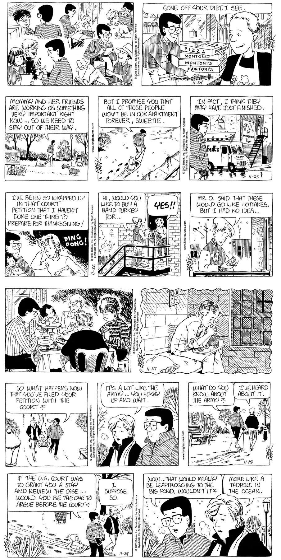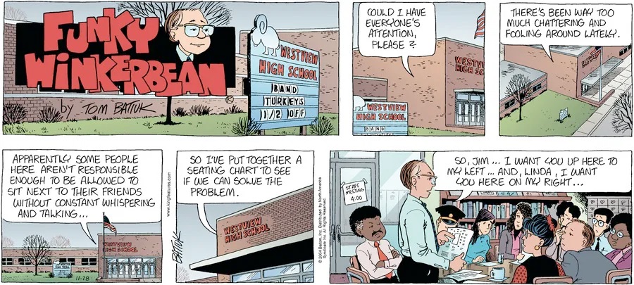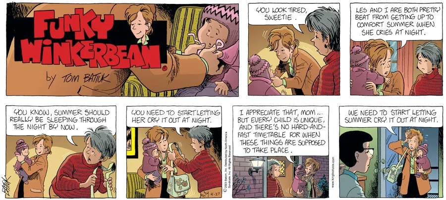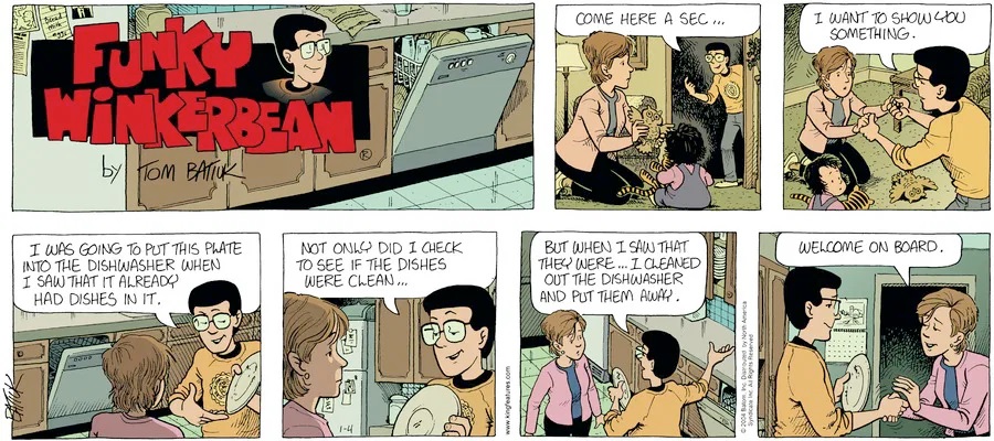 Last time, Funky went to rehab and AA to deal with his alcoholism and while initially things seemed to be turning around in his marriage, 9/11 happened. Cindy's reporting on it made her realize that New York was where she wanted to be and so she signed a new contract without telling Funky who was pissed when he found out. At that point, they were officially separated and all that was left was to work things out with the lawers... except that Cindy's side was demanding partial ownership of Montoni's. Things continued going swimmingly for both Winkerbean men when Wally was shipped off to Afghanistan and soon after, his helicopter was hit by a Stinger and he was listed as MIA.