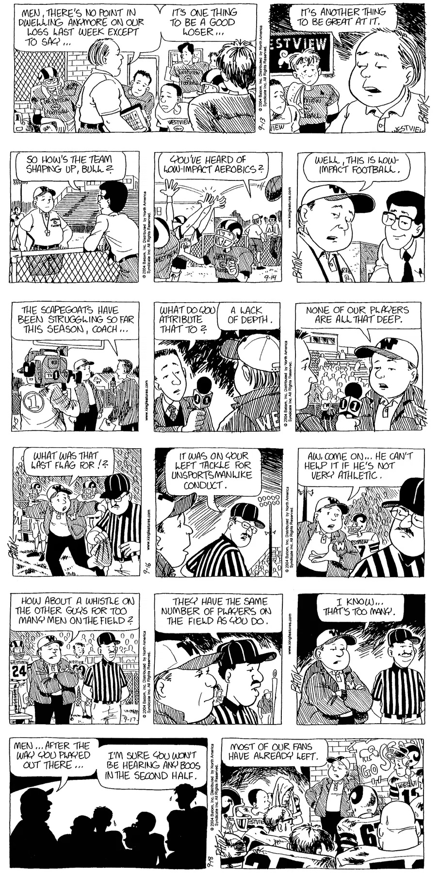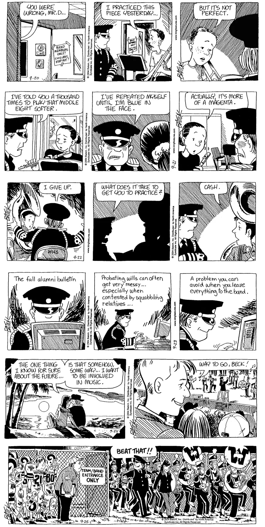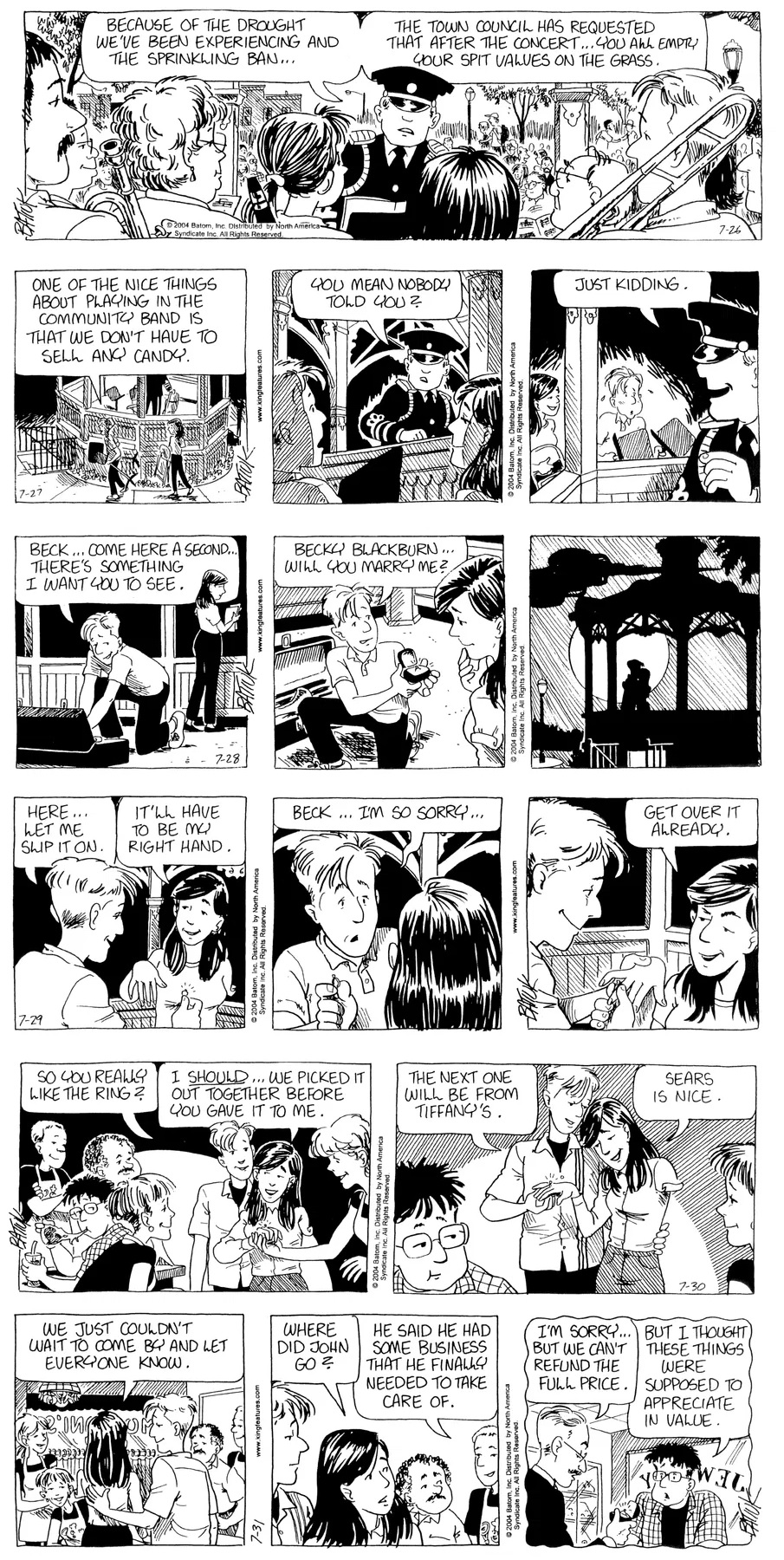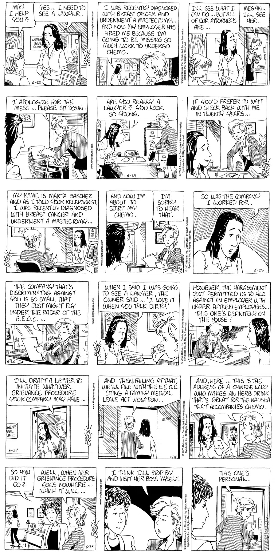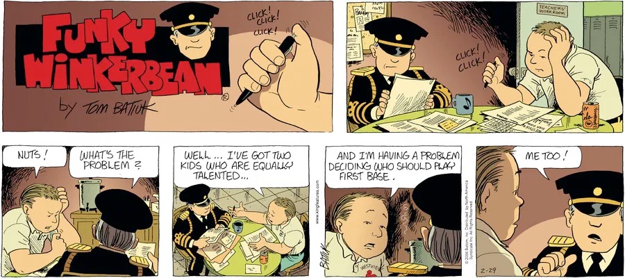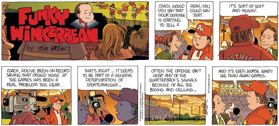 Last time, Funky went to rehab and AA to deal with his alcoholism and while initially things seemed to be turning around in his marriage, 9/11 happened. Cindy's reporting on it made her realize that New York was where she wanted to be and so she signed a new contract without telling Funky who was pissed when he found out. At that point, they were officially separated and all that was left was to work things out with the lawers... except that Cindy's side was demanding partial ownership of Montoni's. Things continued going swimmingly for both Winkerbean men when Wally was shipped off to Afghanistan and soon after, his helicopter was hit by a Stinger and he was listed as MIA.