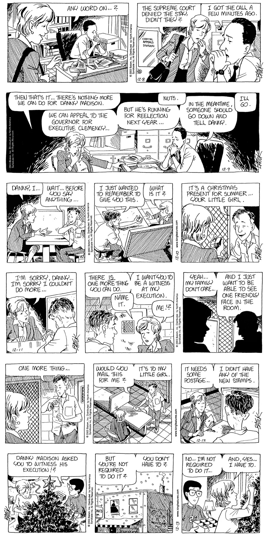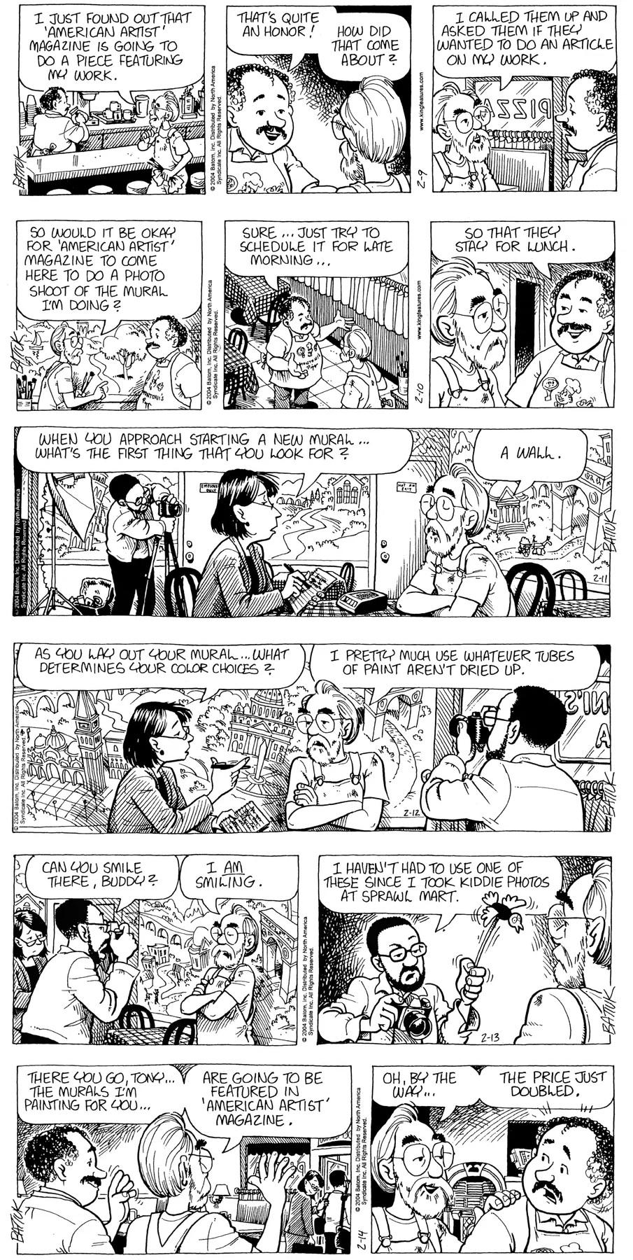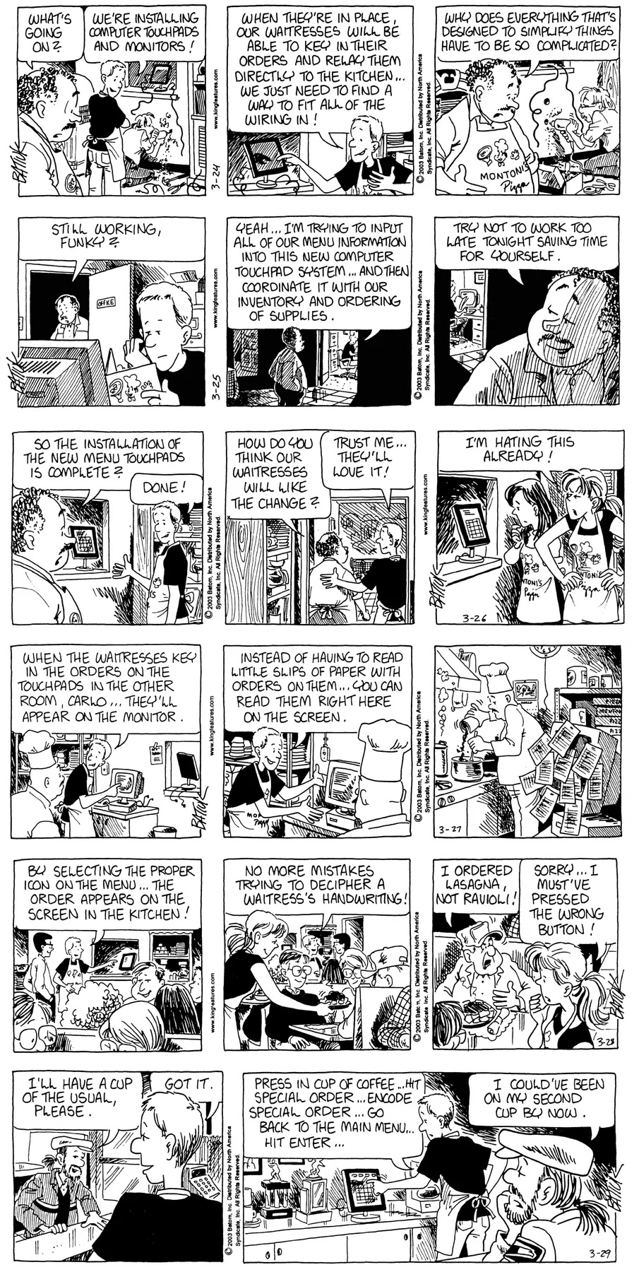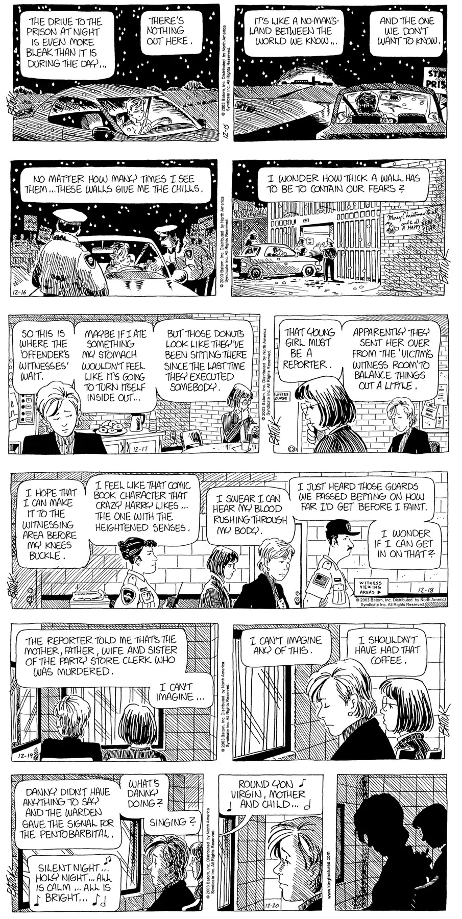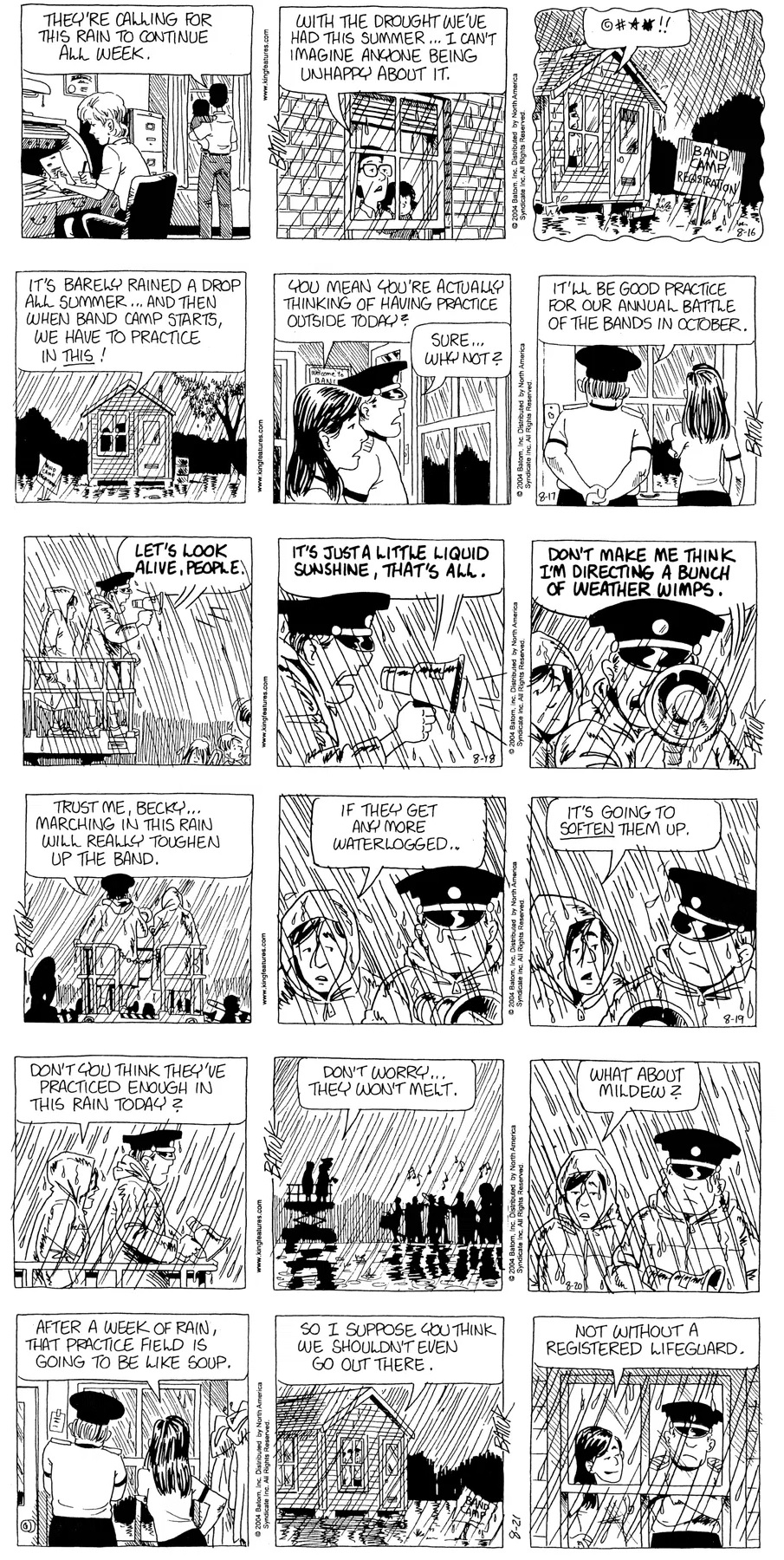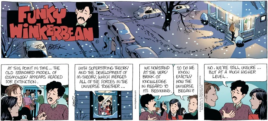 Last time, Funky went to rehab and AA to deal with his alcoholism and while initially things seemed to be turning around in his marriage, 9/11 happened. Cindy's reporting on it made her realize that New York was where she wanted to be and so she signed a new contract without telling Funky who was pissed when he found out. At that point, they were officially separated and all that was left was to work things out with the lawers... except that Cindy's side was demanding partial ownership of Montoni's. Things continued going swimmingly for both Winkerbean men when Wally was shipped off to Afghanistan and soon after, his helicopter was hit by a Stinger and he was listed as MIA.