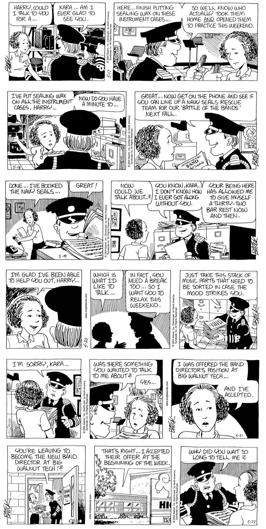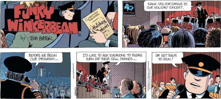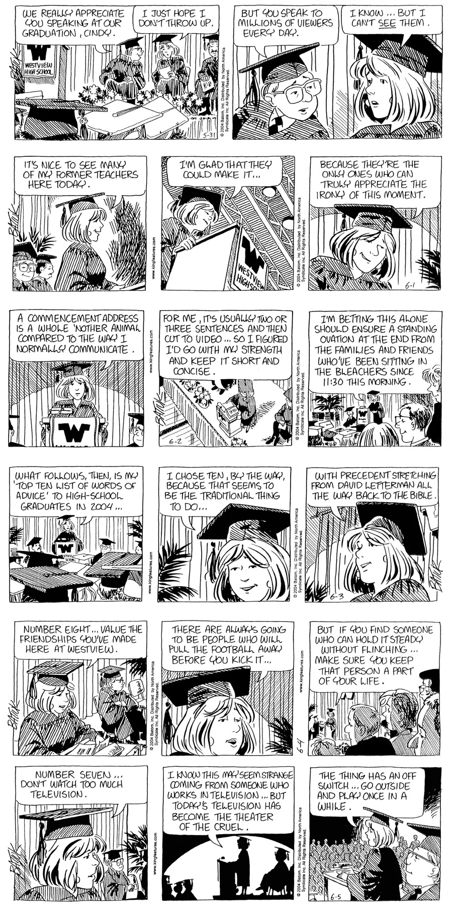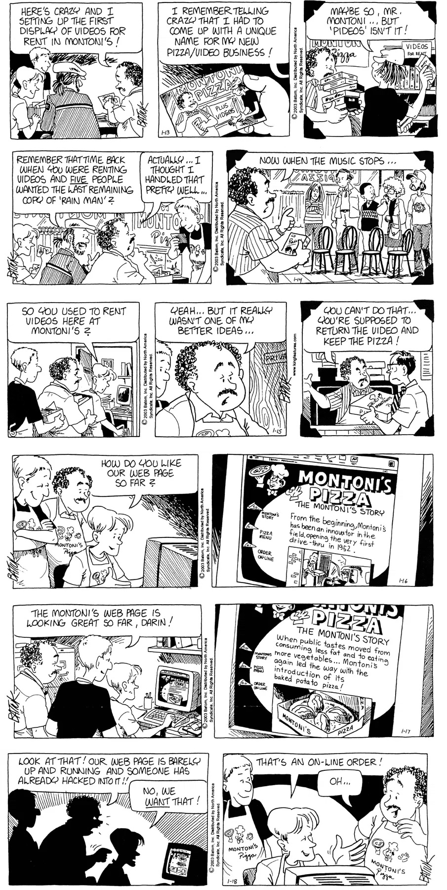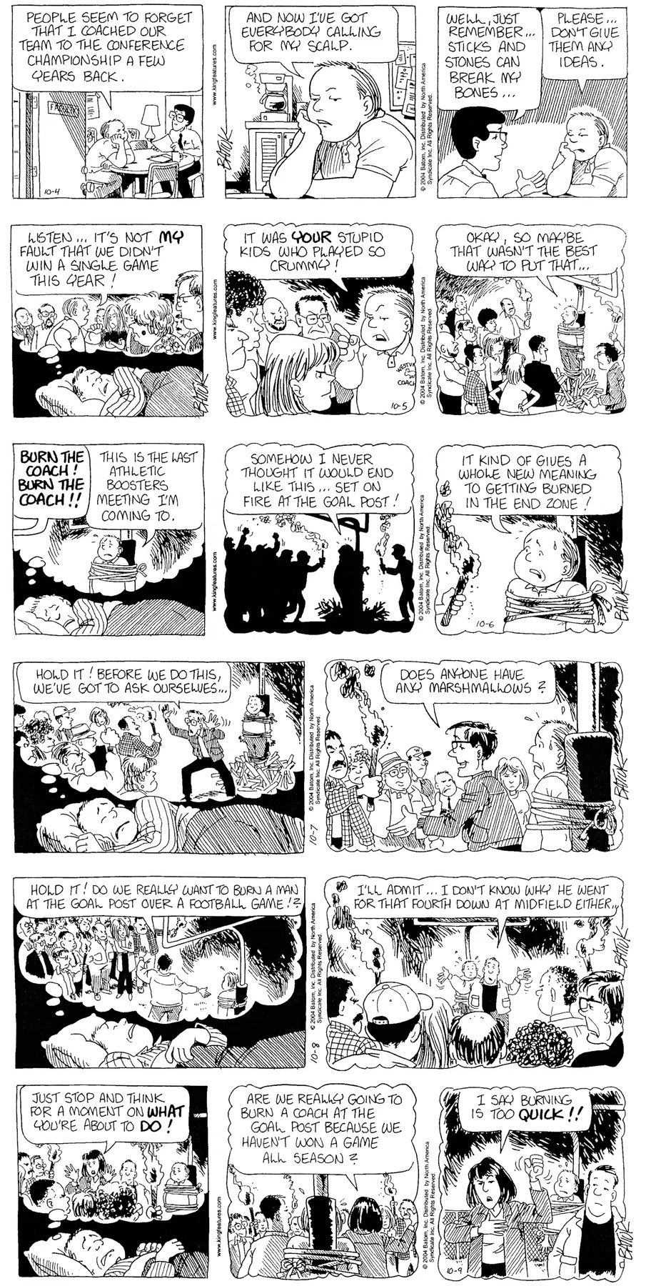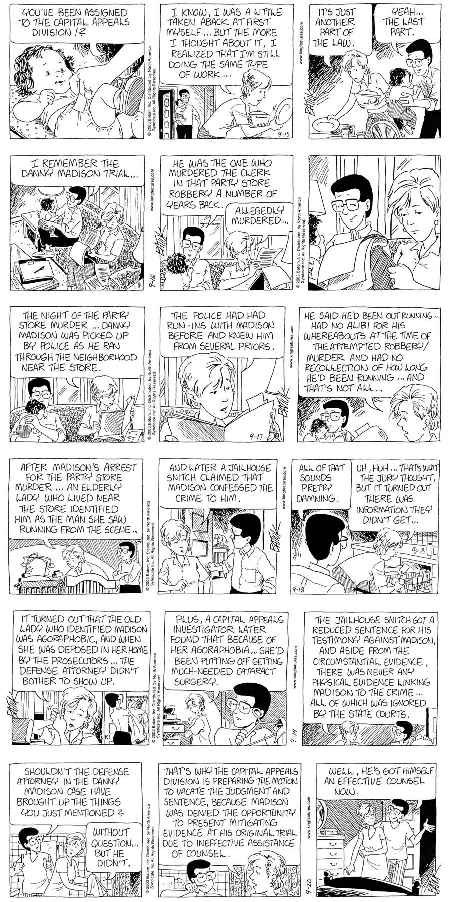 Last time, Funky went to rehab and AA to deal with his alcoholism and while initially things seemed to be turning around in his marriage, 9/11 happened. Cindy's reporting on it made her realize that New York was where she wanted to be and so she signed a new contract without telling Funky who was pissed when he found out. At that point, they were officially separated and all that was left was to work things out with the lawers... except that Cindy's side was demanding partial ownership of Montoni's. Things continued going swimmingly for both Winkerbean men when Wally was shipped off to Afghanistan and soon after, his helicopter was hit by a Stinger and he was listed as MIA.