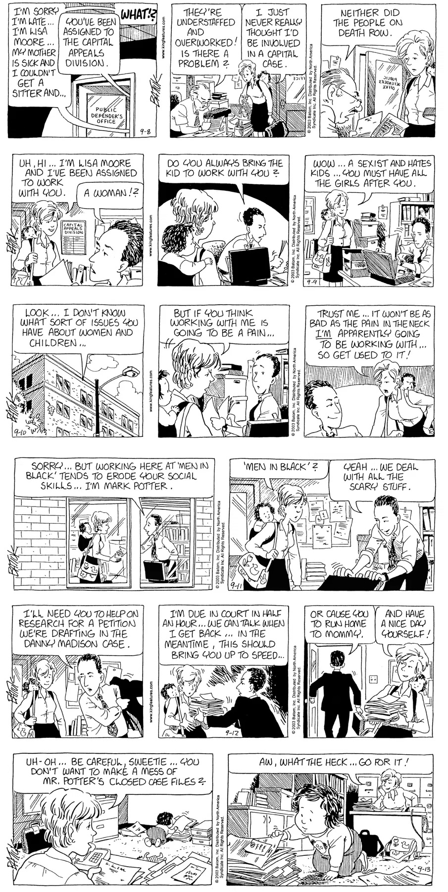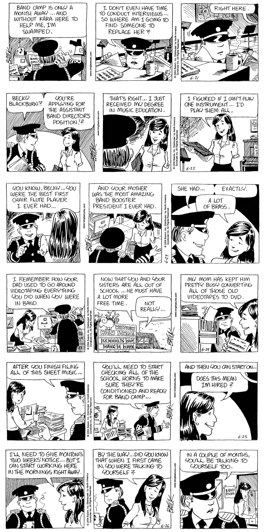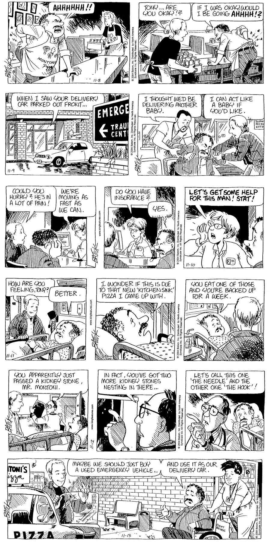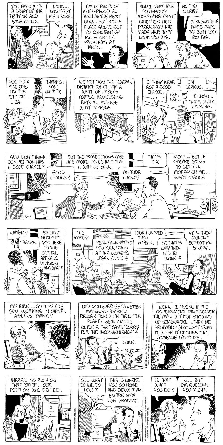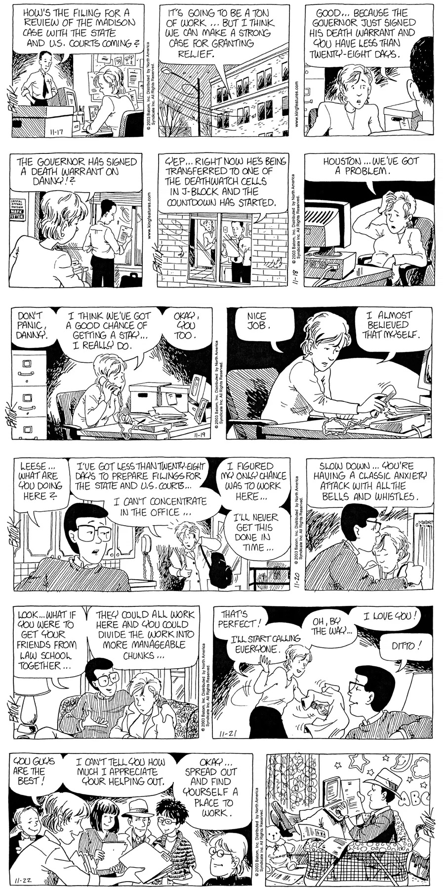 Last time, Funky went to rehab and AA to deal with his alcoholism and while initially things seemed to be turning around in his marriage, 9/11 happened. Cindy's reporting on it made her realize that New York was where she wanted to be and so she signed a new contract without telling Funky who was pissed when he found out. At that point, they were officially separated and all that was left was to work things out with the lawers... except that Cindy's side was demanding partial ownership of Montoni's. Things continued going swimmingly for both Winkerbean men when Wally was shipped off to Afghanistan and soon after, his helicopter was hit by a Stinger and he was listed as MIA.
