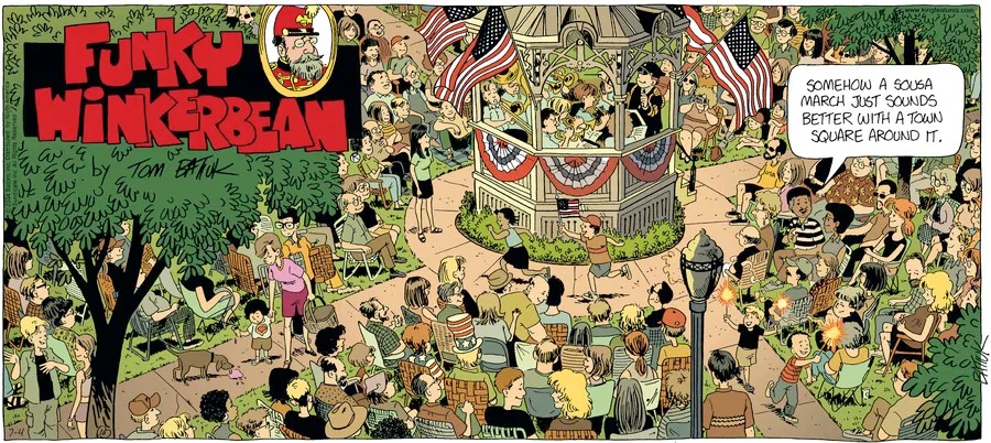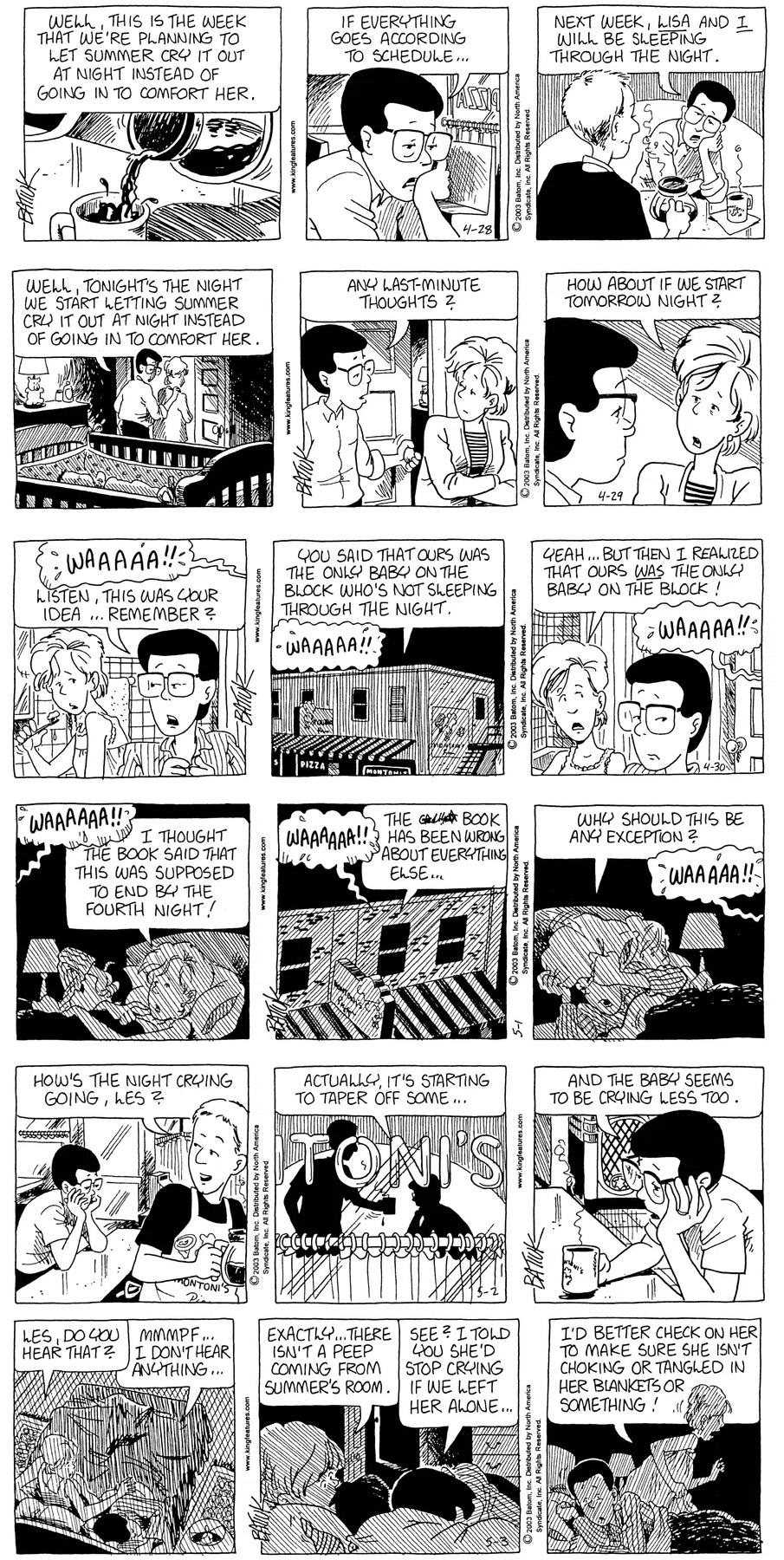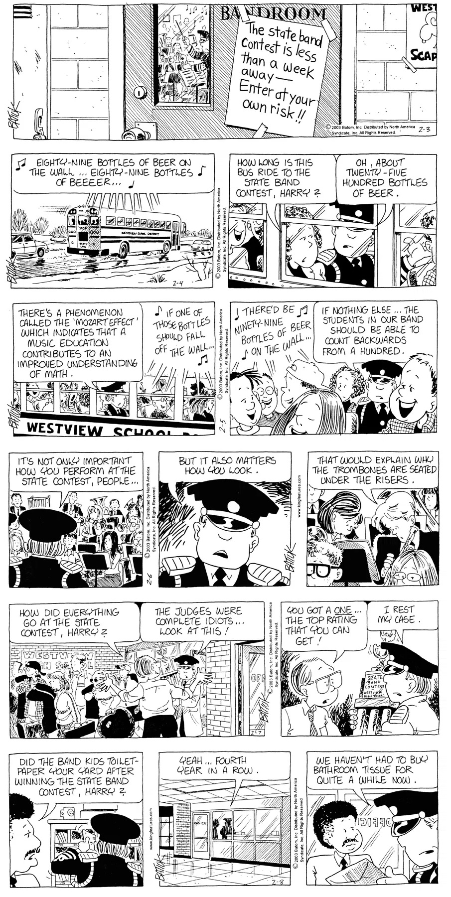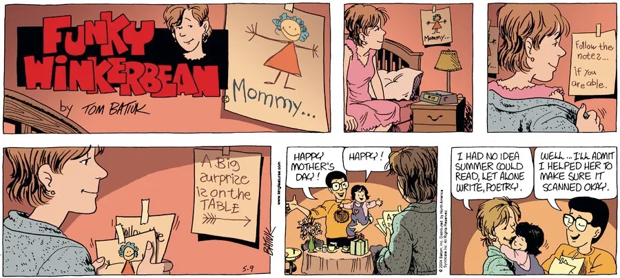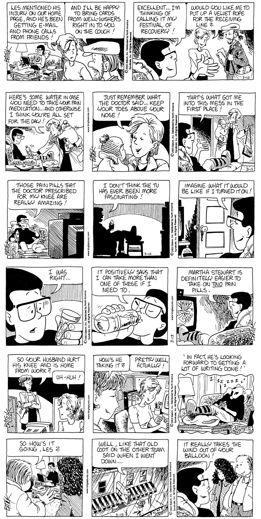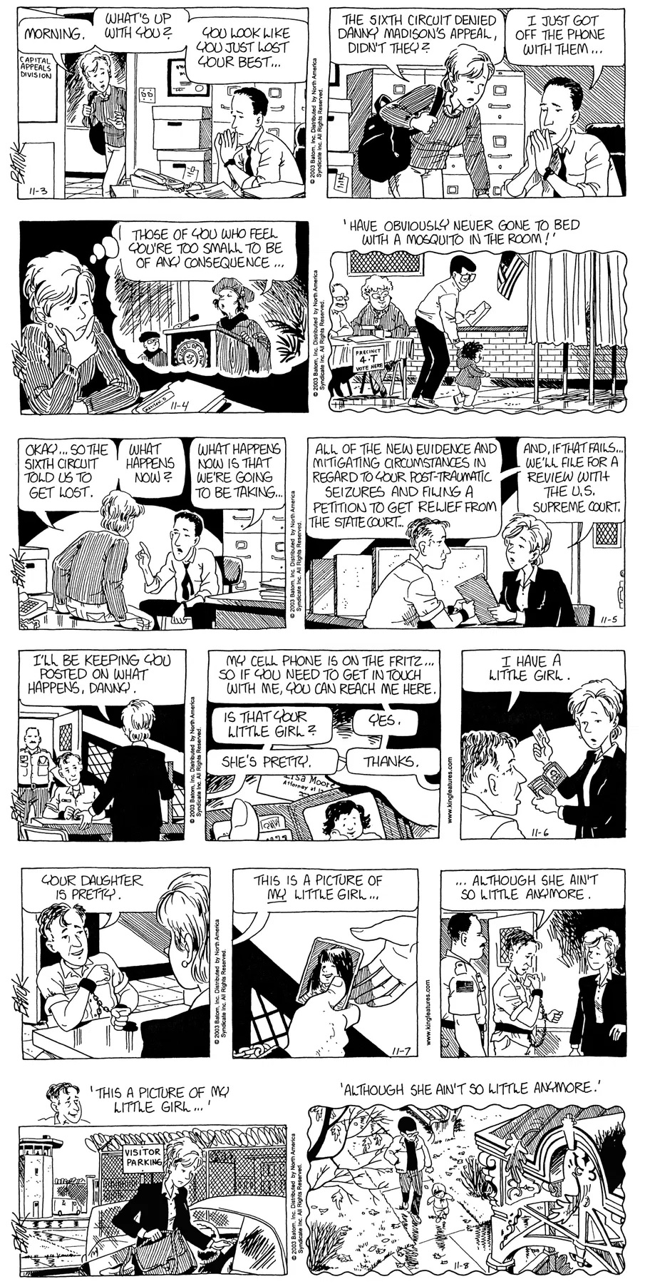 Last time, Funky went to rehab and AA to deal with his alcoholism and while initially things seemed to be turning around in his marriage, 9/11 happened. Cindy's reporting on it made her realize that New York was where she wanted to be and so she signed a new contract without telling Funky who was pissed when he found out. At that point, they were officially separated and all that was left was to work things out with the lawers... except that Cindy's side was demanding partial ownership of Montoni's. Things continued going swimmingly for both Winkerbean men when Wally was shipped off to Afghanistan and soon after, his helicopter was hit by a Stinger and he was listed as MIA.