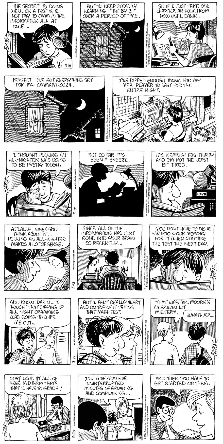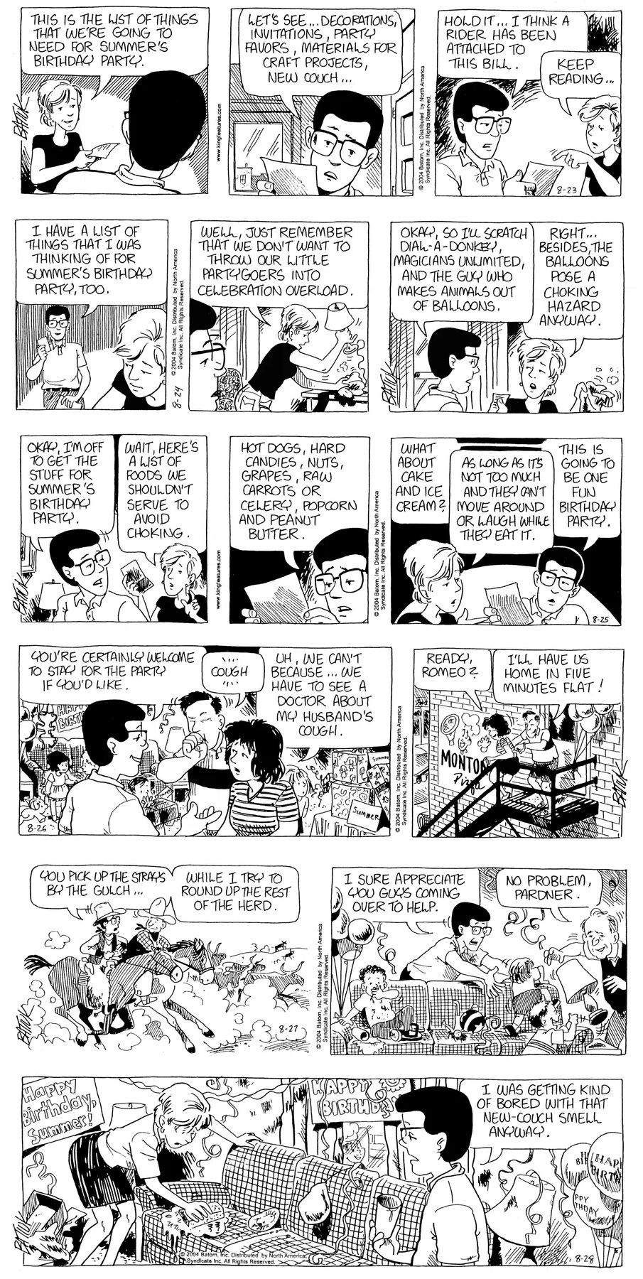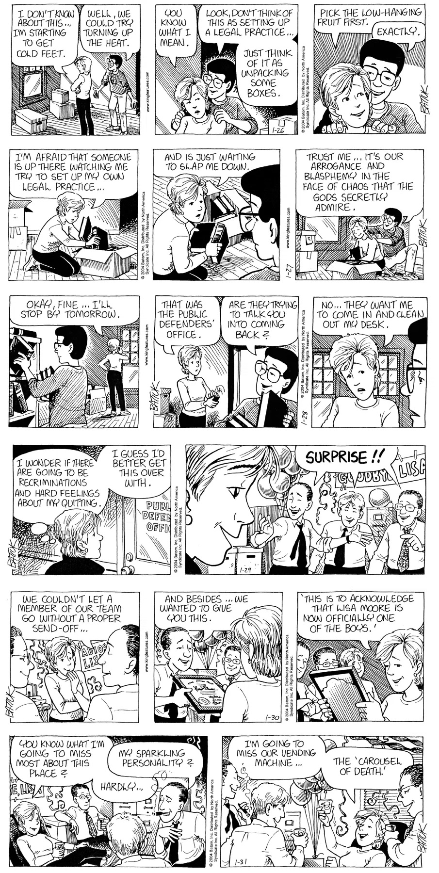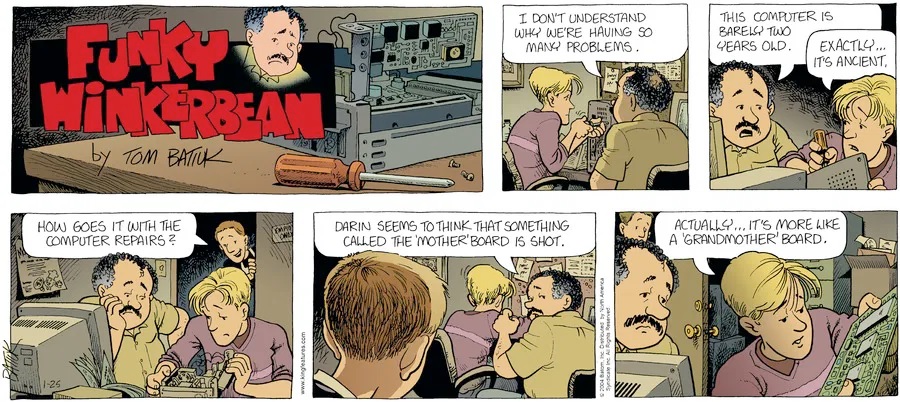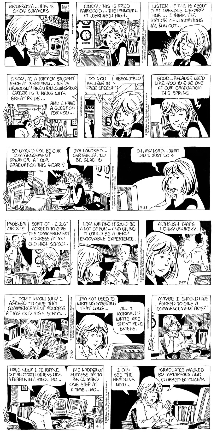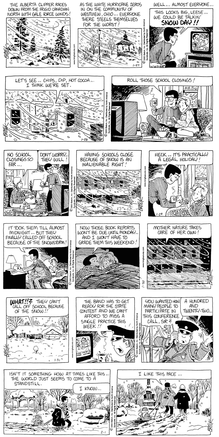 Last time, Funky went to rehab and AA to deal with his alcoholism and while initially things seemed to be turning around in his marriage, 9/11 happened. Cindy's reporting on it made her realize that New York was where she wanted to be and so she signed a new contract without telling Funky who was pissed when he found out. At that point, they were officially separated and all that was left was to work things out with the lawers... except that Cindy's side was demanding partial ownership of Montoni's. Things continued going swimmingly for both Winkerbean men when Wally was shipped off to Afghanistan and soon after, his helicopter was hit by a Stinger and he was listed as MIA.