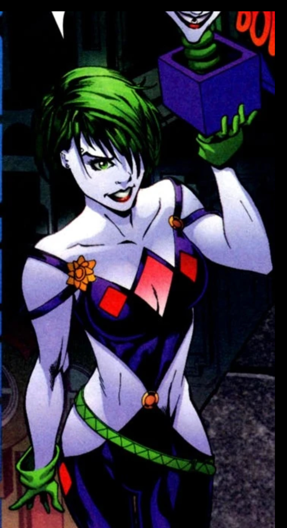 DC walked back on a lot of changes for more popular characters (Tim not being Tim, Dick being a friendless loser, Clois not being together, etc), but a lot of B to Z list characters weren't so lucky.Duela Dent was a harmless (if really annoying) cute clown girl who just pretended to be the daughter of various Batman villains precrisis before she was made into the daughter of Earth 3 Jokester and Three Face post Infinite Crisis. She was a tertiary Teen Titans character precrisis and post IC.In new 52 she's some random edgy Joker fangirl who finds his face and eats a piece of it before stapling it to her own face.To fix her I would use the Card Queen name even if it's less popular/identifiable because Joker's Daughter has too much baggage now. I'd keep the Earth 3 shit (Jokester and Three Face's daughter) for a tragic backstory. And I'd have her take Bette's place on pre-NTT Titans history since nobody cares about Bette and DC is determined to have Babs be the first Batgirl. Just have her think Robin is cool and want to be his friend but he finds her annoying. A cute annoying clown girl would stick out from the motherly Donna, intelligent Bumblebee, and mysterious Lilith. And keep this outfit because it's her best one. Maybe have her keep the pink hair and change the purple in the outfit to pink to further separate her from Joker.