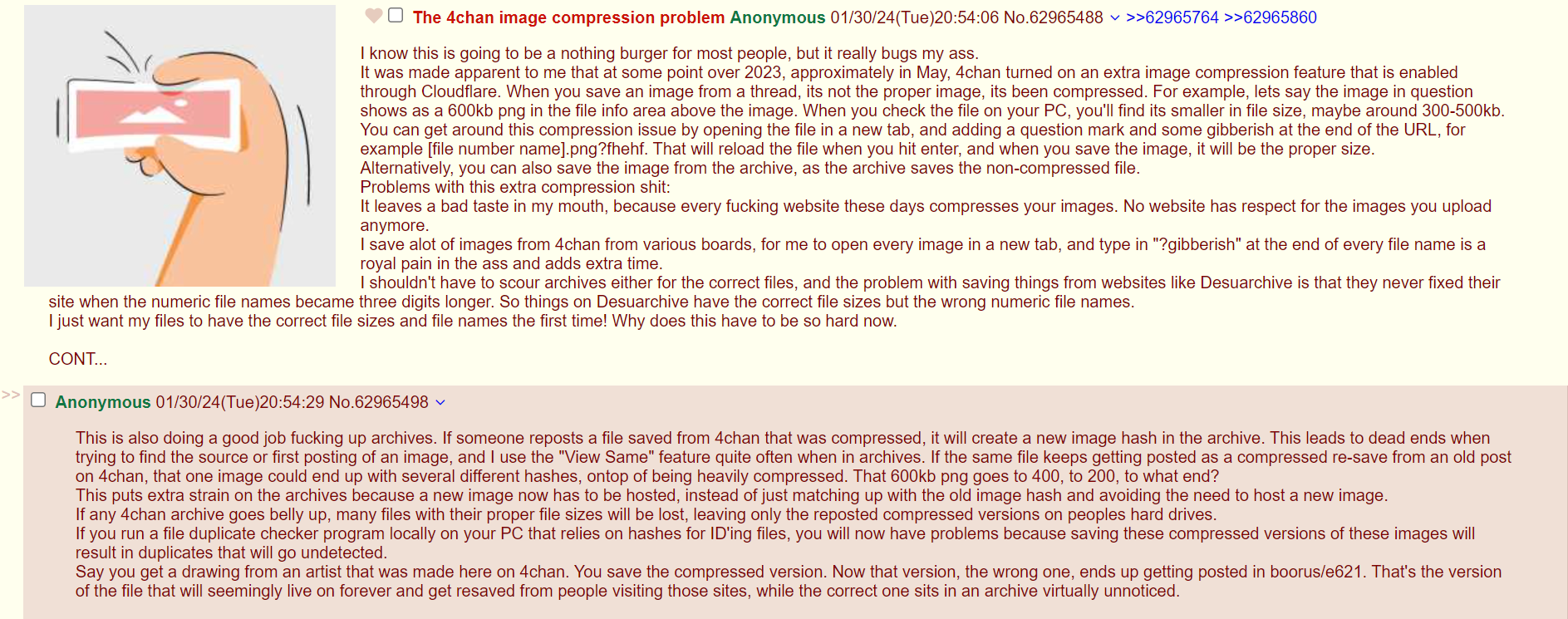 >>151754508For several years now Cloudflare was serving people extra compressed copies of images, and to save the original files (as uploaded) you now have to jump through one or two hoops.