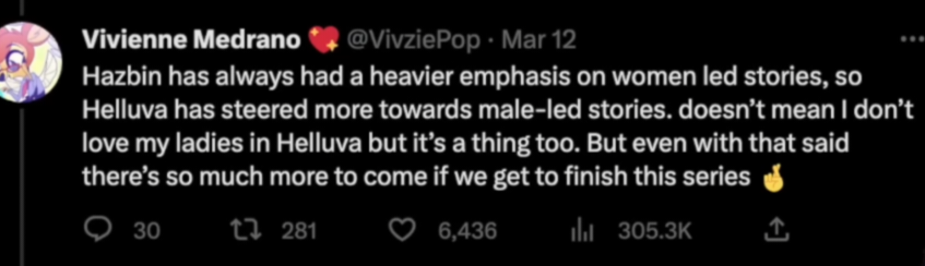 >>151769977Female-focused as in, Viv said in some tweet that Helluva is about the male cast while Hazbin would have focused on the girls. Which is clearly false since Charlie is a complete nothingburger in her own show, and Vaggie is just her tardwrangler gf despite having a potentially very interesting role and backstory as a fallen angel.
