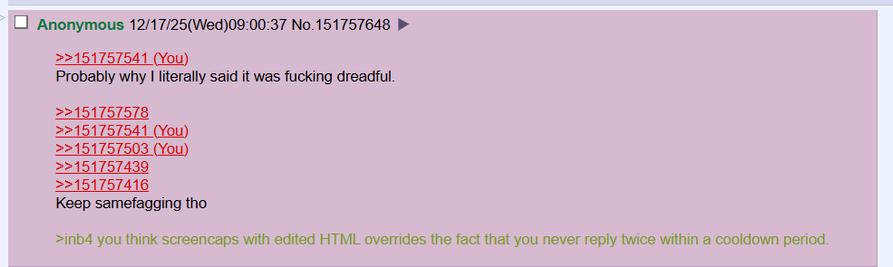 >>151757541Probably why I literally said it was fucking dreadful. >>151757578>>151757541>>151757503>>151757439>>151757416Keep samefagging tho>inb4 you think screencaps with edited HTML overrides the fact that you never reply twice within a cooldown period.