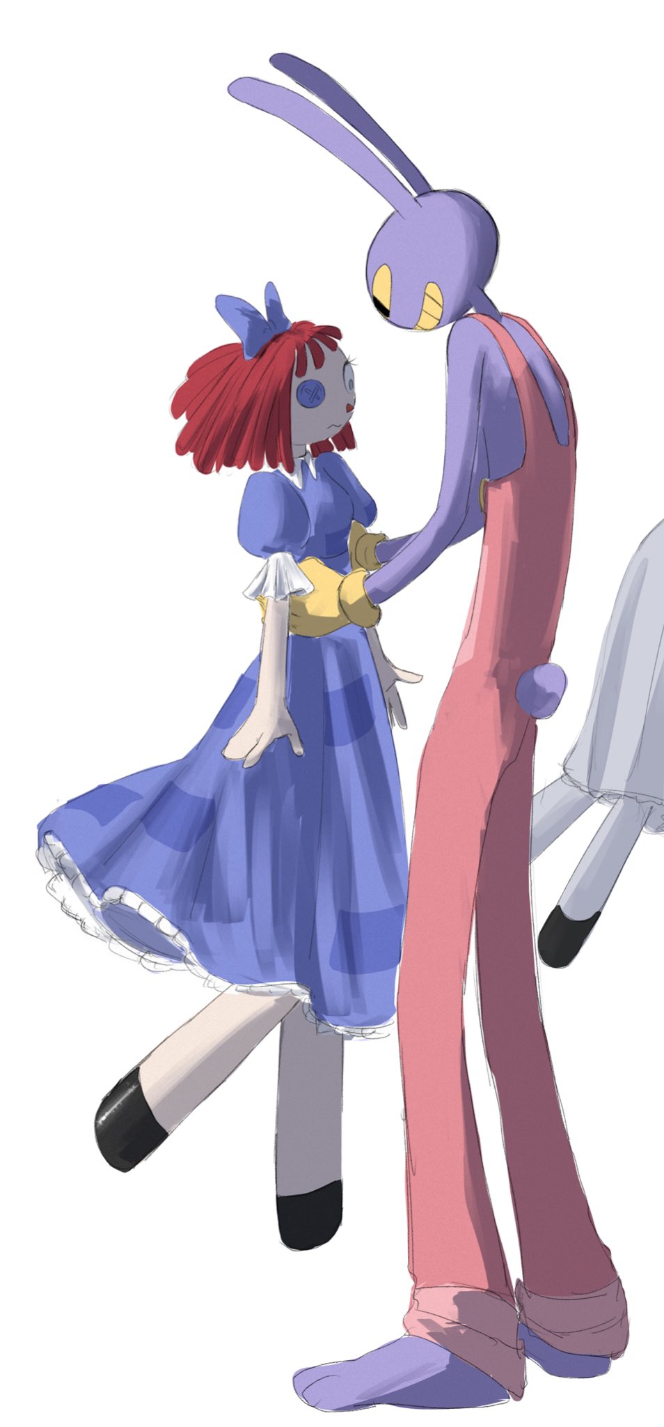 >>151783524Here they are lined up in the pilot. Looks like Rags' bow has always been about shoulder-height with Jax. However, in your image, Ragatha is standing in front of Jax, so it's not quite a level comparison.