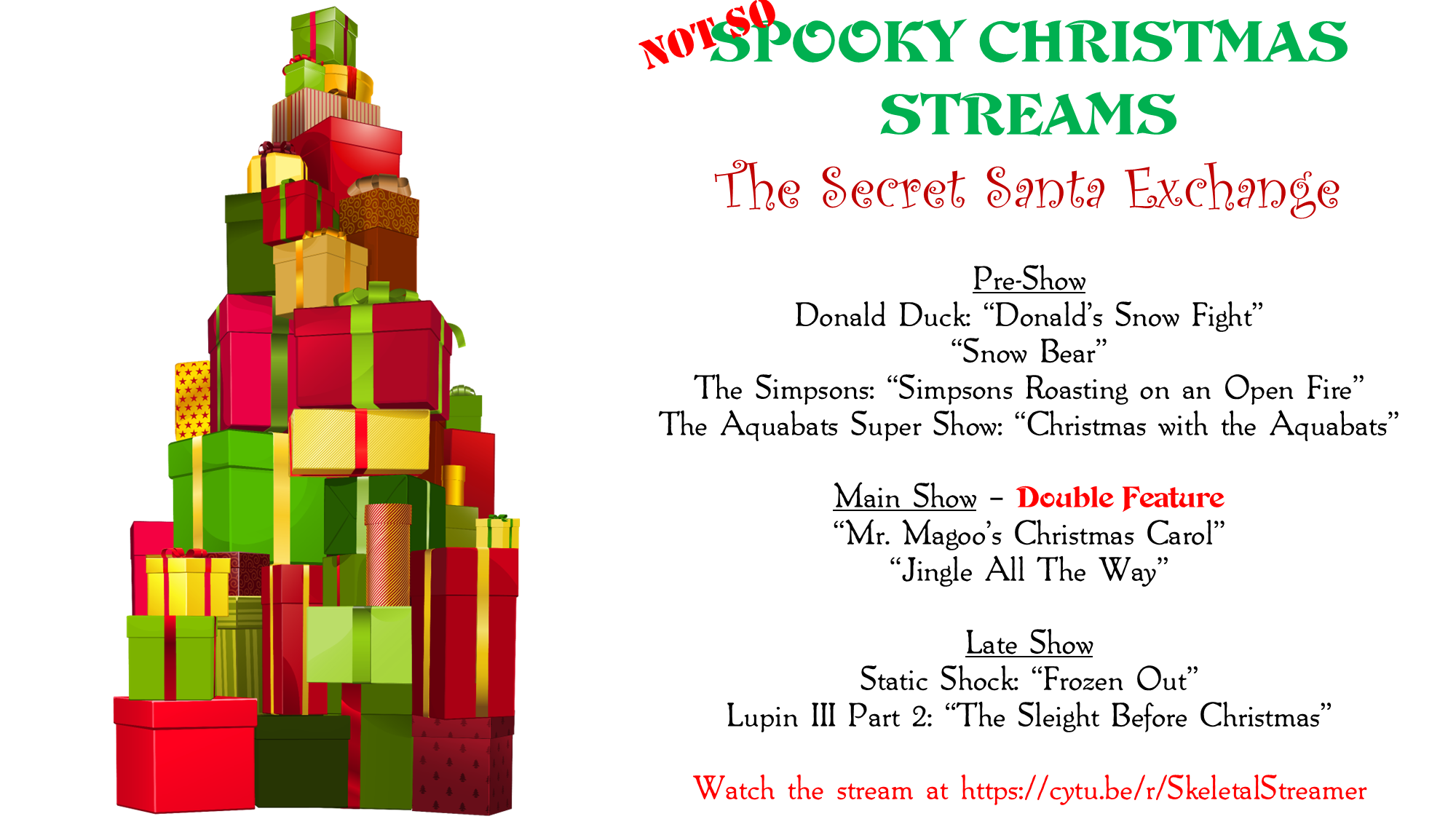 TONIGHT ON A NOT SO SPOOKY CHRISTMAS STREAMThrough nearly every thread, we’ve collected viewer submissions for a special stream. Tonight is our personal gift to (You). First, an extra long pre-show, including a classic Donald Duck cartoon, a brand new handdrawn tale of a lonely polar bear, the debut episode and Christmas special of the Simpsons, and the incredible battle of wits between the Aquabats and Krampus! Our first requested movie stands out as the very first animated Christmas special ever shown on television! The stars of UPA, Mister Magoo and Gerald McBoing-Boing, play star roles in a Broadway version of Dickens’ most famous tale. It’s MR. MAGOO’S CHRISTMAS CAROL!Next, a true time capsule of the 90s, Arnold Schwarzenegger stars as a bumbling father whose relationships are on the rocks. He has one true chance to make Christmas perfect for his son, and that’s by somehow finding the most popular and scarce toy on the market…the Turbo-Man action figure, in JINGLE ALL THE WAY!To conclude tonight’s festivities, first, electrifying superhero Static finds himself divided between Christmas with his family, and the emergence of a young, homeless meta-human. Finally, master thief Lupin III and his friends spend the holiday planning to intercept a rare bottle of Napoleon’s wine as it is gifted to the President.Stream Link: cy(delete this part)tu(DOT)be(slash)r(slash)SkeletalStreamer