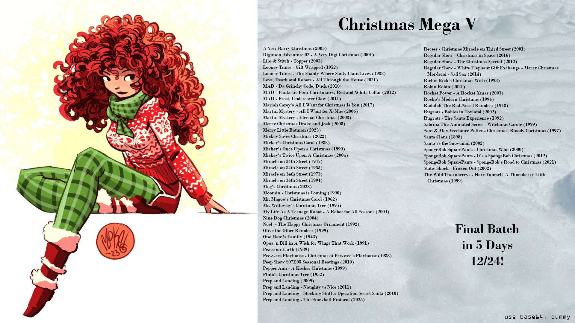 >>151767794Day 18The Santa Claus BrothersAnnabelle's WishArthur's Perfect ChristmasThe Magic School Bus Family Holiday SpecialThe Berenstain Bears Christmas TreeThe Smurfs: The Smurfs' Christmas Special, 'Tis The Season To Be Smurfy, Baby's First Christmas, The Magic Sack Of Mr. NicholasThe Smurfs: A Christmas CarolThe Smurfs: A Smurfy Christmas, The Thirteenth DessertChristmas Comes But Once a Year (1936)Santa's Workshop (1932)The Night Before Christmas(1933)Rudolph the Red-Nosed Reindeer(1948)Chuck E. Cheese: The Christmas that Almost Wasn'tNational Lampoon's Christmas Vacation