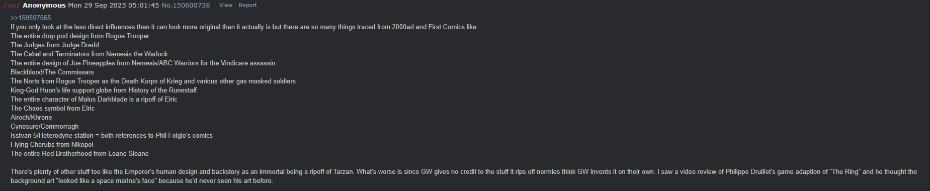 >>151788846>>151789683the culture and use of Cynosure is very different to the culture and use of Commorragh, but in any case it's wildly unlikely anybody ever ready Grimjack outside the US; it wasn't even scanned in the 1990s, and nobody in the UK was reading random import comicsagain if you think brits in the mid 1980s were reading Phil Folgio's comics you're going to have to give an issue citation and date your claim b/c that is wildly stupid otherwisecherubs, really? really? REALLY?Lone Sloane is awful but did you really think 40k ripped it off and not Pat Mills? the emperor's human design of being a human? Tarzan is immortal in what book? is that supposed to be a fucking mangled Farmer reference?