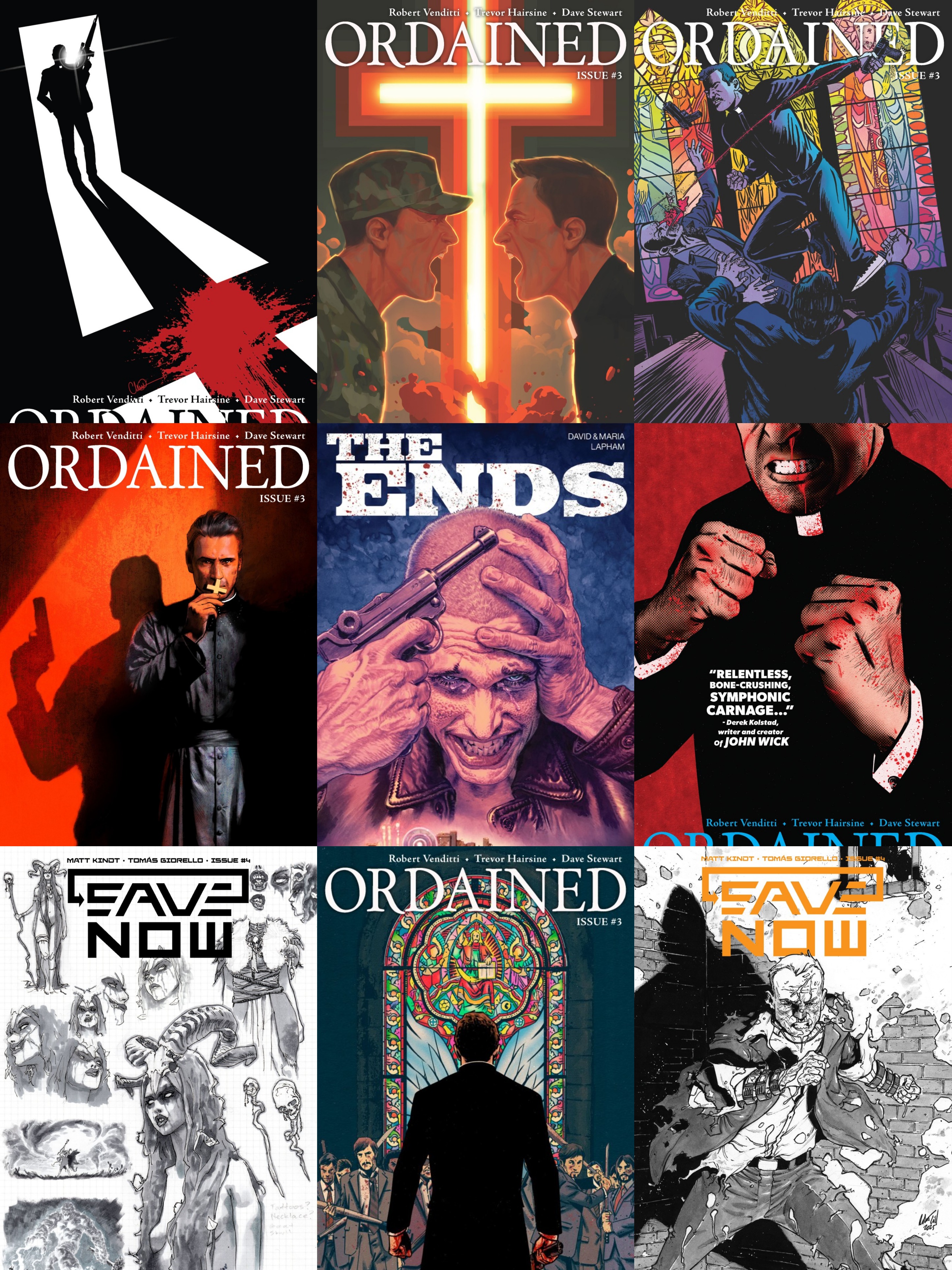 >Ordained #3New York Times bestselling writer Robert Venditti (SUPERMAN ‘78, PLANET DEATH) and powerhouse artist Trevor Hairsine (DCEASED, X-MEN) light the fuse to the explosive finale of their no-holds-barred, action spectacle.Betrayed by the men he thought he could trust, Father Roy is left bloodied and grieving the innocents caught in the crossfire of an attempted hit. Now, he’s on the hunt for the one man who can put an end to the bloodshed–and the one soul he’s desperate to save, Cormac Byrne.>The Ends TPFrom the mind of comic book national treasure and living legend, David Lapham (STRAY BULLETS), in partnership with the incredible talents of his wife, Maria Lapham, and powerhouse colorist Bill Crabtree (INVINCIBLE) comes a critically-acclaimed modern masterpiece, now widely available in breathtaking color for the very first time in this stunning new collection.It’s 1985 and Jennifer End and Angelo Rodriguez are deeply in love. But Jennifer can never reveal their relationship to their family. The Ends are considered by some to be traditional, but by most, they are known as intolerant, discriminatory, and bigoted>Save Now #4THE END IS HERE. New York Times bestselling writer Matt Kindt (BRZRKR) and visionary artist Tomás Giorello (PLANET DEATH) push Saver to his absolute limit in the scorching finale to the year’s heart-wrenching, sci-fi epic. The world has ended. Integrity International is dead. Saver stands alone, stranded in the burning wreckage of a doomed future and drowning in the blood of the countless lives he could not save. His daughter January hasn’t lost hope. Together they uncover the key to reversing the apocalypse once and for all. But Saver is old and broken—a shot at redemption could mean making the ultimate sacrifice. To change the past he’ll lose his future, but he might just SAVE NOW.