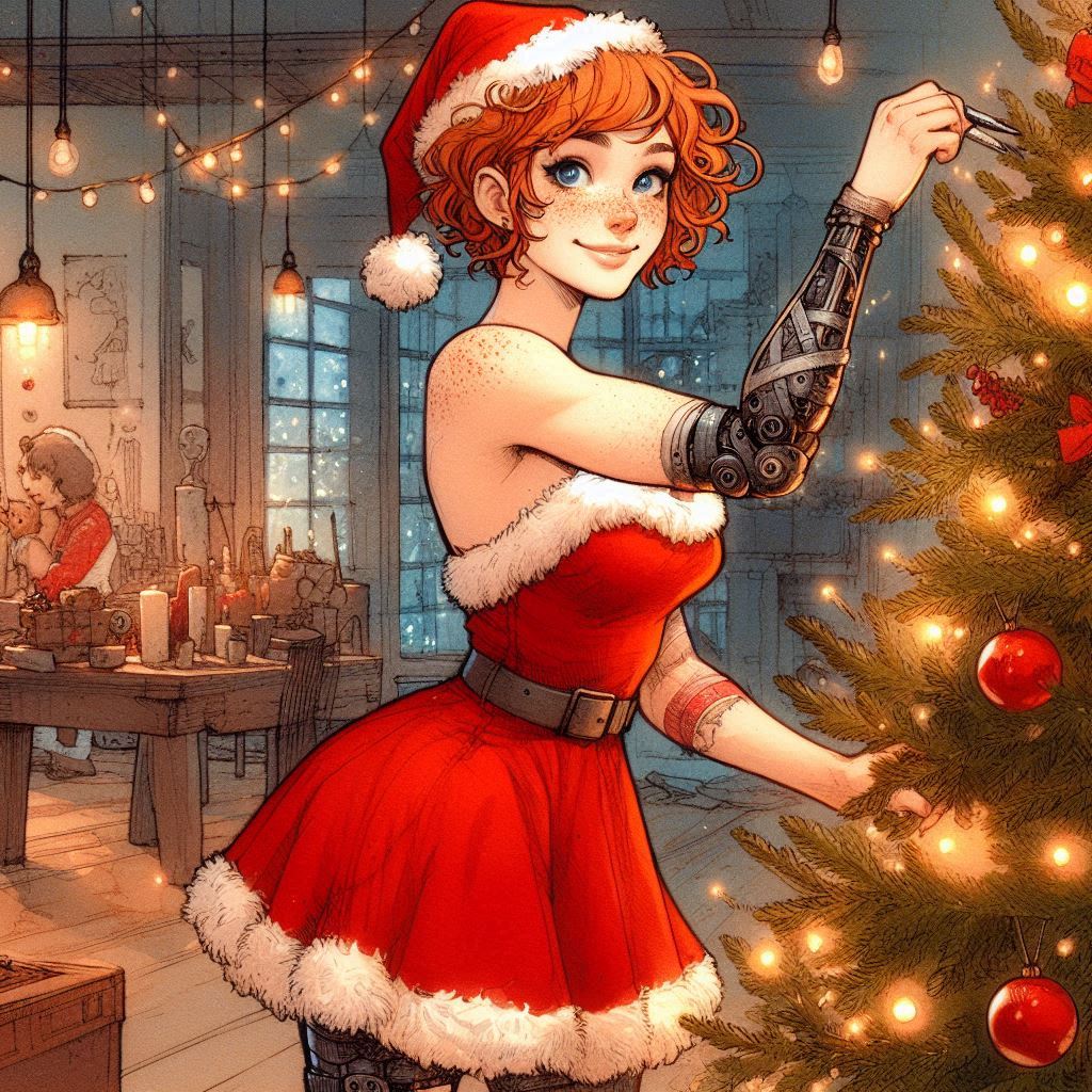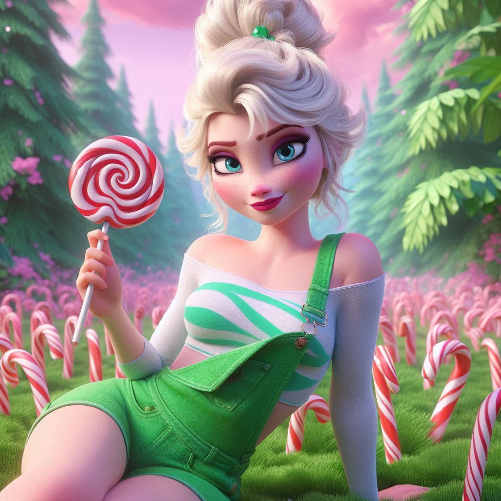 >>151813798I fiddle-with my prompts, and don't document every variance, but I think it was close to this:disney cg art, romantic fantasy scene featuring elsa (frozen) with messy hair up in a bun with a shy smile, view from the ground looking up at her, she is leaning over in a garden picking red & white candy canes from the ground. she wears a peppermint swirled loose tanktop and lime shorts overalls, with lush lime greenery around, and a pink sky with fluffy white cloudsfeel free to fiddle with it yourself and share results!
