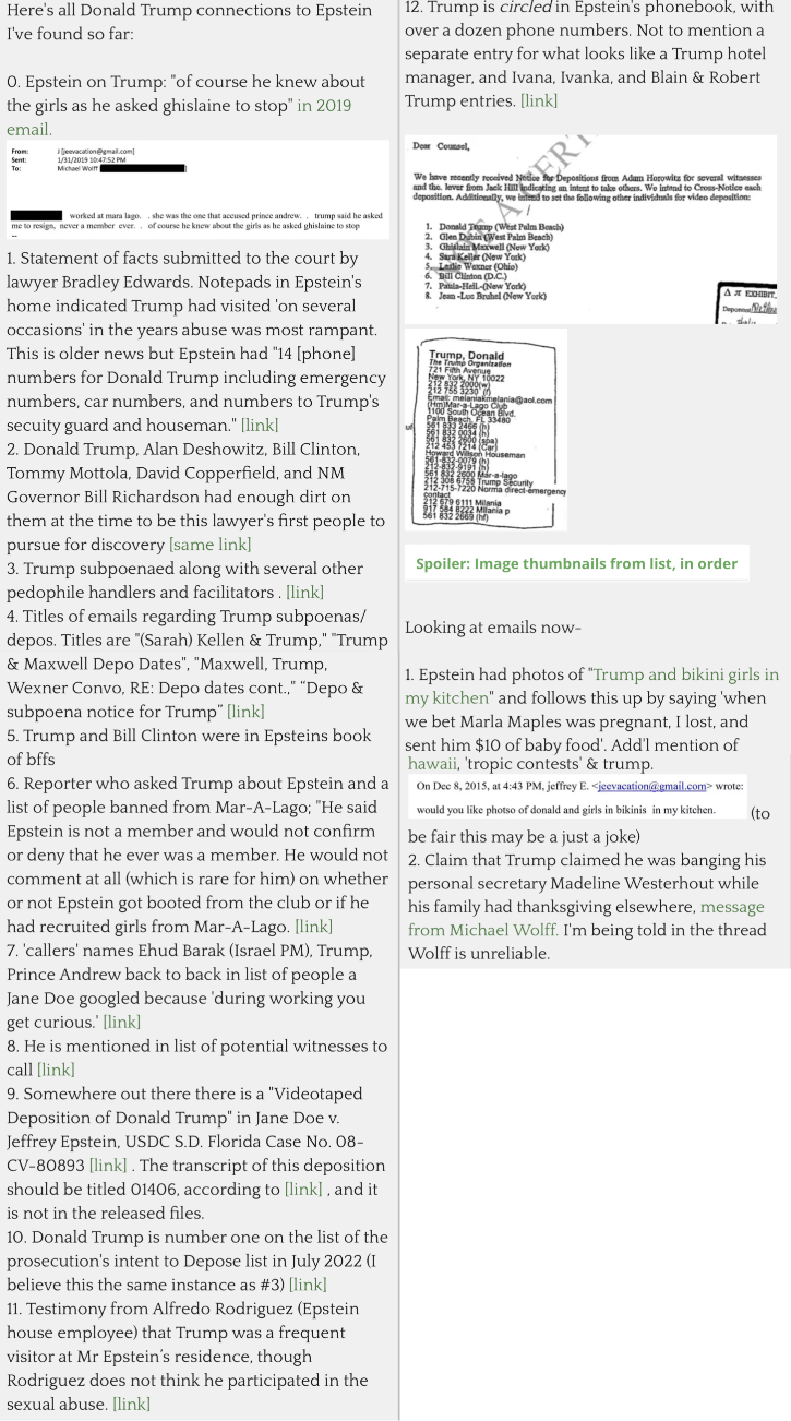 I love how none of you magatards are responding to these>>151824866>>151827256Oh well, anyways here’s a comprehensive list of all Trump-Epstein connections.