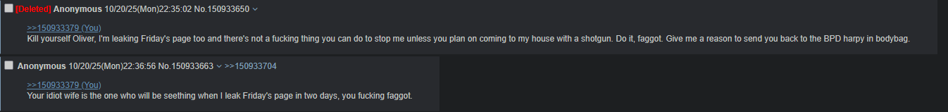 >>151829461>I-It was only a joke they weren't serious when they were having a mental breakdown and posting violent fantasies>>151829436Mentioning 4chan outside of 4chan used to be a taboo, but at the very least the sane people here should realize that no rational person would suffer potentially having people like this on their discord, especially if they're too unhinged to not keep it to themselves.