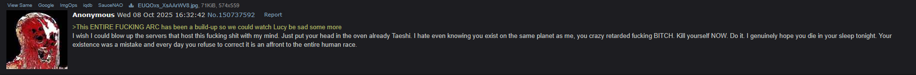 >>151829332I didnt got banned tho and I feel I can be chiller here than the discord. Just ignore the ragebaiters liek you would in any other siteHowever I did got a very funny private message from a "friend" in the discord server about why I should hang myself for disliking Lucy AND not hating Mike (the AND is important, apparently that was the forbidden combo. It was years ago tho so maybe the dude got himself banned lol)