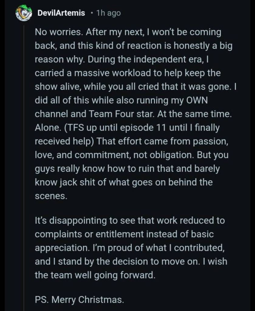 "Do you feel happy now? Thanks to your salt he quit." This is ALSO not helping. To pin the blame specifically like this feels insanely disingenuous not just because it's using a situation to attack basically an opinion but also it fails to really tackle the heart of the issue. I get where the emotion is and at least here there's nothing about this that's just passing the blame to people who worked on the episode nor is it trying to argue this is somehow not bad but still, it does not help.Also while we're at it, let's get ahead of the curve and say that we should not be calling this "drama" or a "controversy". Neither of those words with their proper description fit this.