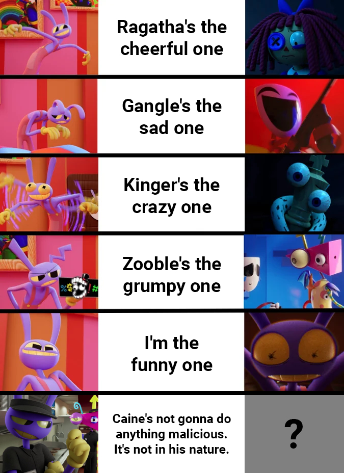 I still think Jax is right, and Caine is fundamentally not malicious. When he hurts people it's always on accident. I would love to be wrong and see an epic AM crashout though.