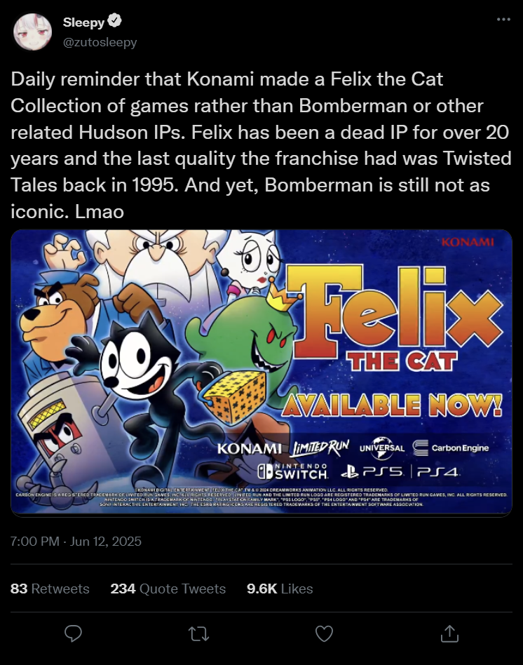 >>151898450>I would say Felix the Cat, but even he is more iconic than Bomberman.No one gives a flying fuck about Felix, he's more irrelevant than woody woodpecker