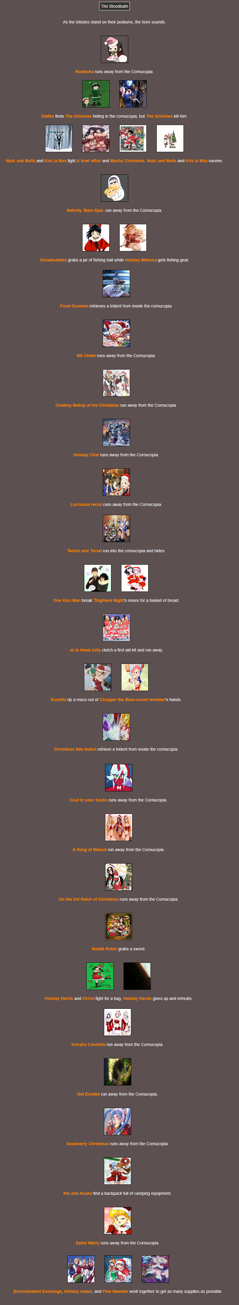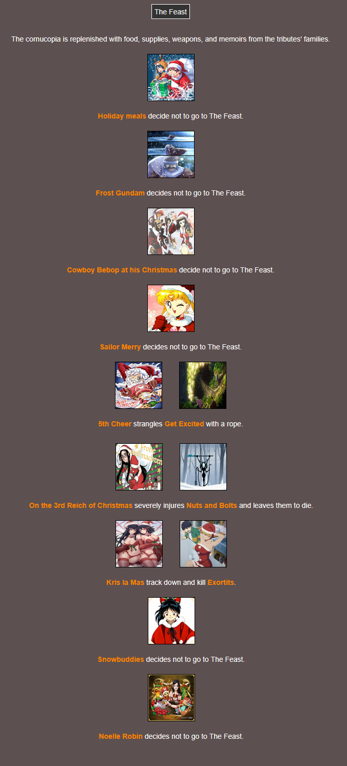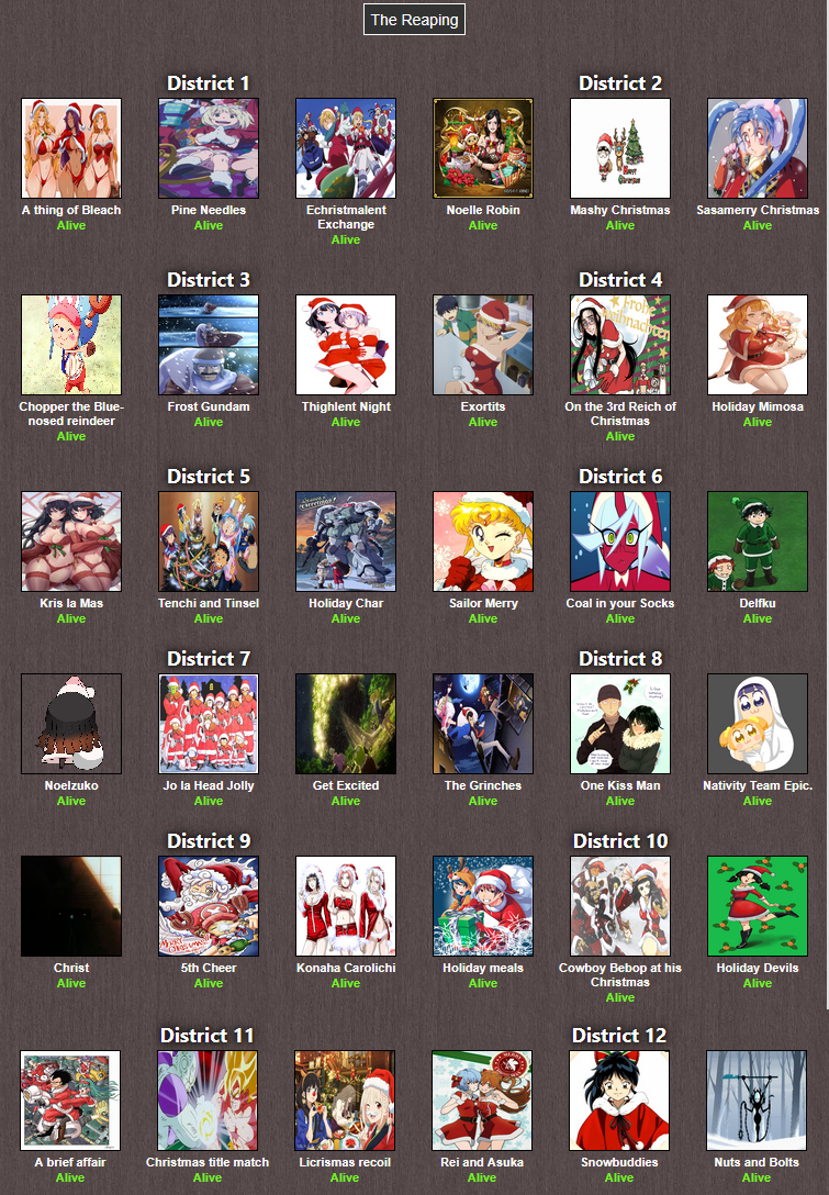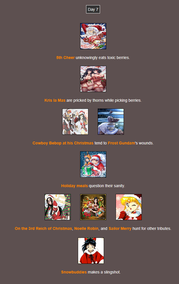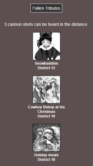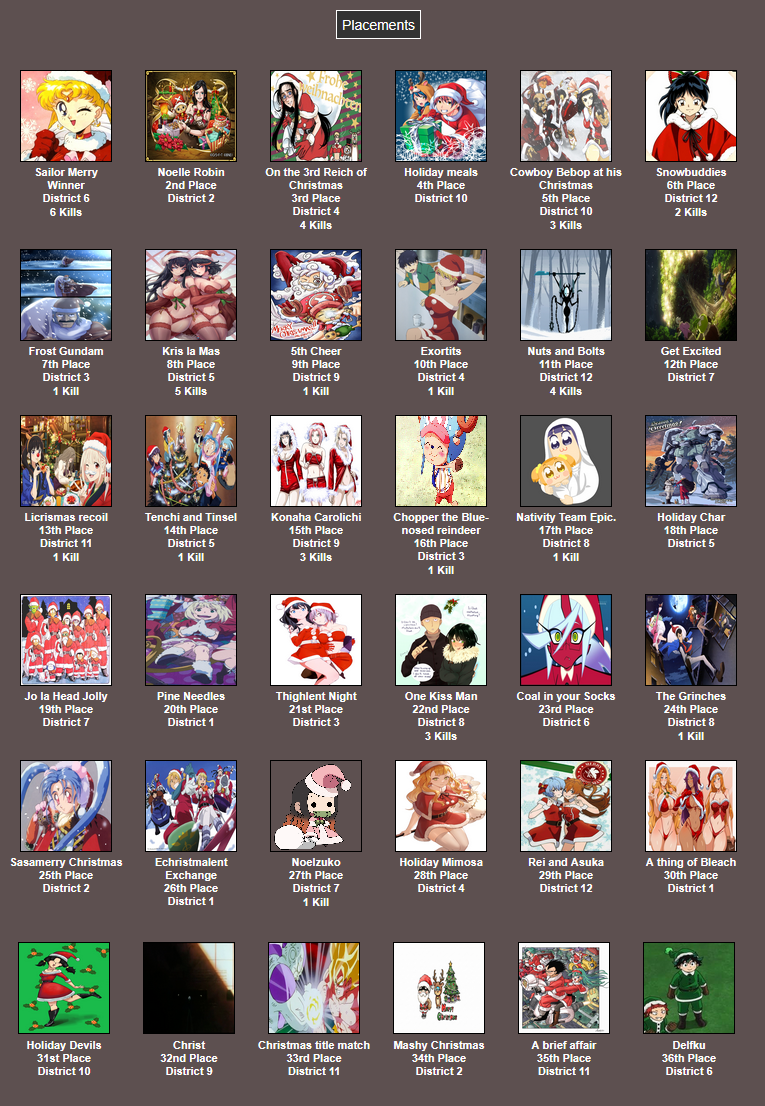 It's that time of year. Send in your Holiday tributes. Your Yuletide Victims. Your Christmas Combatants. Any Toonami characters in Christmas or Winter themed is viable. It's the holiday games!