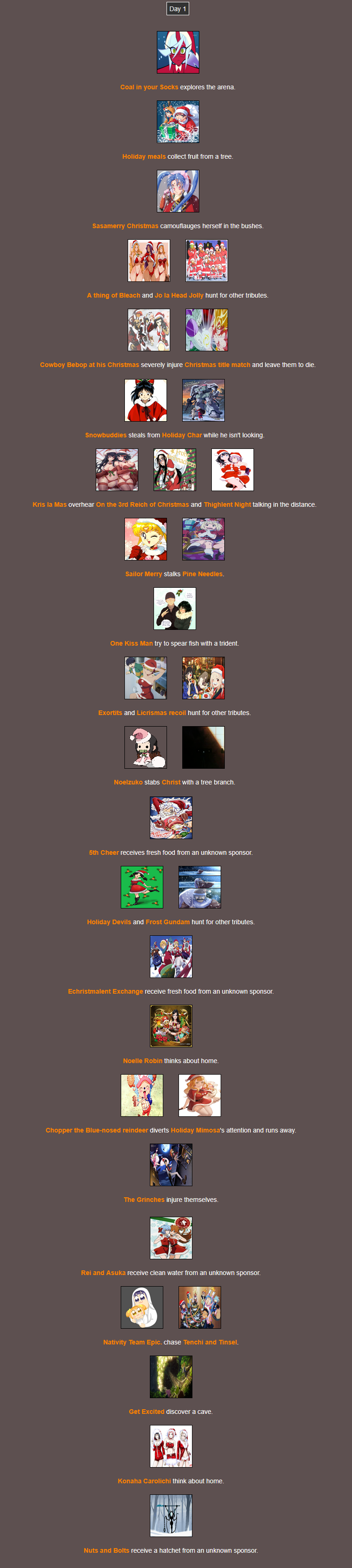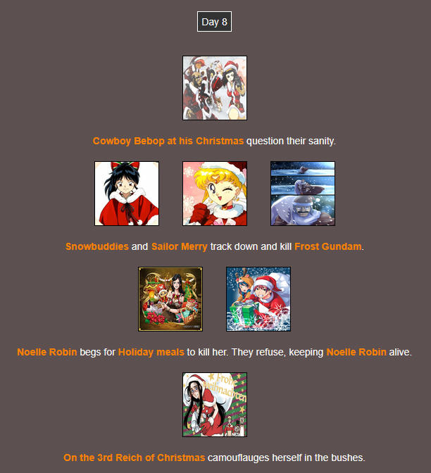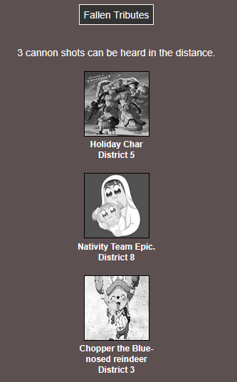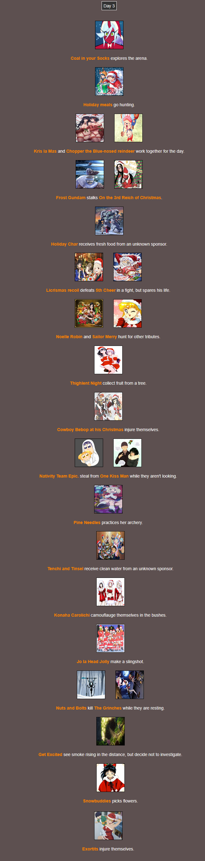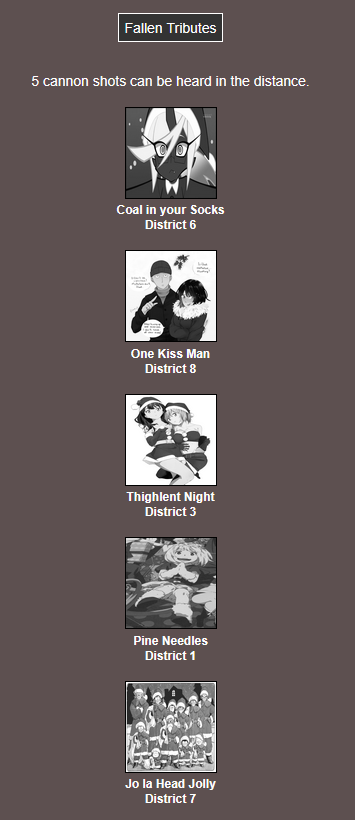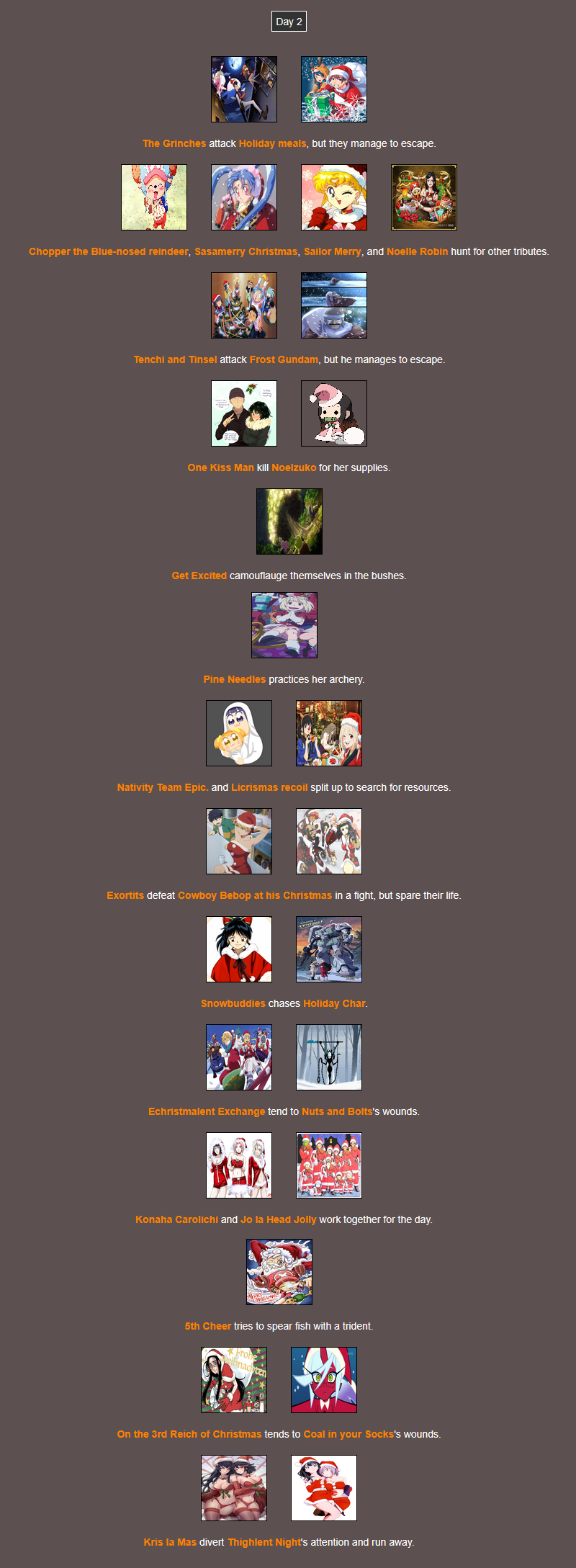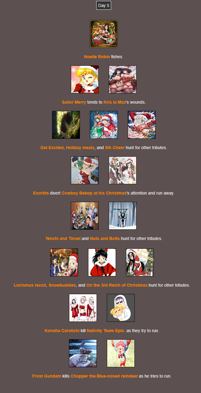 It's that time of year. Send in your Holiday tributes. Your Yuletide Victims. Your Christmas Combatants. Any Toonami characters in Christmas or Winter themed is viable. It's the holiday games!