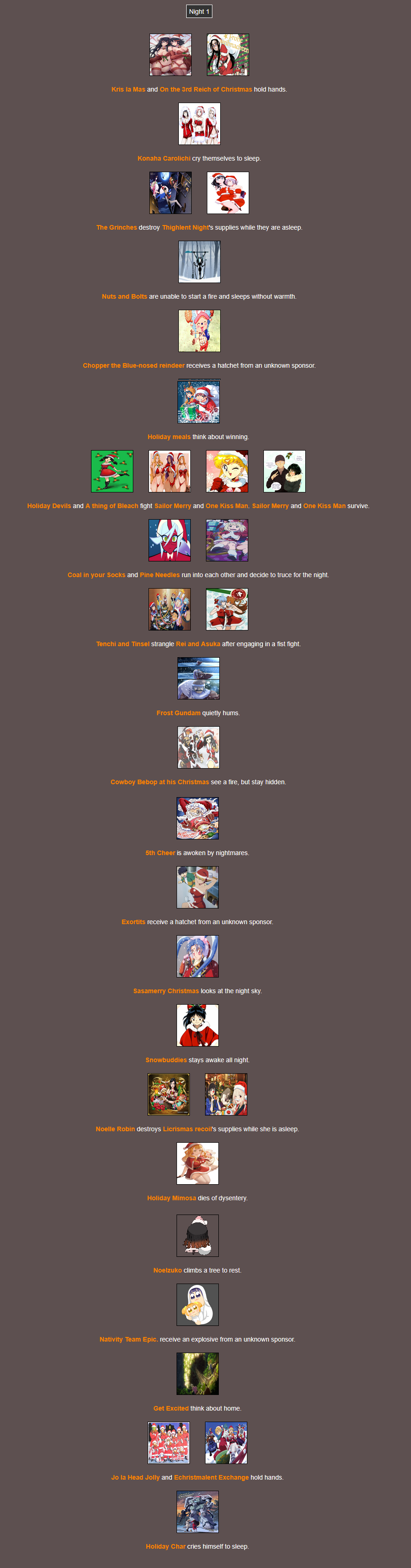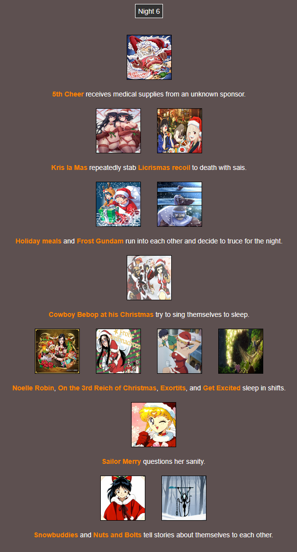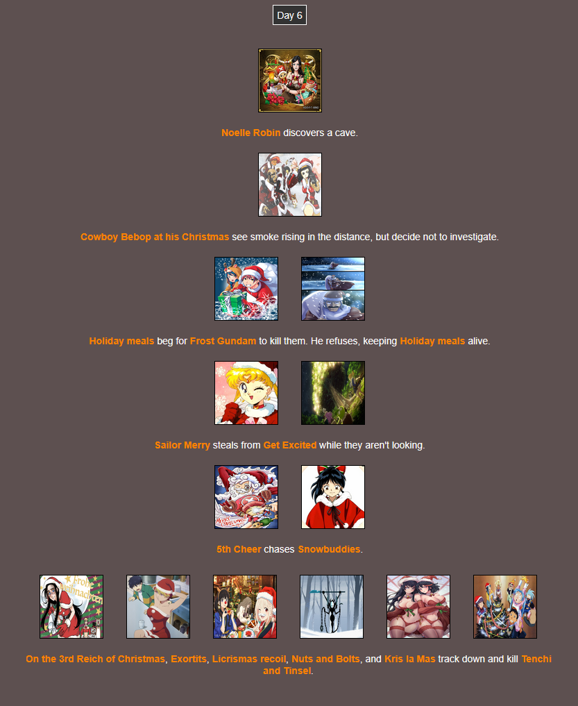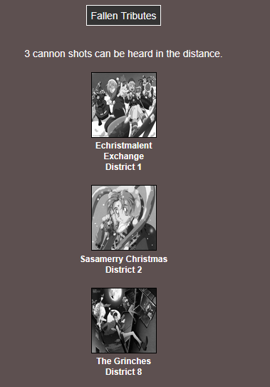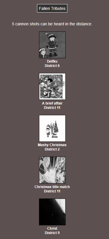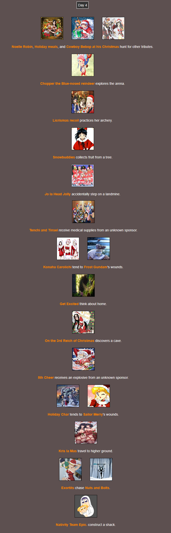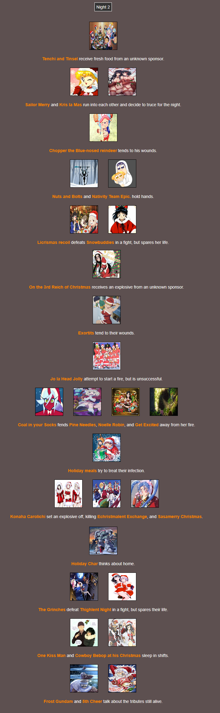 It's that time of year. Send in your Holiday tributes. Your Yuletide Victims. Your Christmas Combatants. Any Toonami characters in Christmas or Winter themed is viable. It's the holiday games!