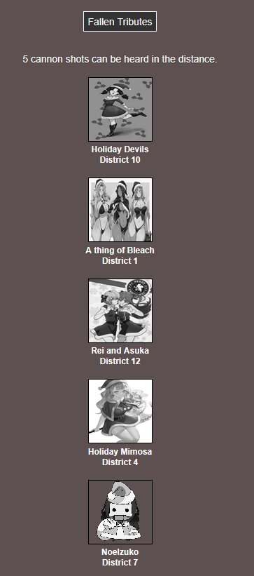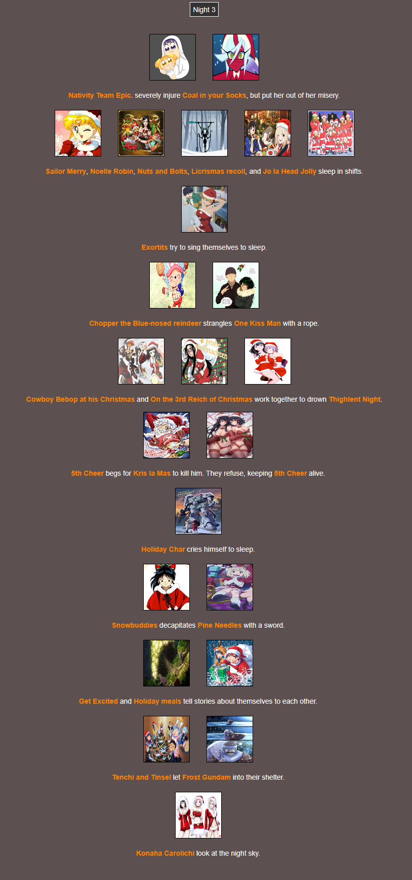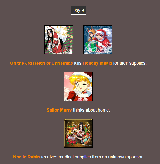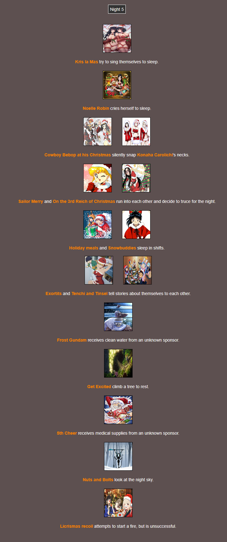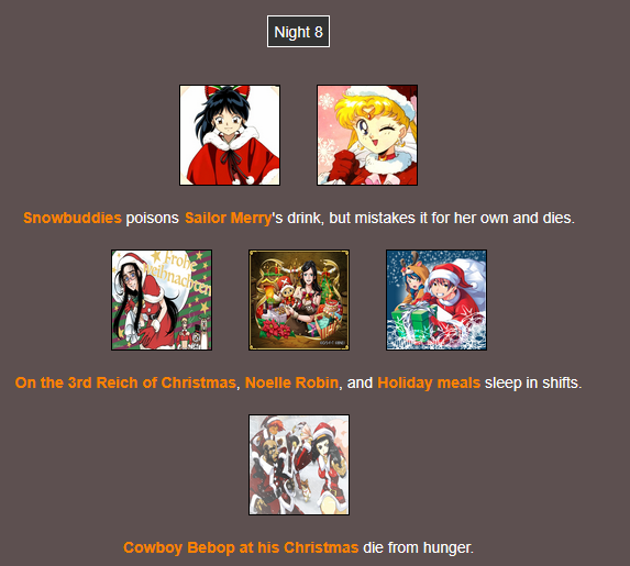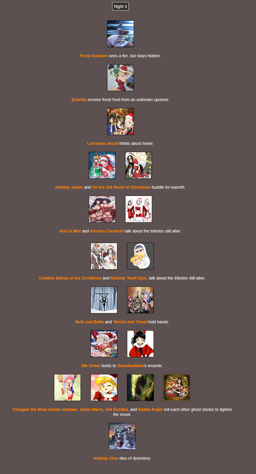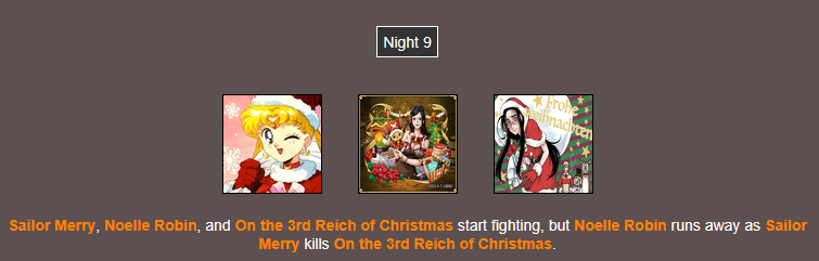 It's that time of year. Send in your Holiday tributes. Your Yuletide Victims. Your Christmas Combatants. Any Toonami characters in Christmas or Winter themed is viable. It's the holiday games!
