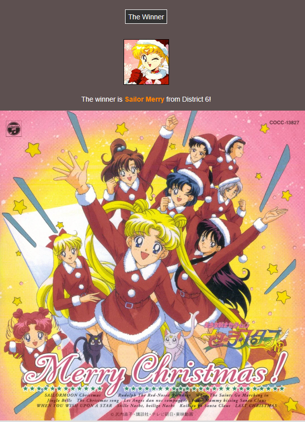 >>151907712And the winner is...https://www.youtube.com/watch?v=HNJ4nXFA_aoThis is how I find out Sailor Moon has an entire Christmas album. It was destiny.