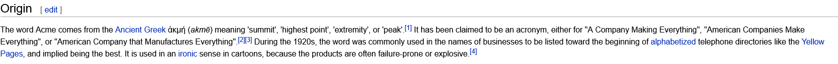 I always thought in loony tunes the name was different. Instead of the real world meaning "A Company that Makes Exelence" it was "A company that Makes Everything" the joke being ACME makes every dumb fucking thing you can think off and it's almost a mystery why a company would still be making giant catapults, jet packs and fake bird seed.