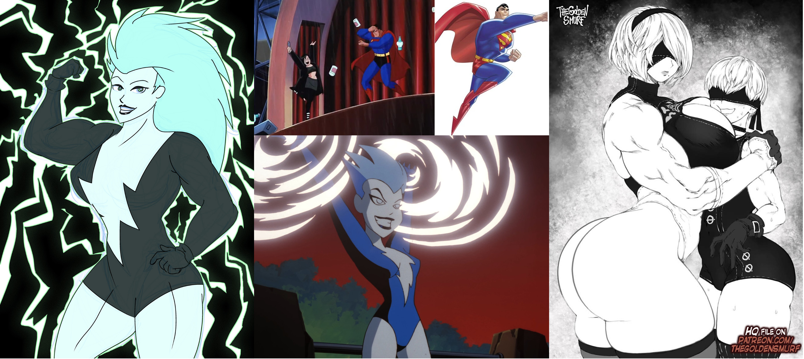 Requesting something similar to the image on the right with a gigantic Livewire with Super Saiyan 3 like hair and Superman
