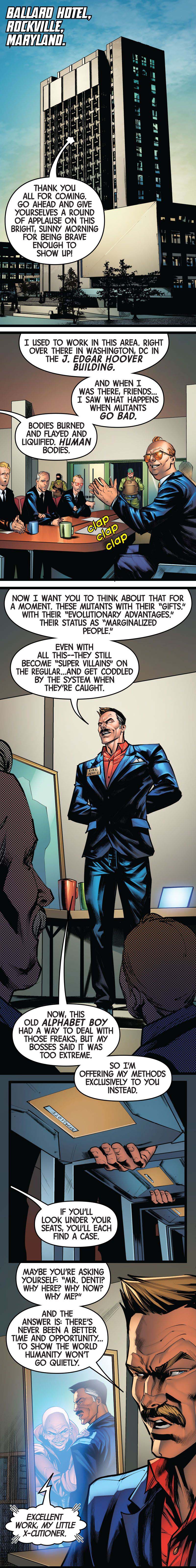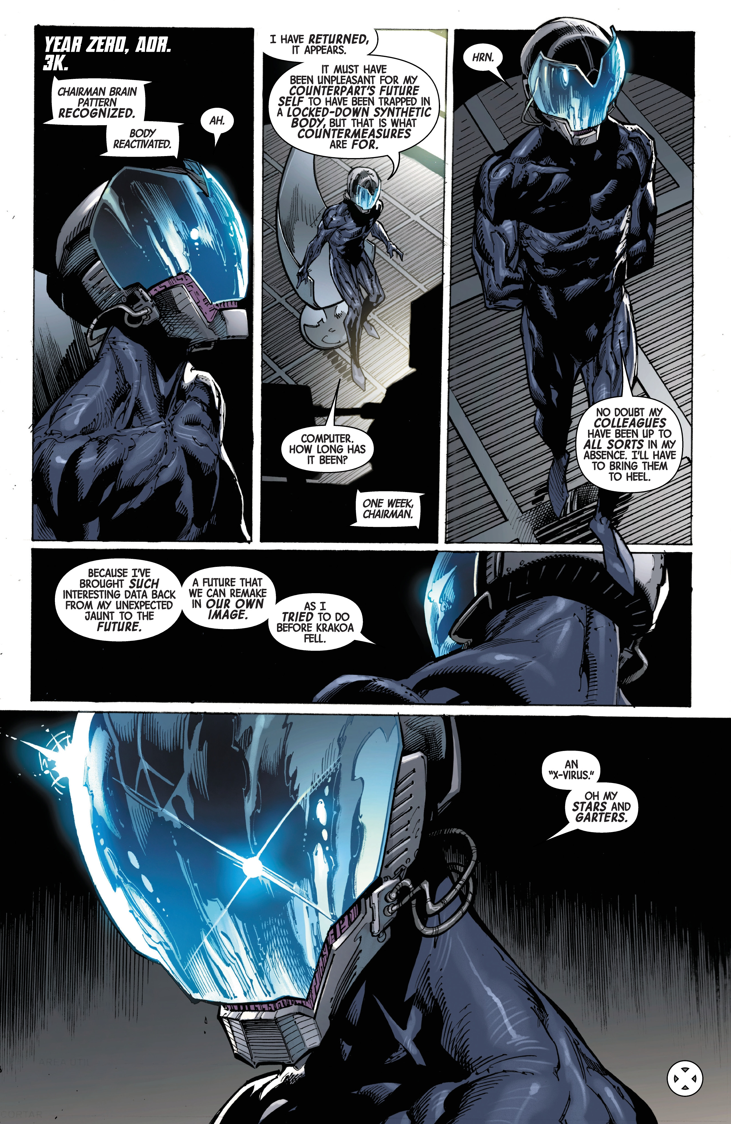 At long last, it's finally revealed: 3K's leader is none other than the original Beast! Which makes sense, since his "death" in X-Force #50 was written in a way that any writer could reveal that he survived.We'll have to see how 3K are going to try to use the X-Virus in the present to make more mutants like they used to, and what info AOR-Hank gave the X-Men.