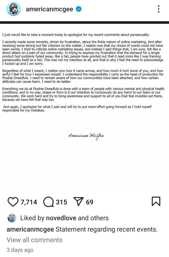 Okay, I can see why Sam or Speedy or whoever it was was probably shitting on American McGee, apparently recently he made some comments about how pansexuality was a fad and a bit earlier supported NFTs