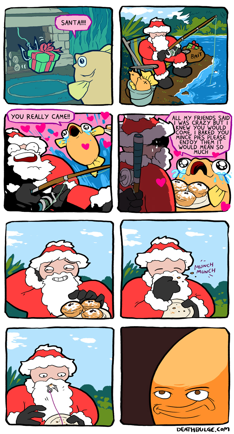 I did a deathbulge storytime a few weeks ago.A new page that came out recently:alt text:>I wonder if Santa was thinking: You know what? there's a high chance this is a trap but MAN it must have been an absolute nightmare to bake mince pies completely underwater, this masterful execution is so impressive that YOU KNOW WHAT?? SCREW IT, this fish has EARNED the right to take my life and use my corpse for a hefty christmas roast dinner.https://www.deathbulge.com/comics/444