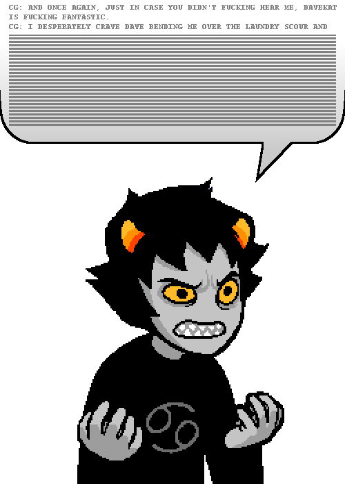 >>152066623I also saw some people in the new update that ship Karkat and Dirk in the meat timeline. Its really interesting. Dirk just doesn't like trolls that way, he mostly tolerates them. How would that even work...