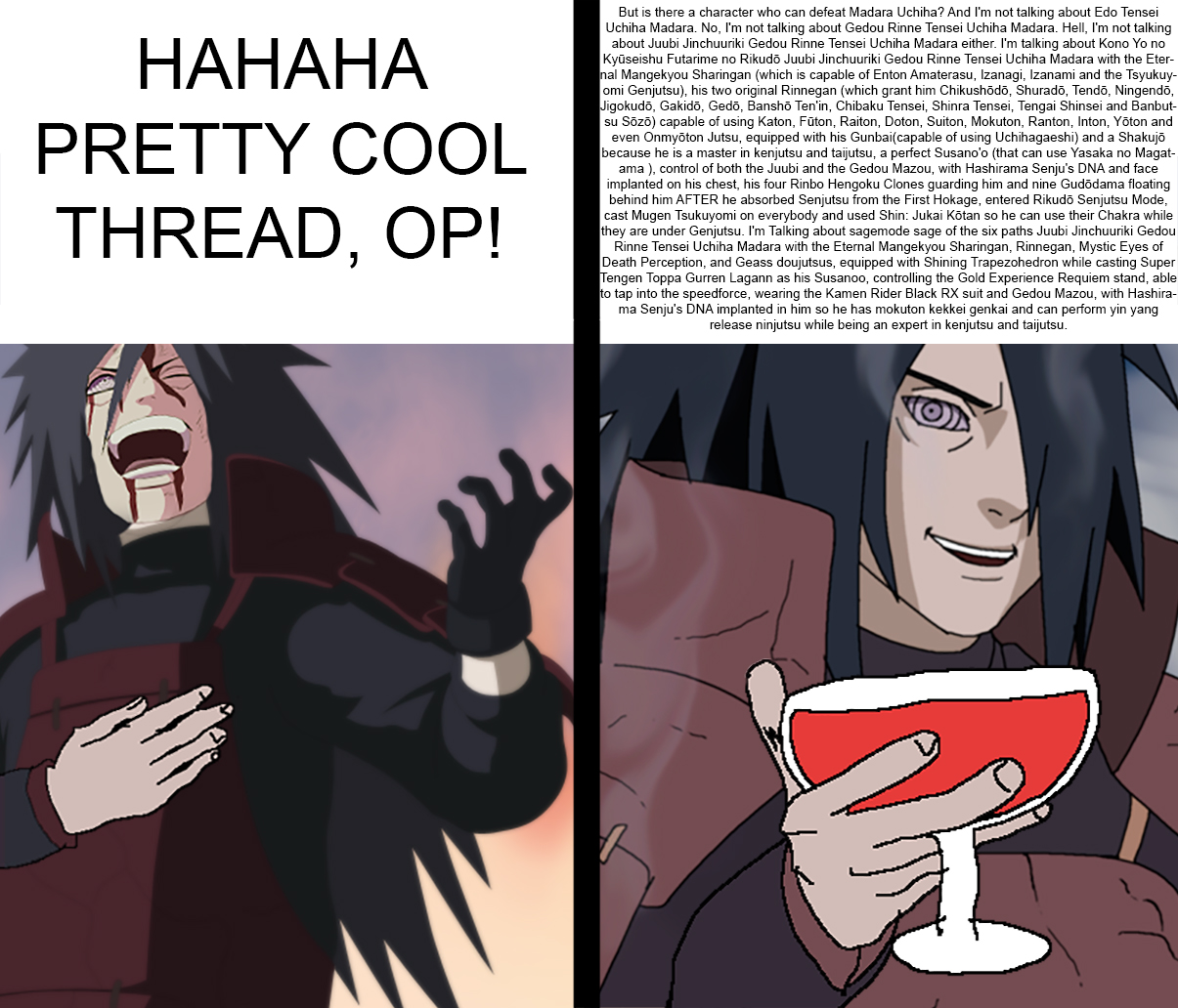 >>152091344>The curse takes effect instantly, even someone with infinite speed as Reimu was unable to react to it because the curse is faster than InfinityPost the curse having explicit statements of cardinals, or otherwise it is nonsense>Why didn't she use her layered conceptual beyond non non existence adaptation to be able to regen the brain damage?So reimu adaptation working over time barely stopped brain damage? Also Yogiri is literally sub virus level, whose powers don't work outside of his verse, and his cosmology is held down by literal believes. So of course wall level Reimu would beat a guy who jobs to literal covid.