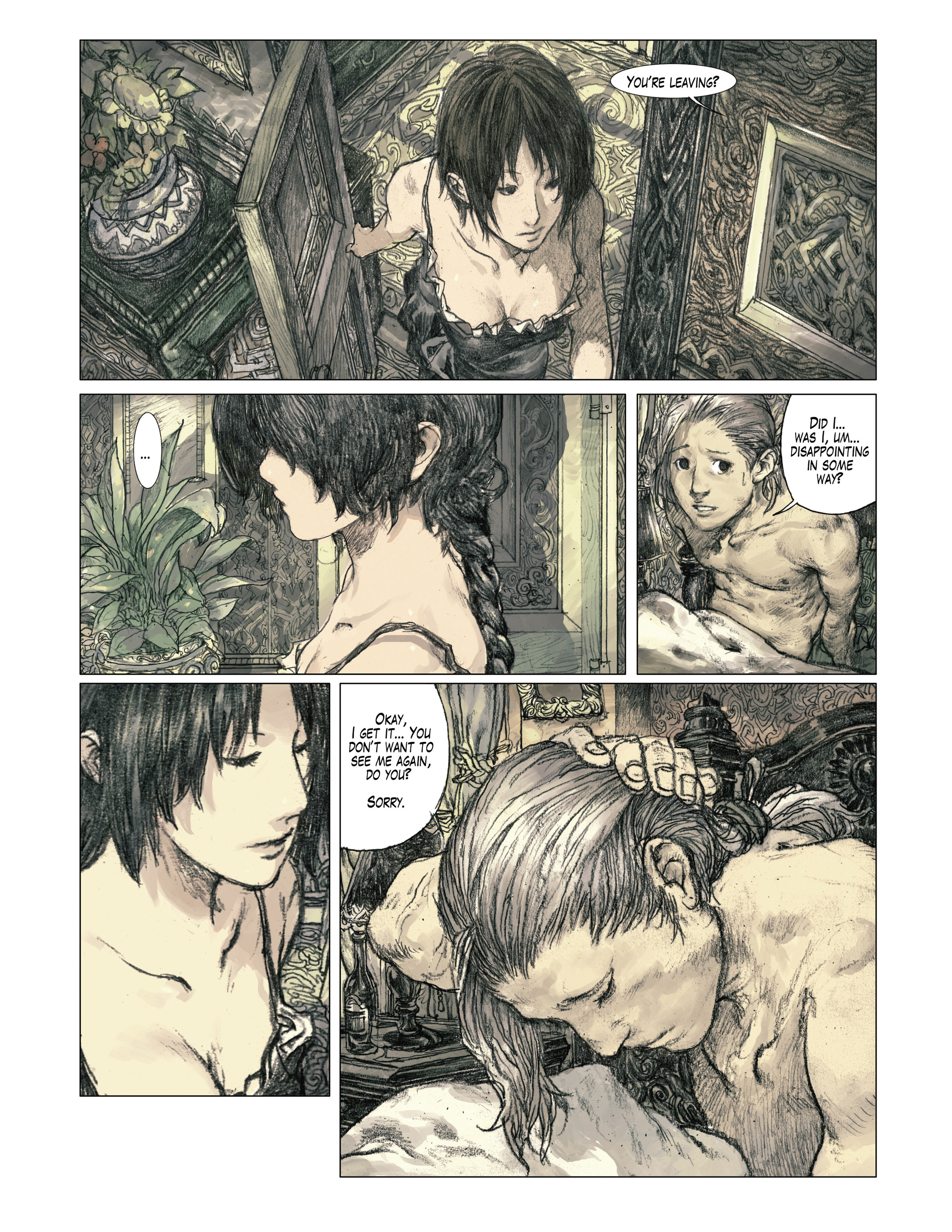 >>152101367The French has:>Je t'ai decue? Tu ne veux pas me repondre? Bon, ben alors... merci.>Oui, jamais, pas du tout, desolee.>Et "Merci", c'est vraiment la derniere chose a dire a une femme apres l'amour. Deepl translation:>Have I disappointed you? You don't want to answer me? Well, then... thank you.>Yes, never, not at all, sorry.>And ‘thank you’ is really the last thing you should say to a woman after making love.Is French "Merci" used to mean sorry here?