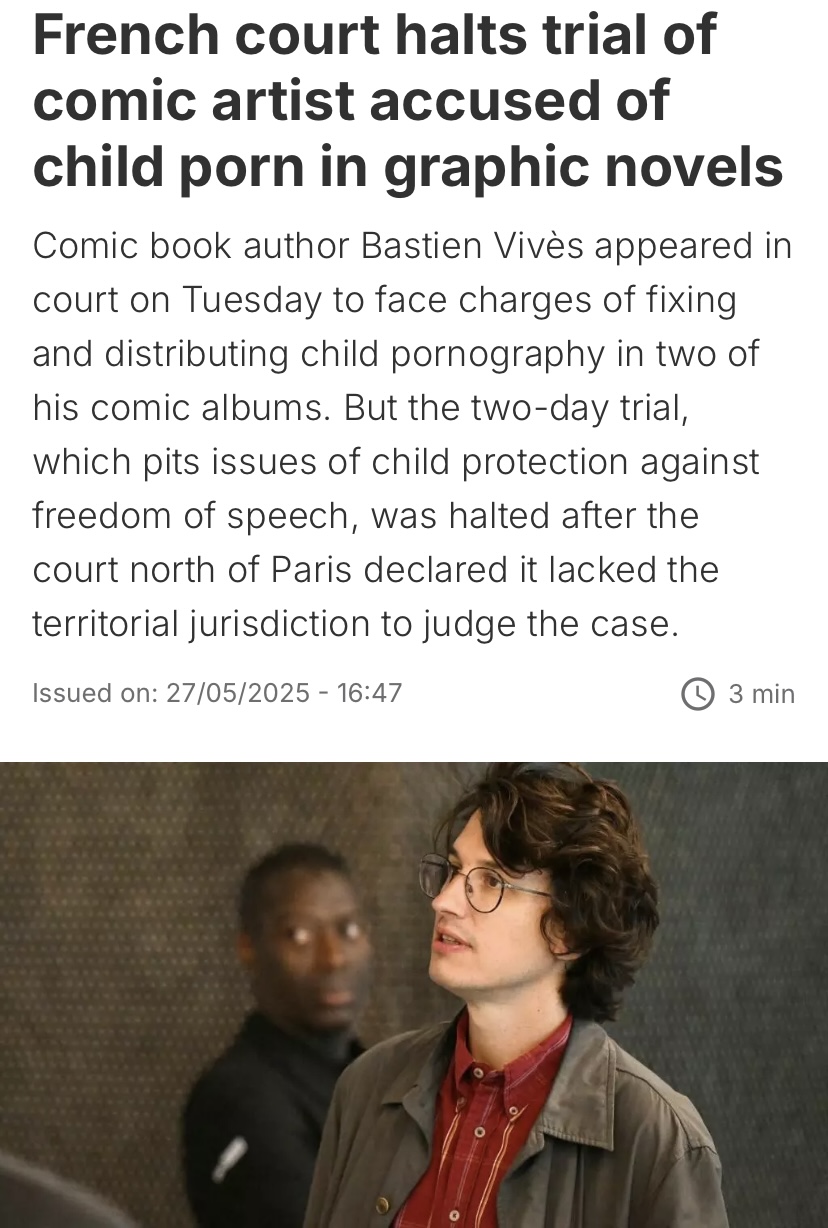 >>152101956Prosecutors declined, now it can only come back if it's cited as part of a new case.>>152100223Lol no, he's going strong>>152100542Kinda half and half. He's famous for both greatly sensitive and understated comics like Polina, popular adventure like Lastman and trollish provocative stuff like what 4chan knows him for. Ain't a wunderkind for nothing, he's one of the major french comic authors of the last 20 years and acts like it.