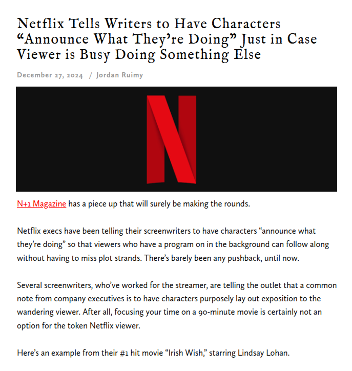 >>152098960I mean this isn't exactly new. Network TV shows in the 20th century were full of this kind of thing, exposition for people who came in after the commercial ("You WHAT?!" "Let me get this straight..."), redundant dialogue for people who were doing something else while watching, etc.What's interesting about Netflix is that they insist their shows be incredibly serialized (to encourage binge-watching), which used to be associated with "smart" TV and which Netflix has now associated with dumbed-down lowest-common-denominator TV.